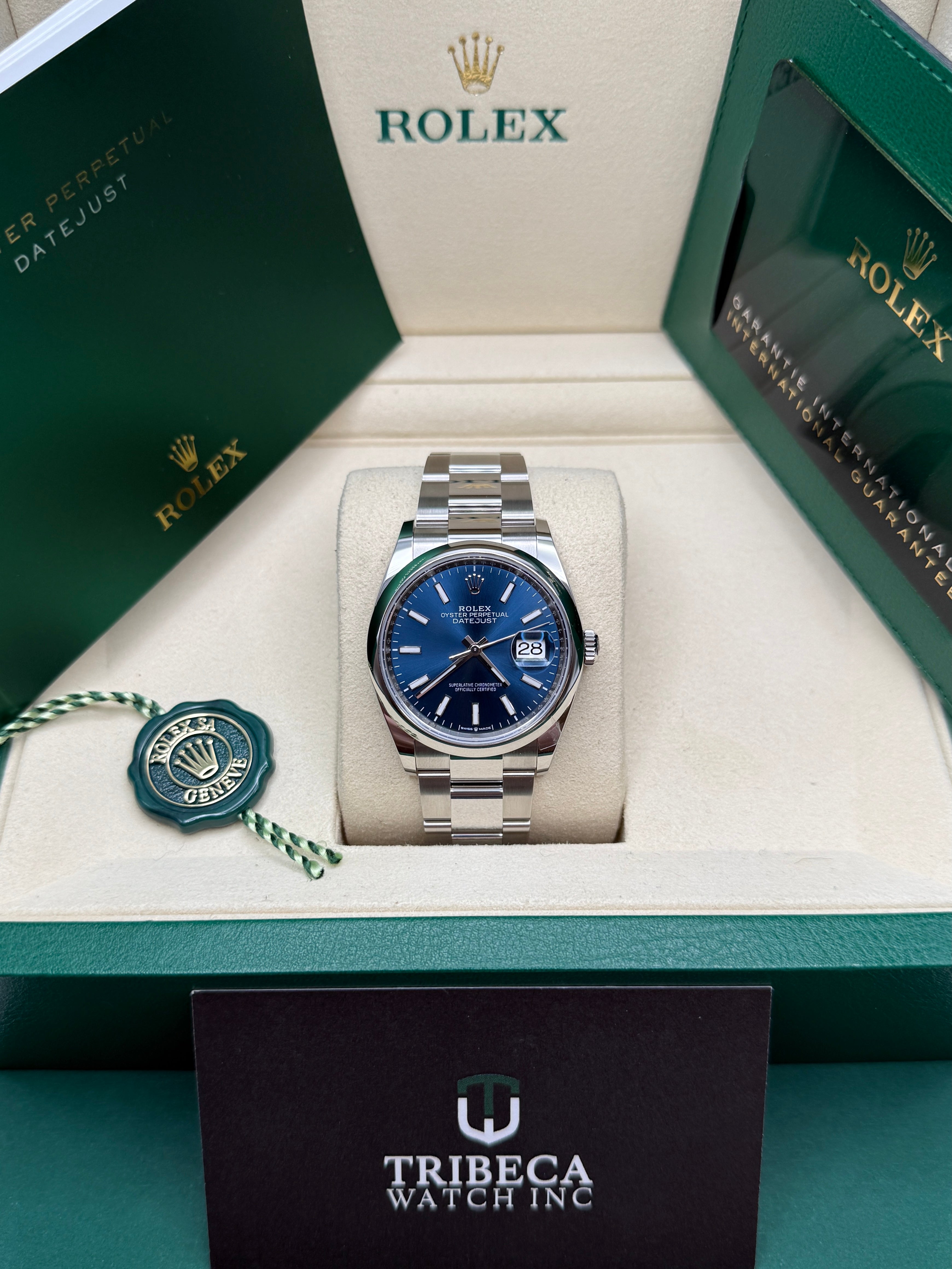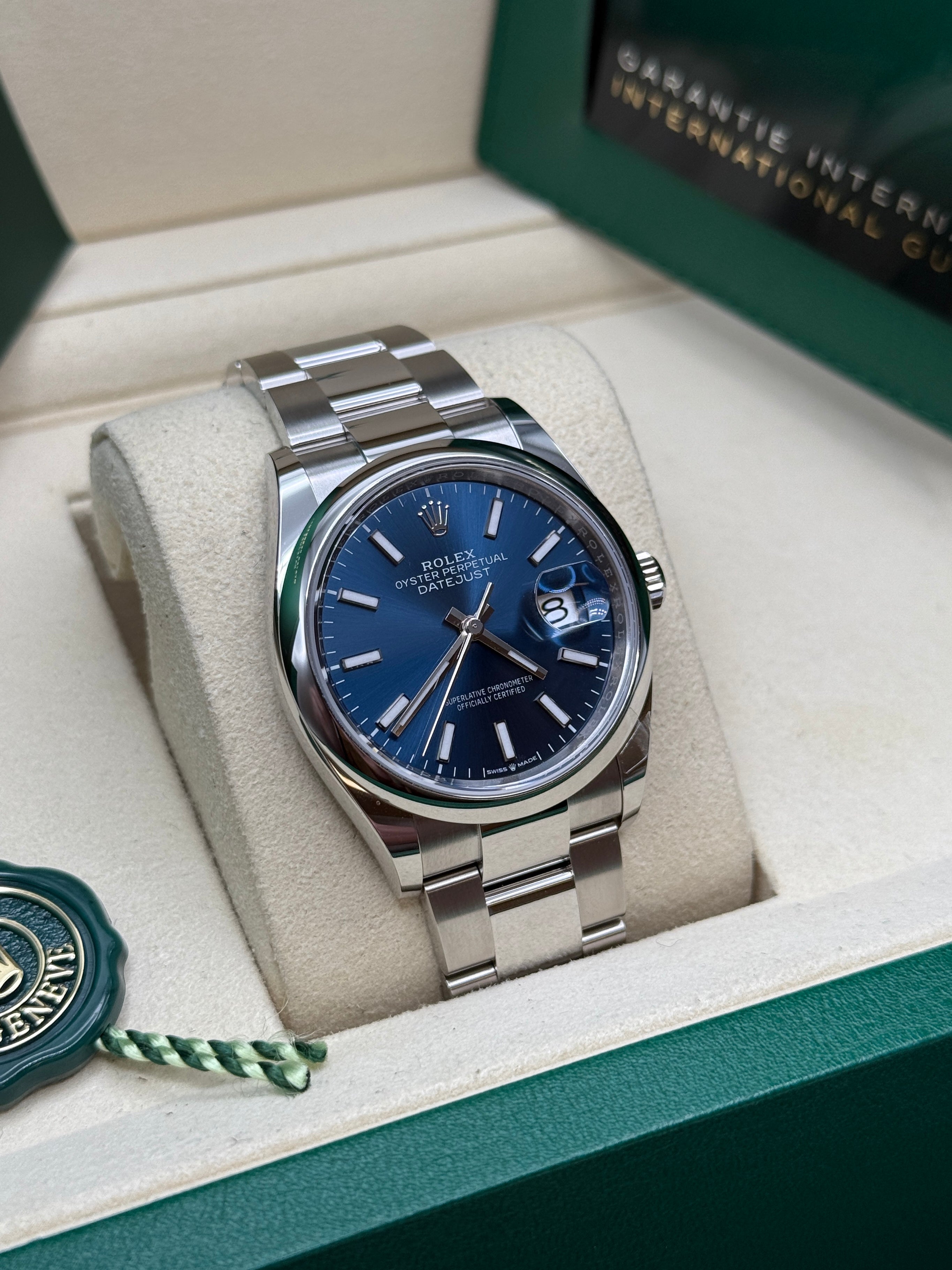 Rolex’s Datejust is the archetype of the classic watch thanks to functions and aesthetics that never go out of fashion. Launched in 1945, it was the first self-winding waterproof chronometer wristwatch to display the date in a window at 3 o’clock on the dial, and consolidated all the major innovations that Rolex had contributed to the modern wristwatch until then. The Datejust has spanned eras while retaining the enduring aesthetic characteristics that make it so instantly recognizable. A paragon of robustness and elegance, the Oyster case of the Datejust 36 is guaranteed waterproof to a depth of 100 meters (330 feet) and is equipped with calibre 3235, a movement entirely developed and manufactured by Rolex.