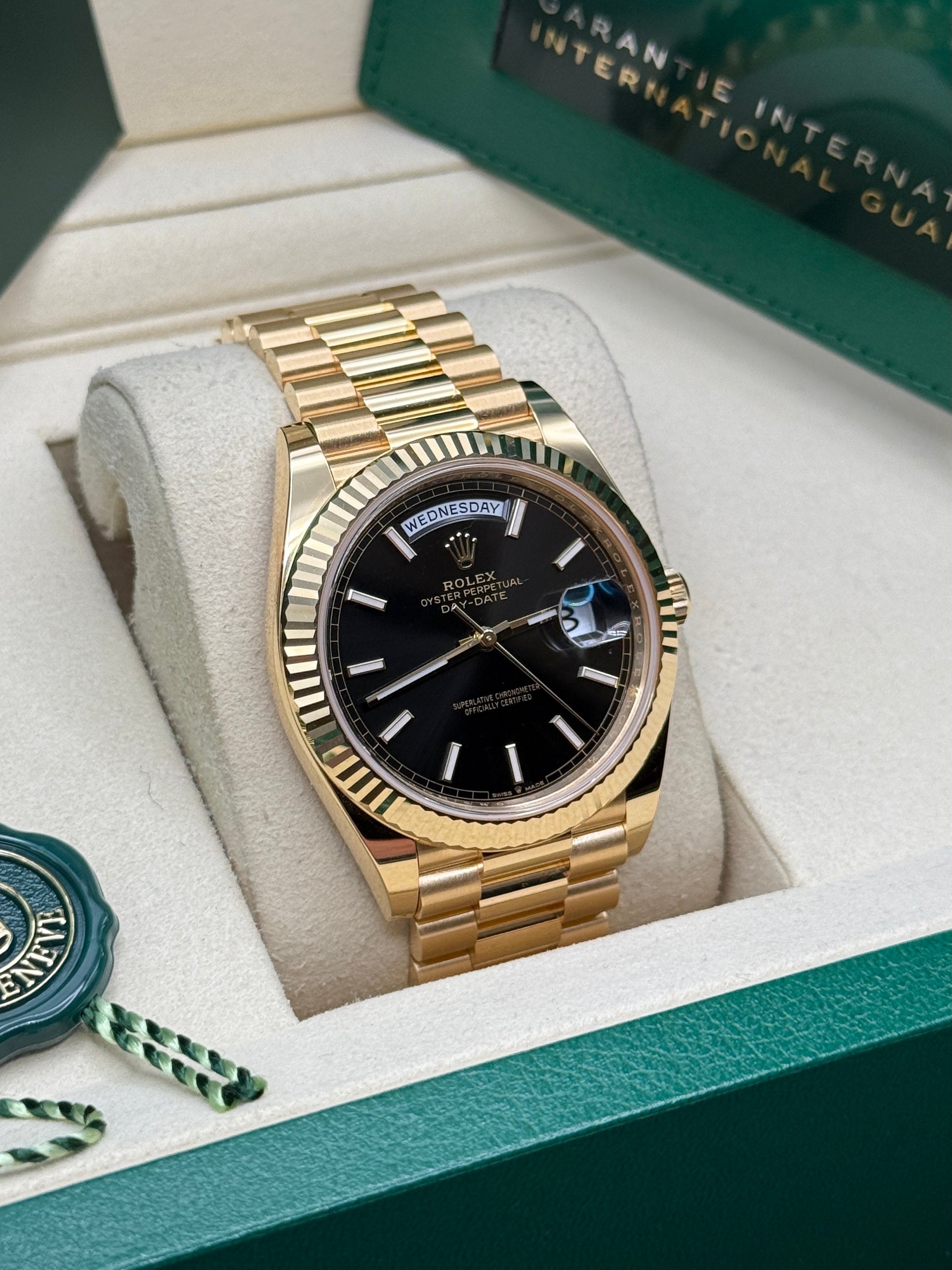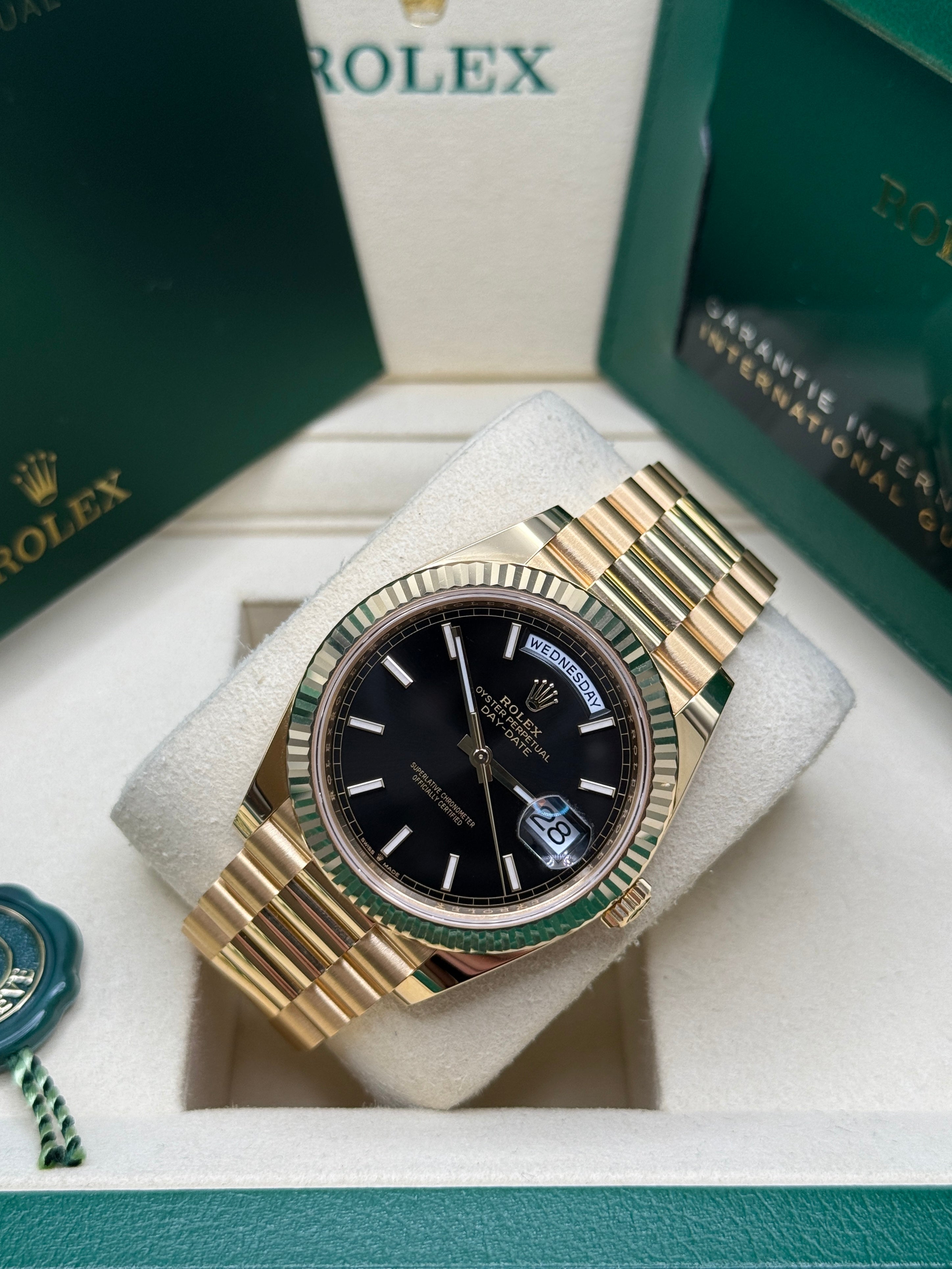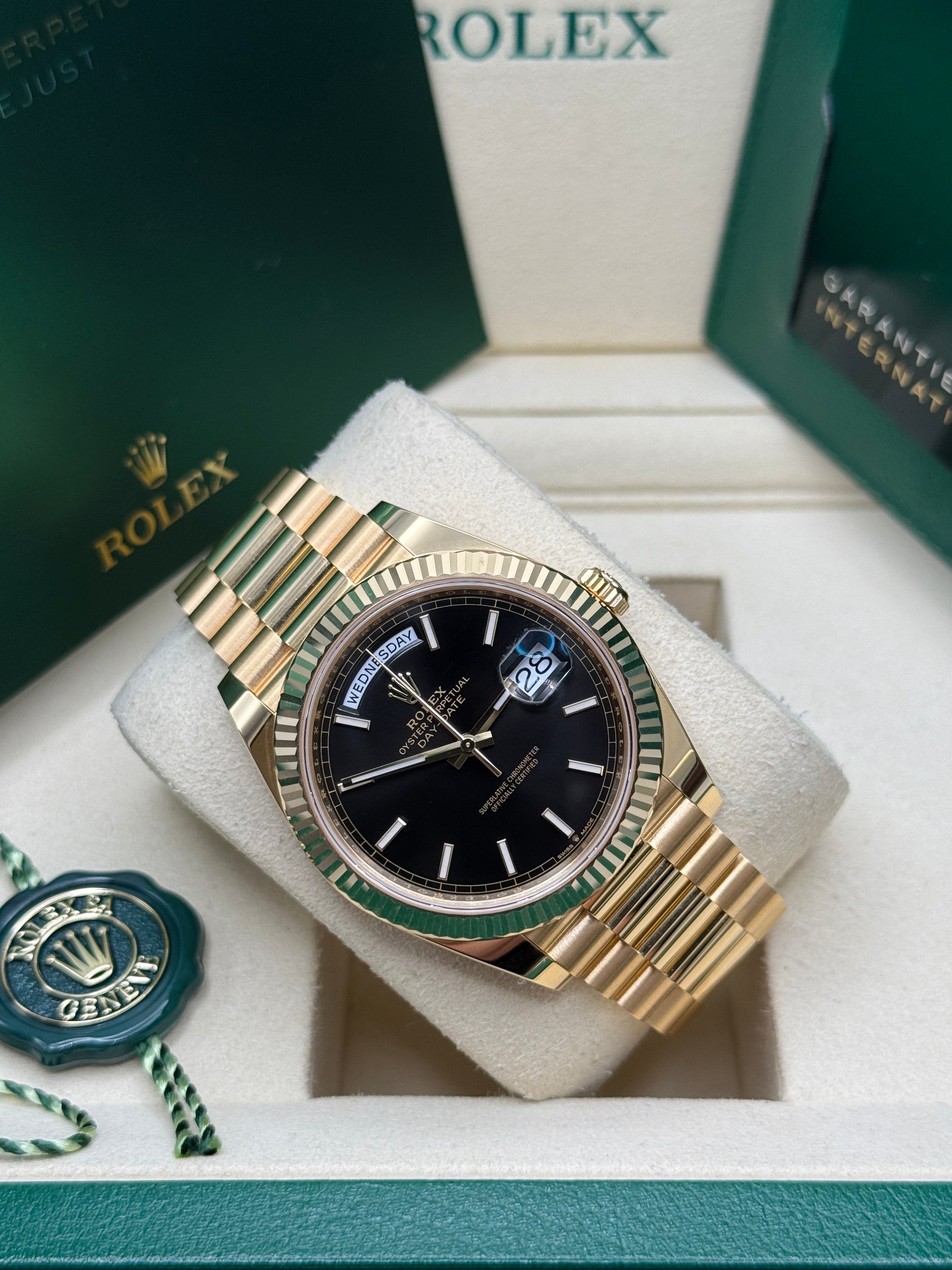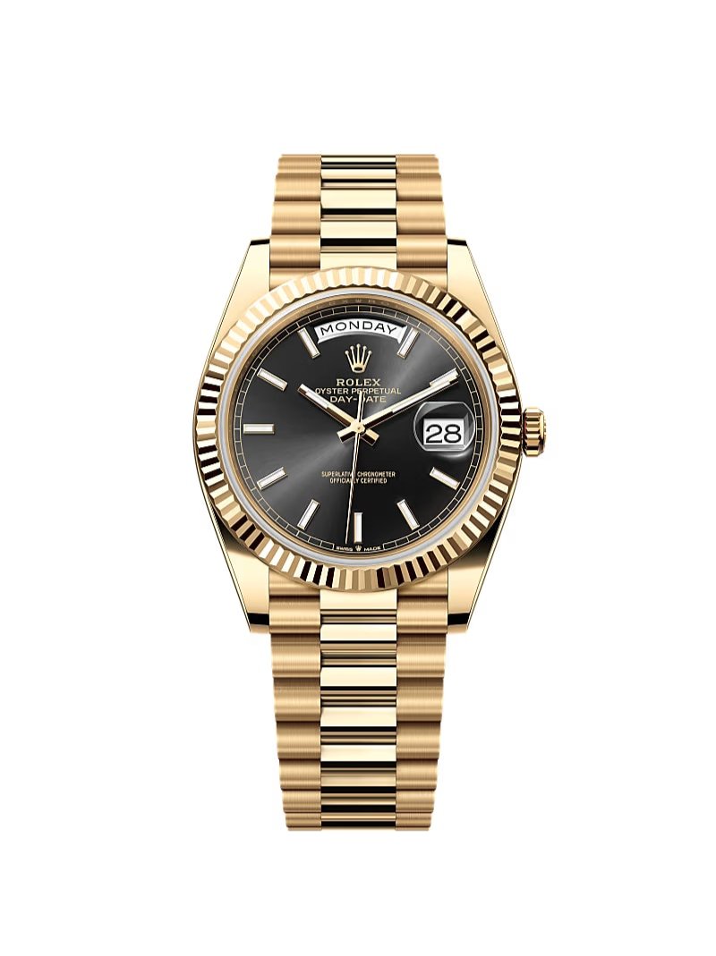 The Day-Date’s calendar displays the day of the week spelt out in full in an arc-shaped window at 12 o’clock in addition to the date in a separate window at 3 o’clock. This display relies on disc mechanisms; the day and date change simultaneously and instantaneously. The indication of the day of the week is available in a choice of 26 languages. The Day-Date is also equipped with a mechanism allowing rapid adjustment of the day and the date using the winding crown. The Day-Date’s Oyster case, 36 or 40 mm in diameter and guaranteed waterproof to a depth of 100 metres (330 feet), is a paragon of robustness and elegance. The Day-Date 36 and Day-Date 40 are equipped with calibre 3255, a self-winding mechanical movement entirely developed and manufactured by Rolex.