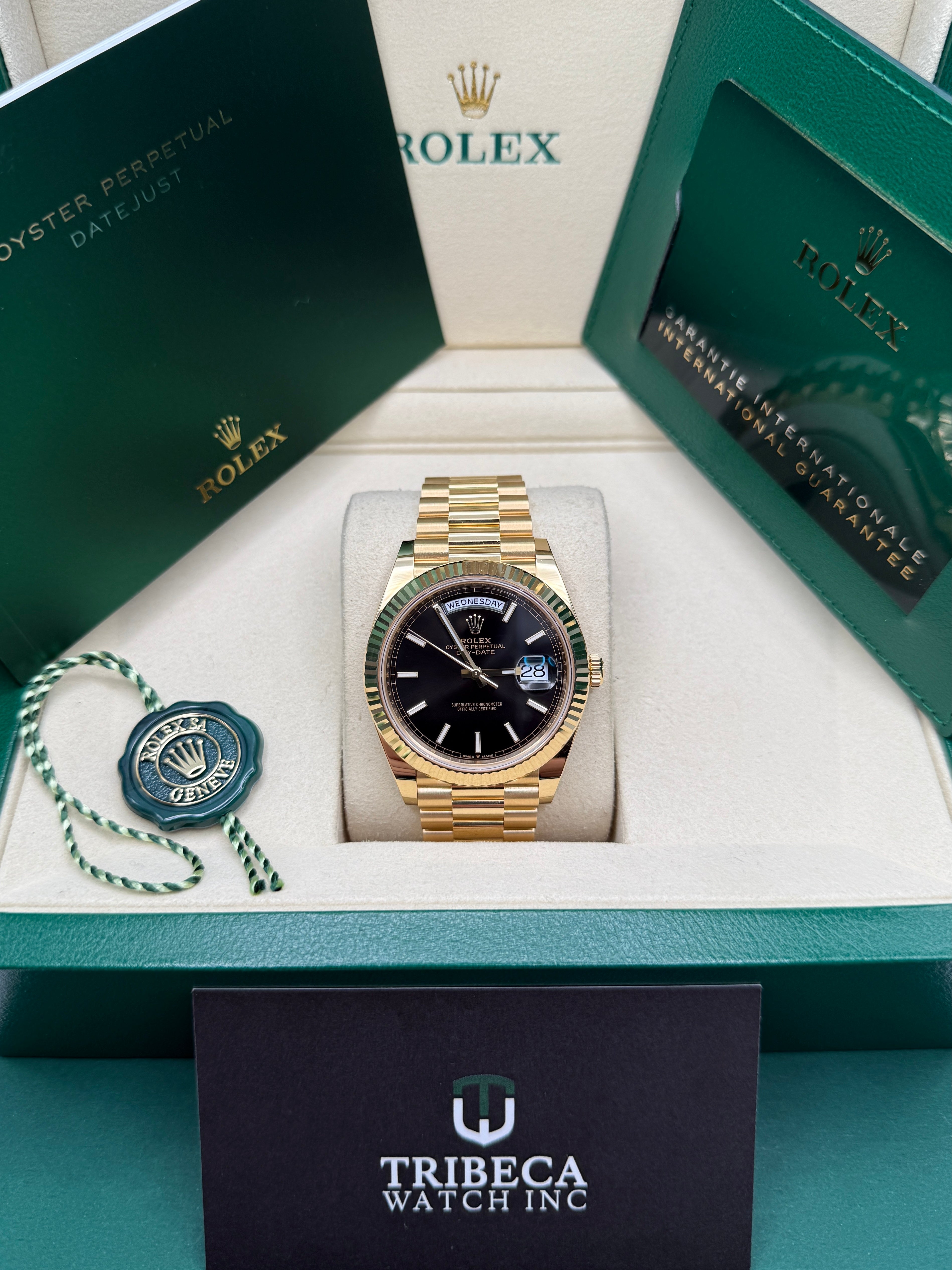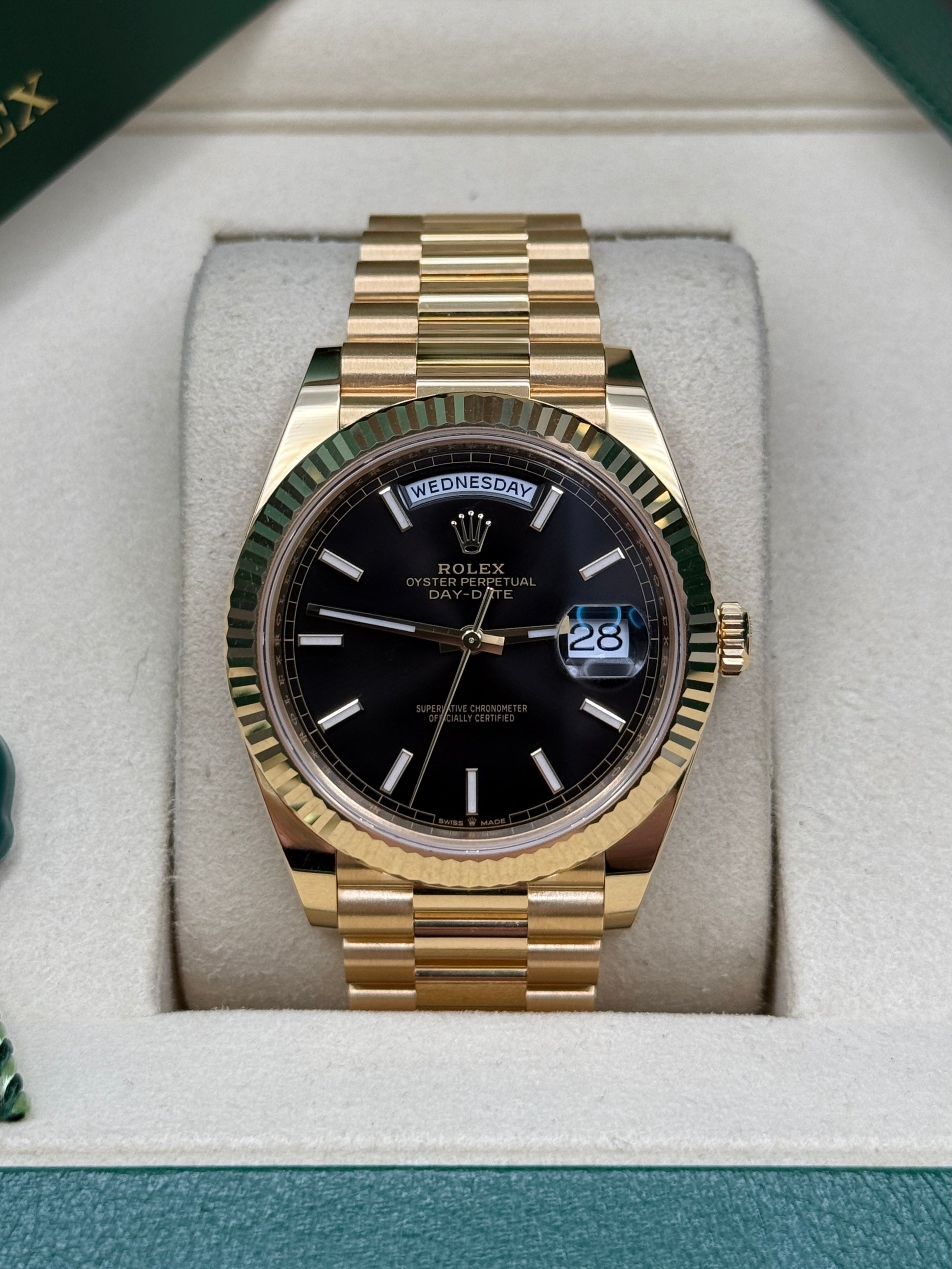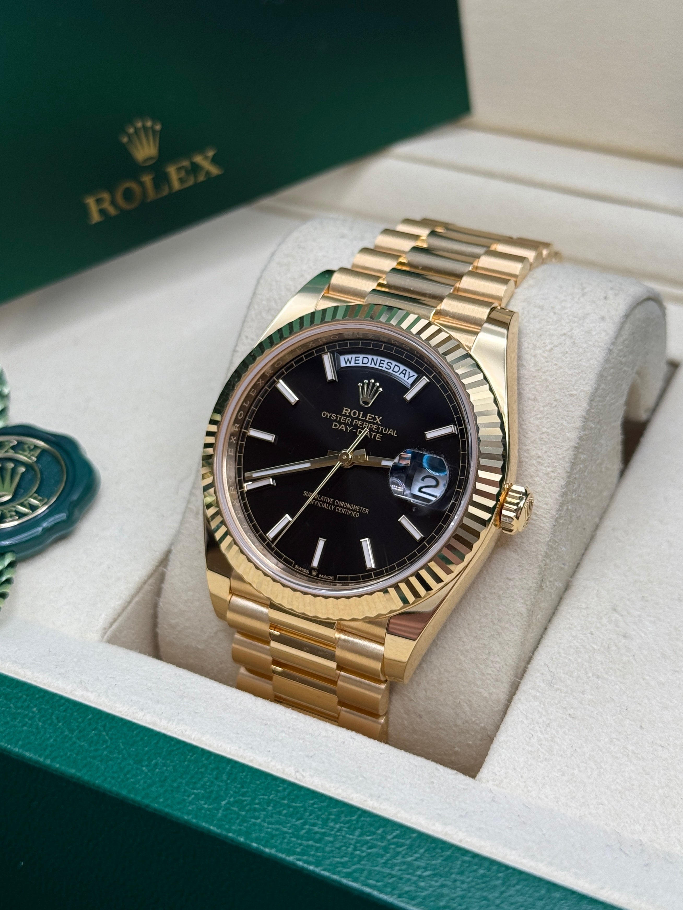 The Day-Date’s calendar displays the day of the week spelt out in full in an arc-shaped window at 12 o’clock in addition to the date in a separate window at 3 o’clock. This display relies on disc mechanisms; the day and date change simultaneously and instantaneously. The indication of the day of the week is available in a choice of 26 languages. The Day-Date is also equipped with a mechanism allowing rapid adjustment of the day and the date using the winding crown. The Day-Date’s Oyster case, 36 or 40 mm in diameter and guaranteed waterproof to a depth of 100 metres (330 feet), is a paragon of robustness and elegance. The Day-Date 36 and Day-Date 40 are equipped with calibre 3255, a self-winding mechanical movement entirely developed and manufactured by Rolex.