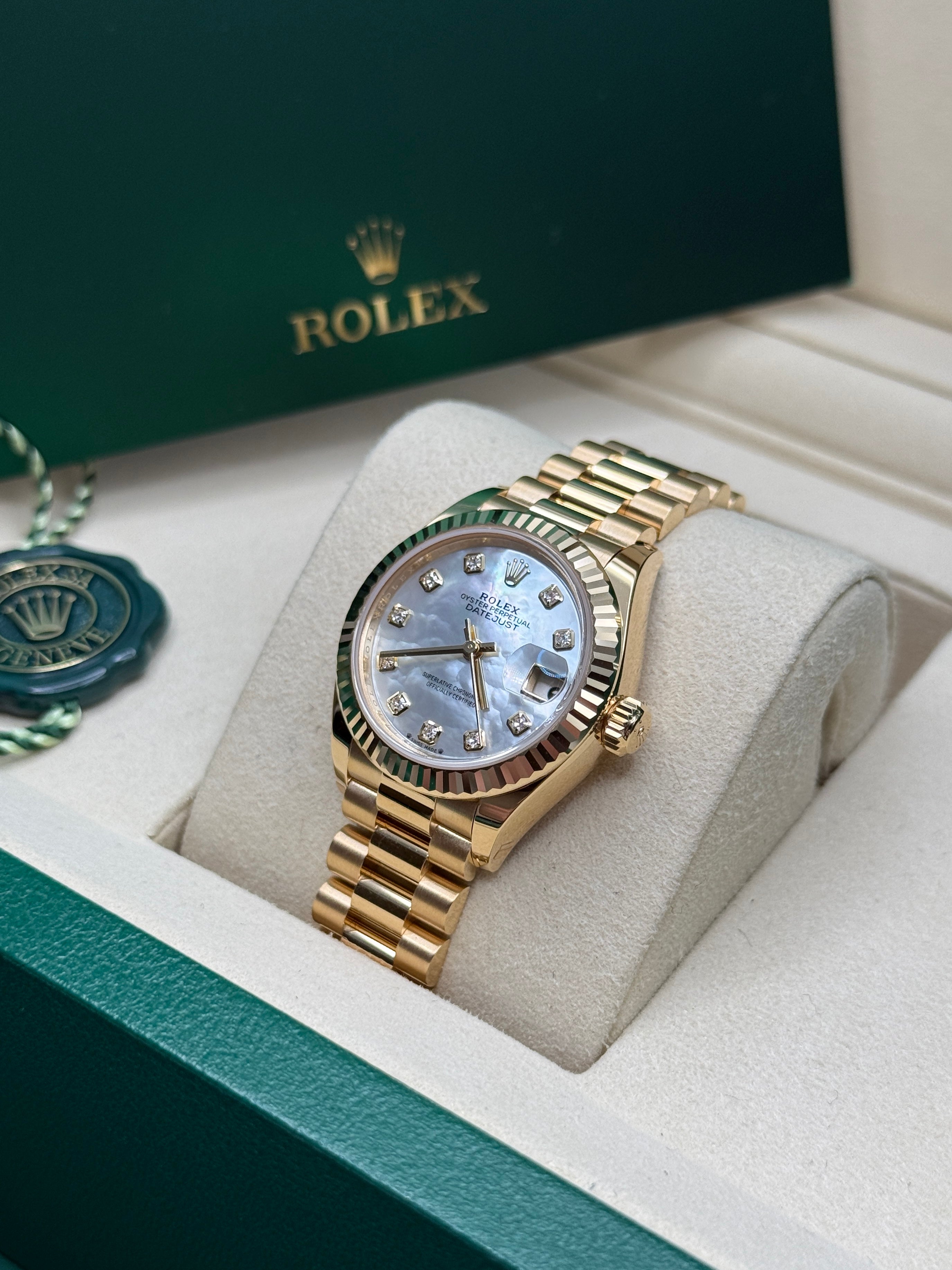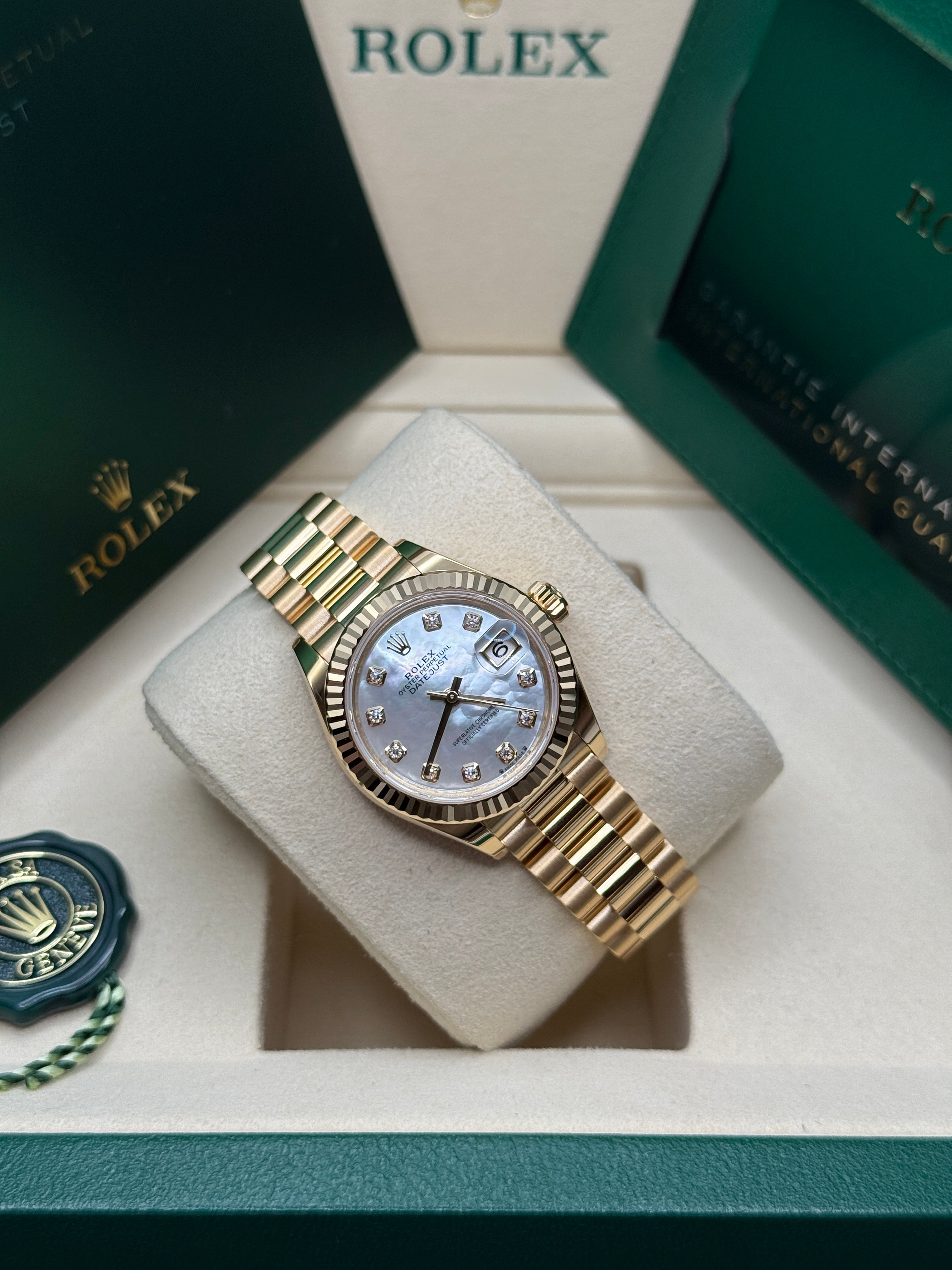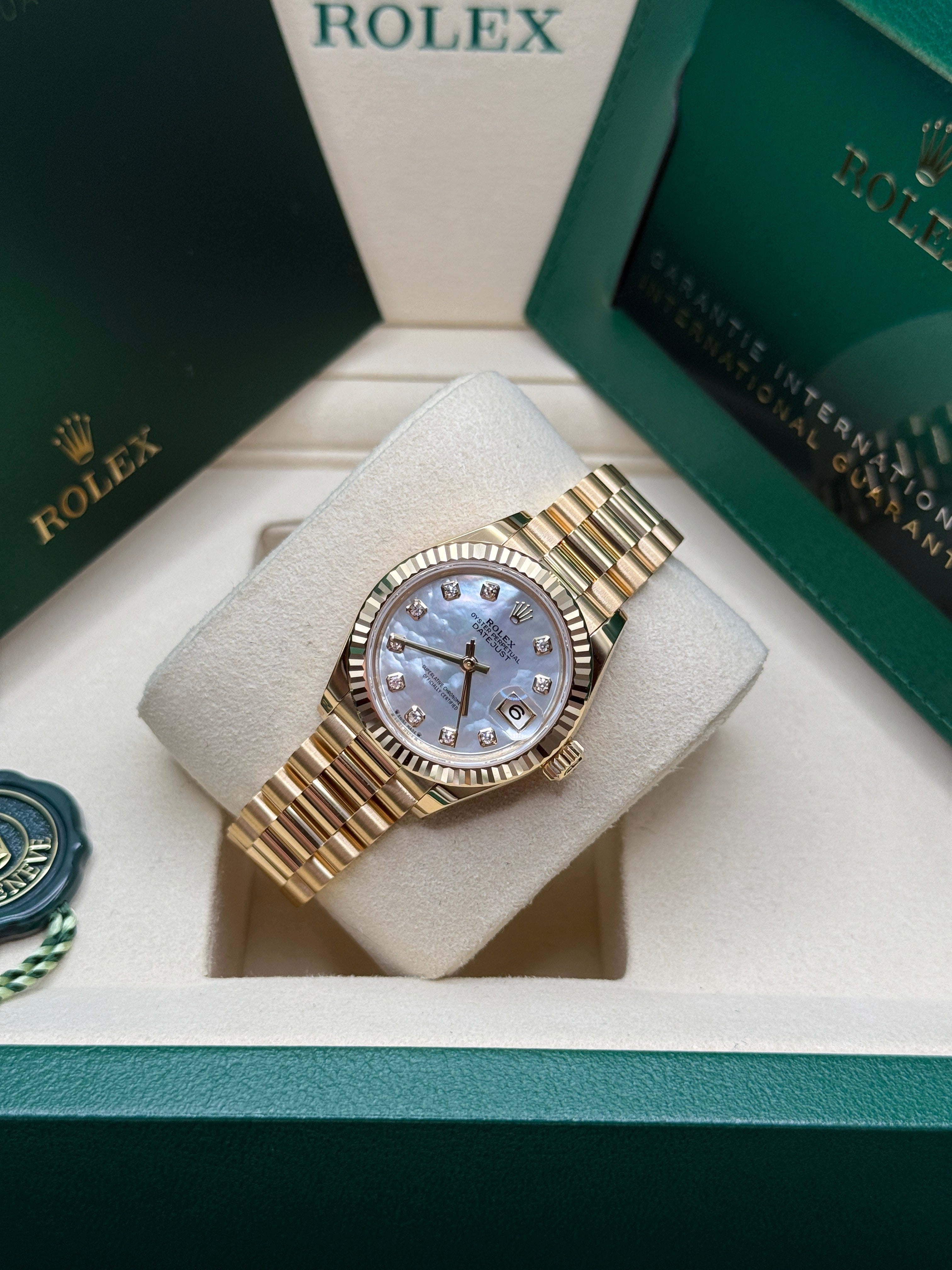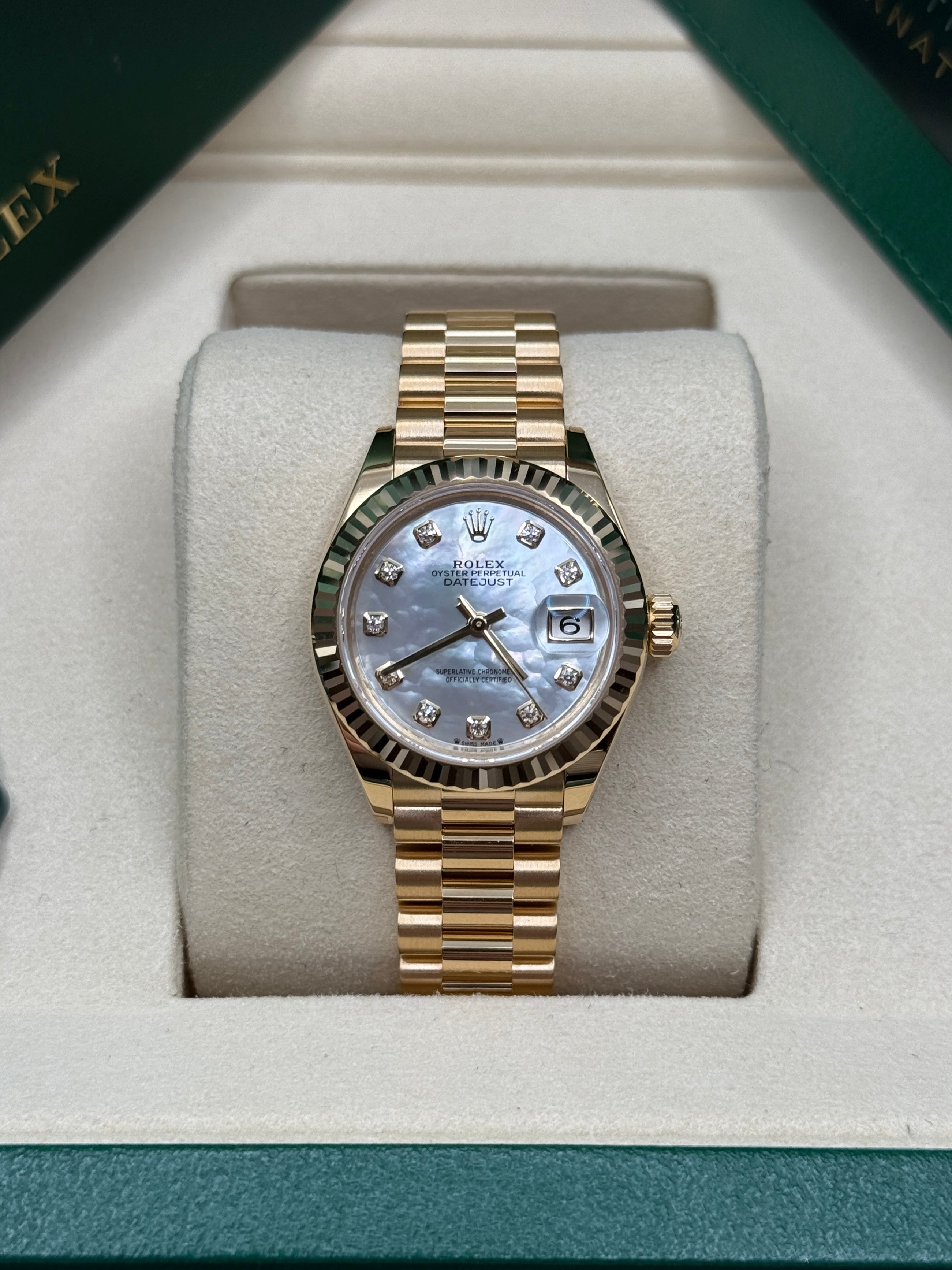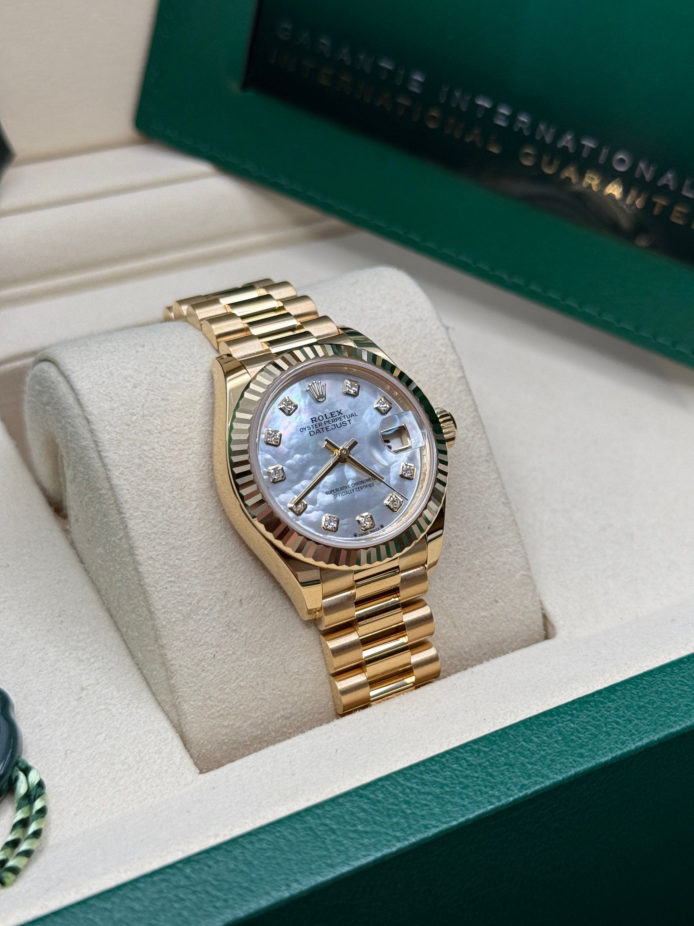Yellow Gold | President Bracelet | Mother of Pearl Diamond Dial | Fluted Bezel | 28.0mm