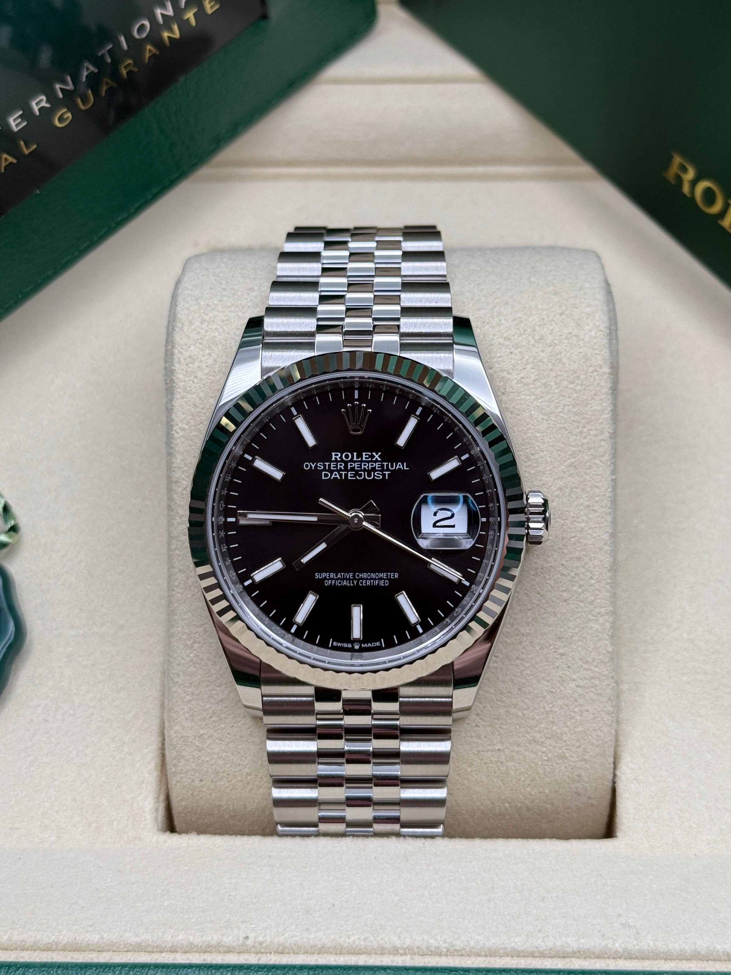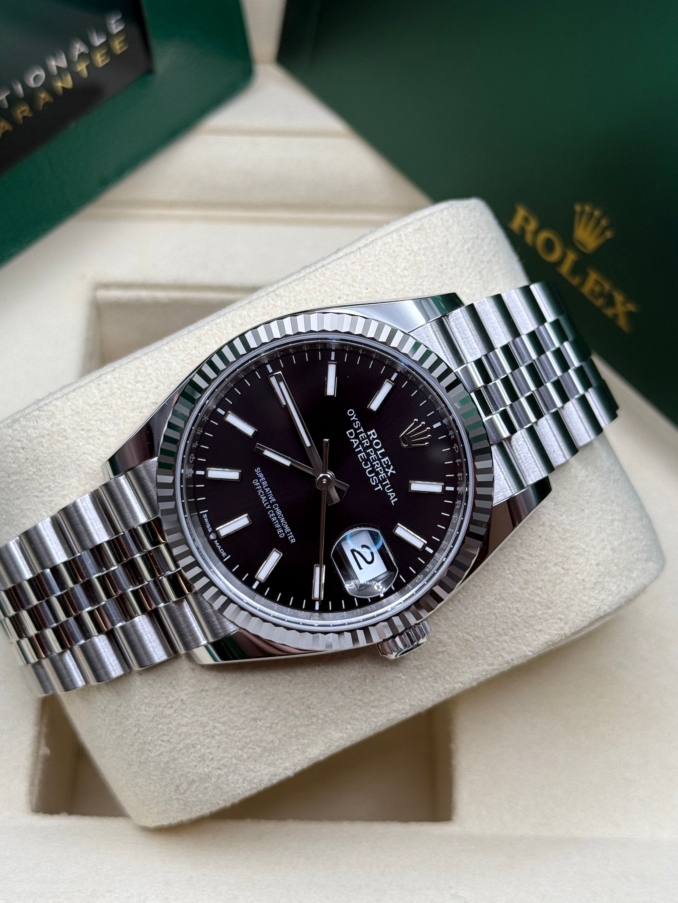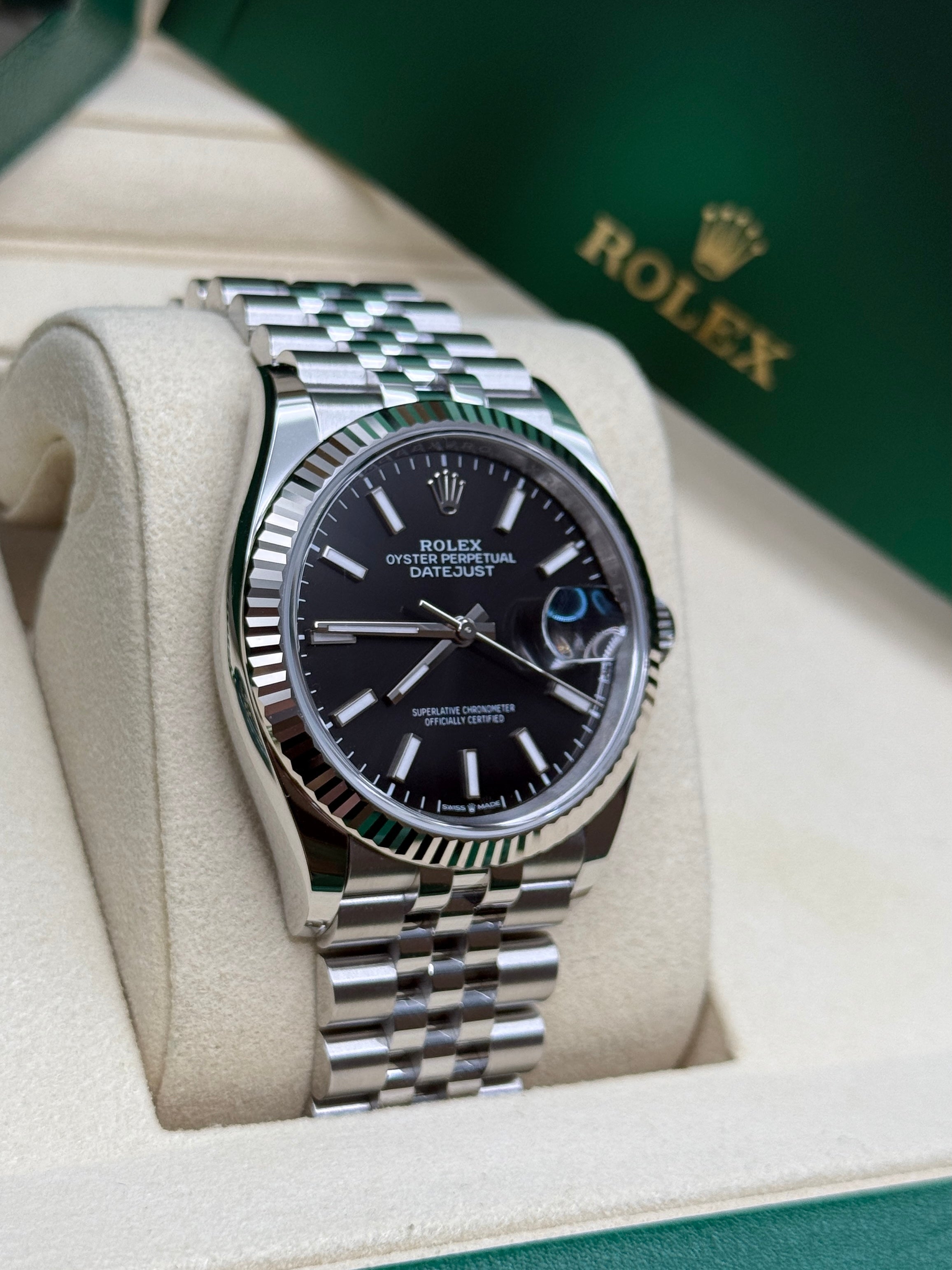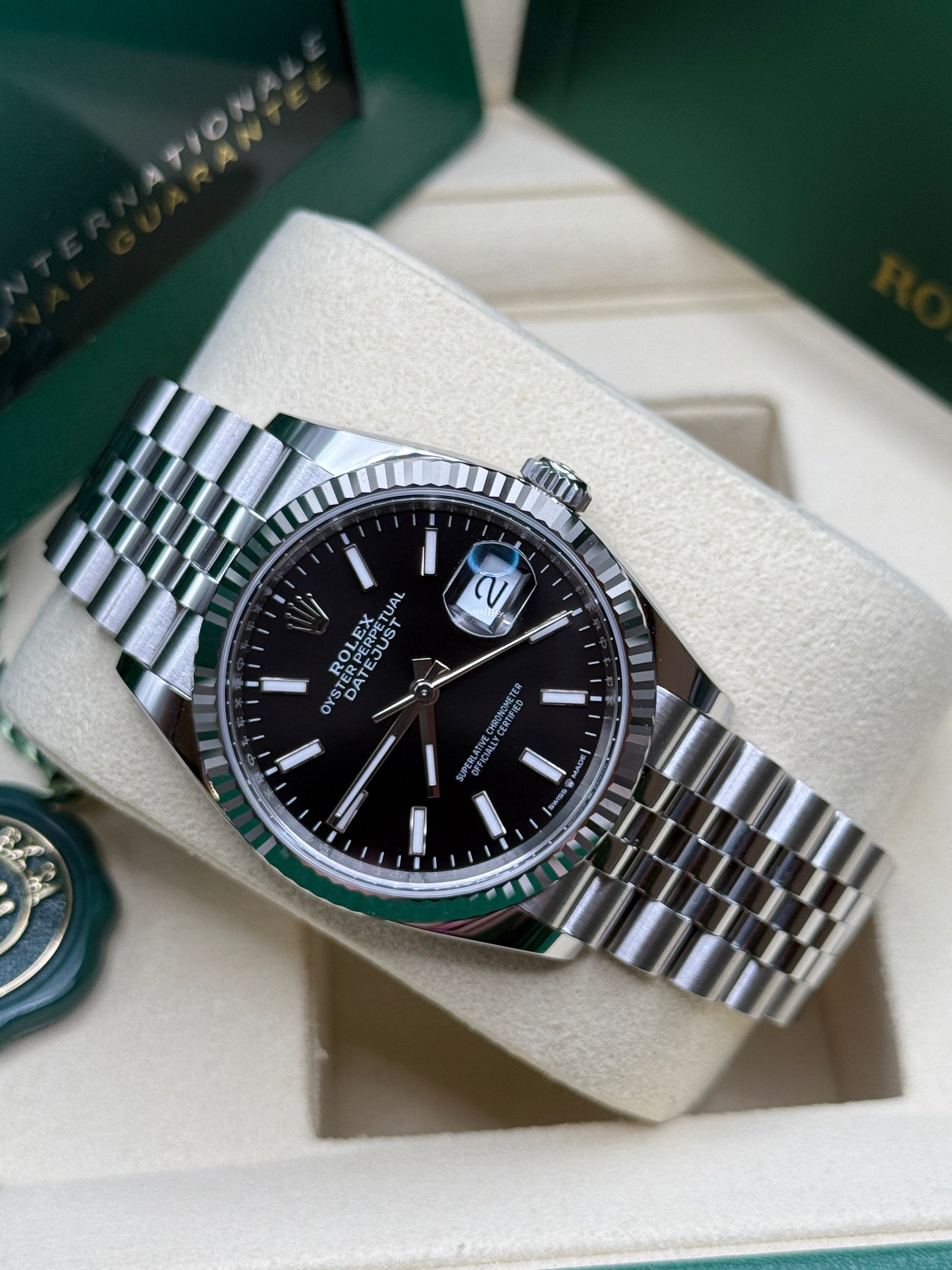 Rolex’s Datejust is the archetype of the classic watch thanks to functions and aesthetics that never go out of fashion. Launched in 1945, it was the first self-winding waterproof chronometer wristwatch to display the date in a window at 3 o’clock on the dial, and consolidated all the major innovations that Rolex had contributed to the modern wristwatch until then. The Datejust has spanned eras while retaining the enduring aesthetic characteristics that make it so instantly recognizable. A paragon of robustness and elegance, the Oyster case of the Datejust 36 is guaranteed waterproof to a depth of 100 meters (330 feet) and is equipped with calibre 3235, a movement entirely developed and manufactured by Rolex.