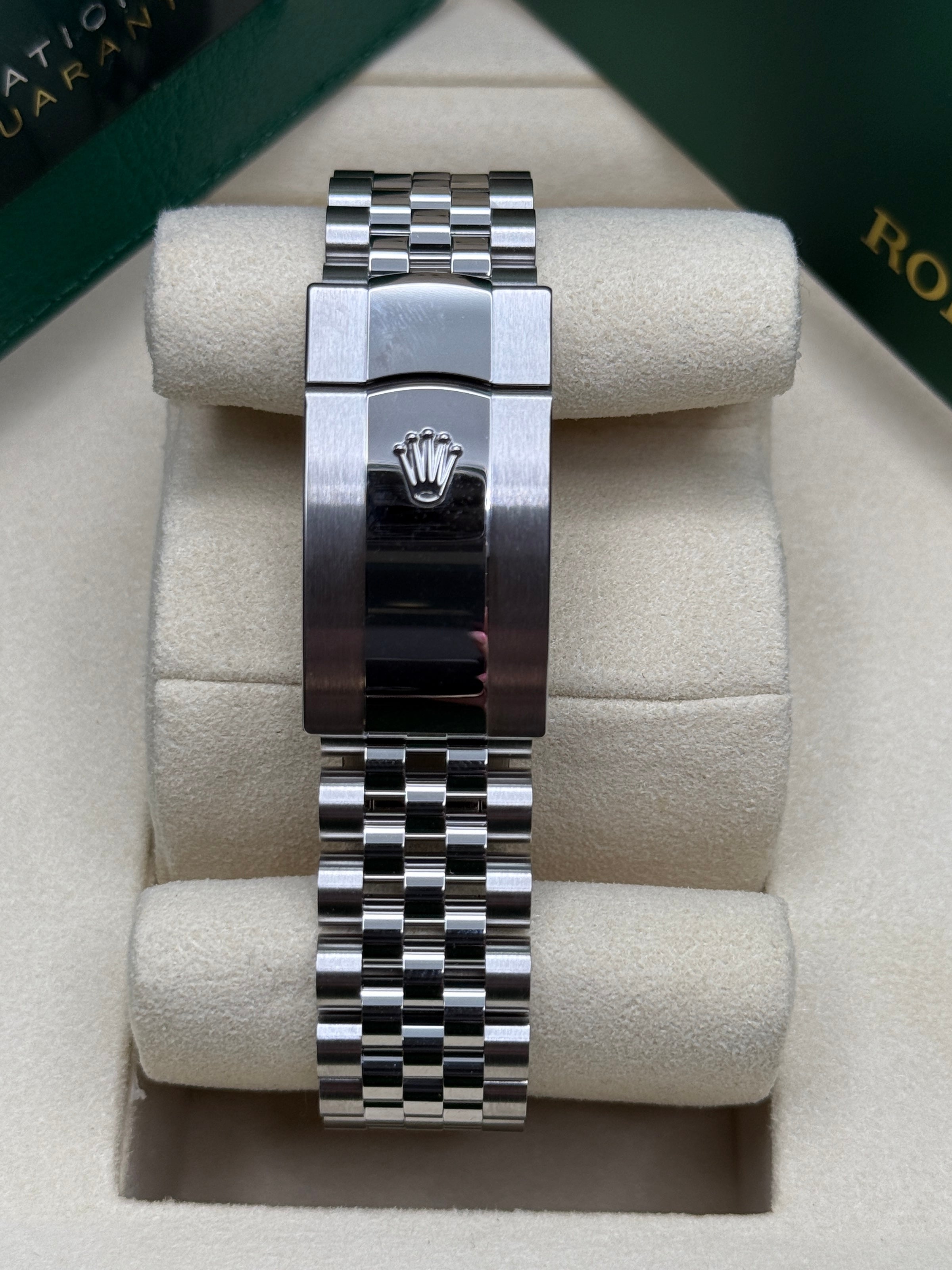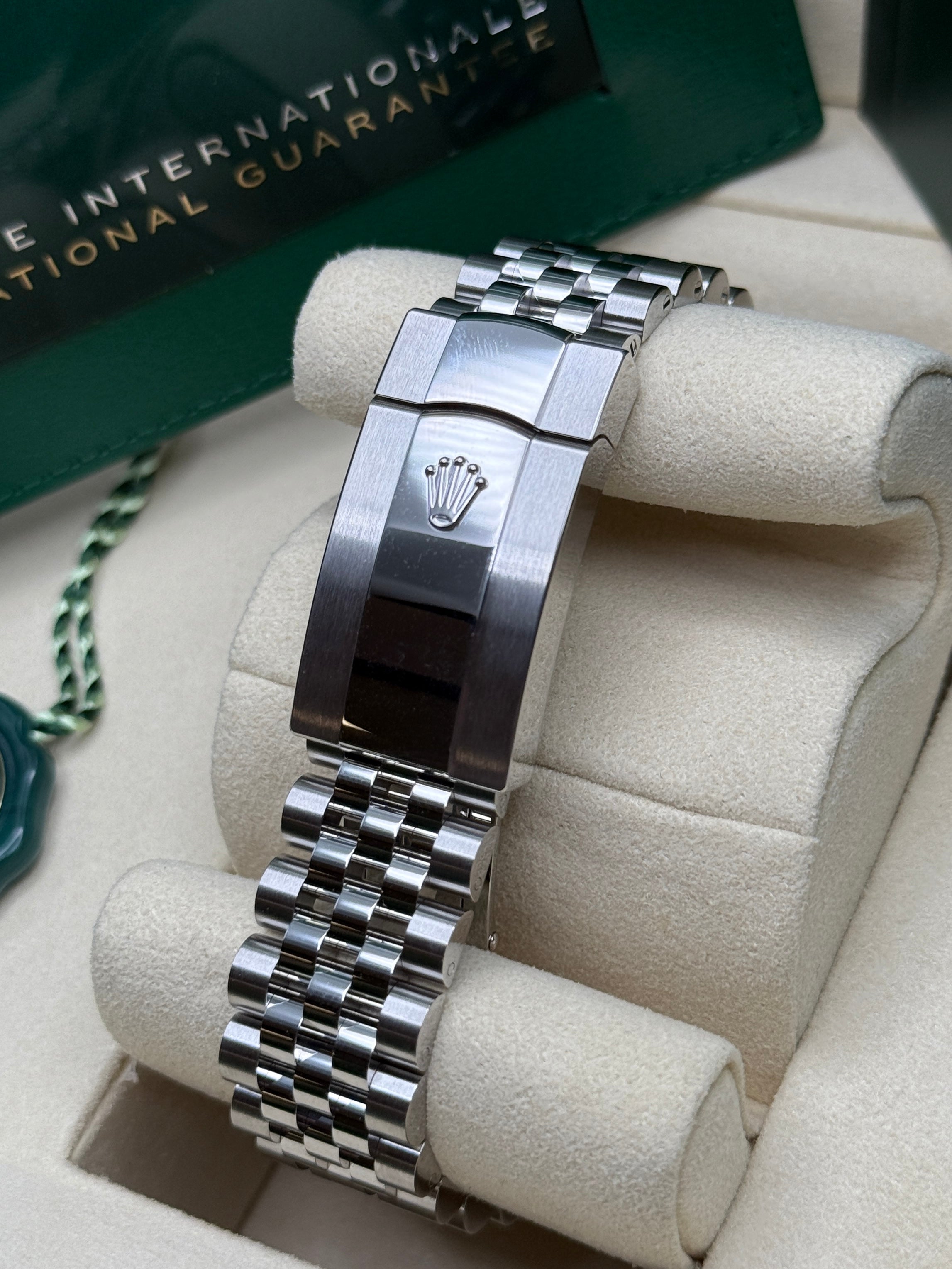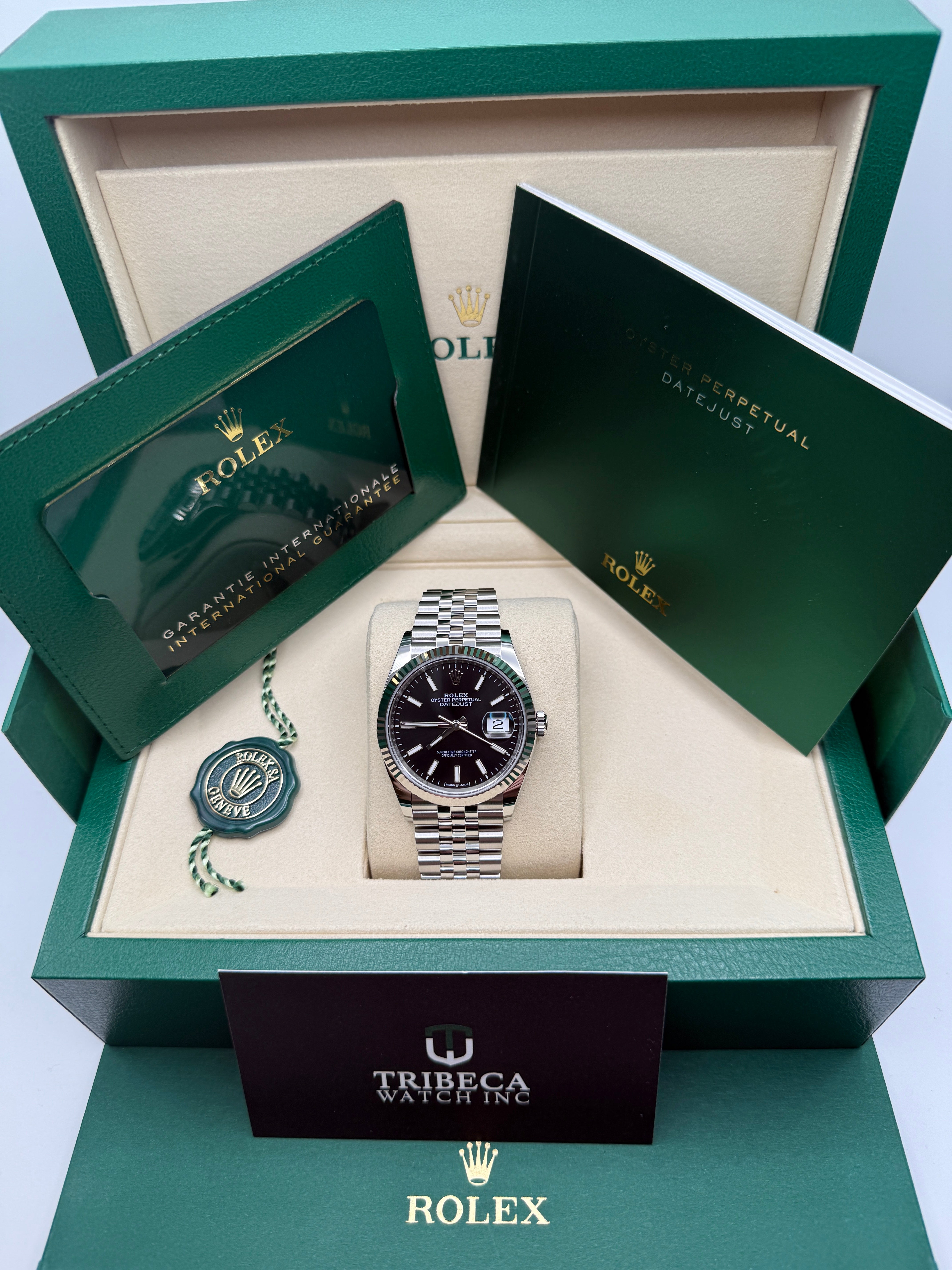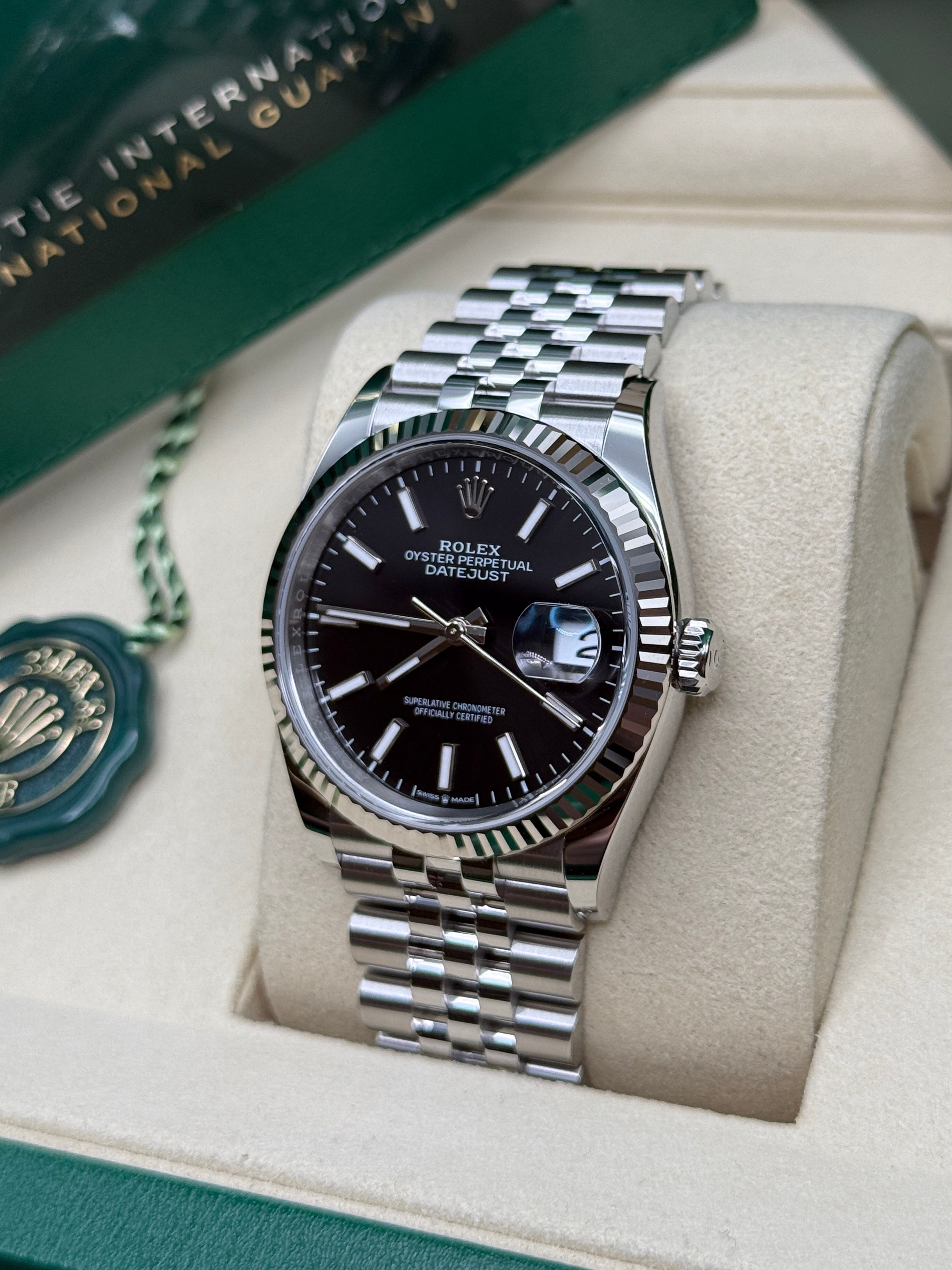 Rolex’s Datejust is the archetype of the classic watch thanks to functions and aesthetics that never go out of fashion. Launched in 1945, it was the first self-winding waterproof chronometer wristwatch to display the date in a window at 3 o’clock on the dial, and consolidated all the major innovations that Rolex had contributed to the modern wristwatch until then. The Datejust has spanned eras while retaining the enduring aesthetic characteristics that make it so instantly recognizable. A paragon of robustness and elegance, the Oyster case of the Datejust 36 is guaranteed waterproof to a depth of 100 meters (330 feet) and is equipped with calibre 3235, a movement entirely developed and manufactured by Rolex.