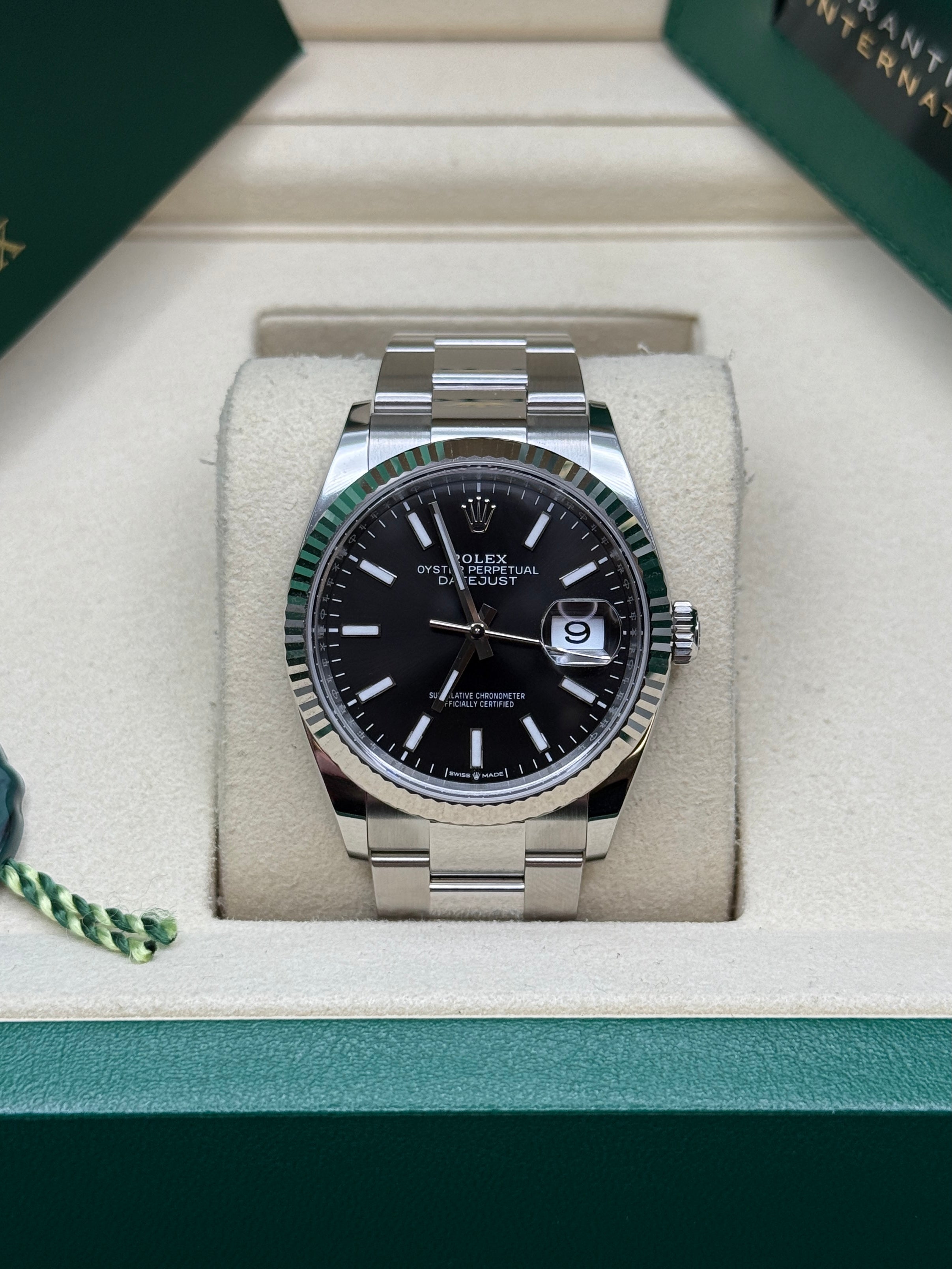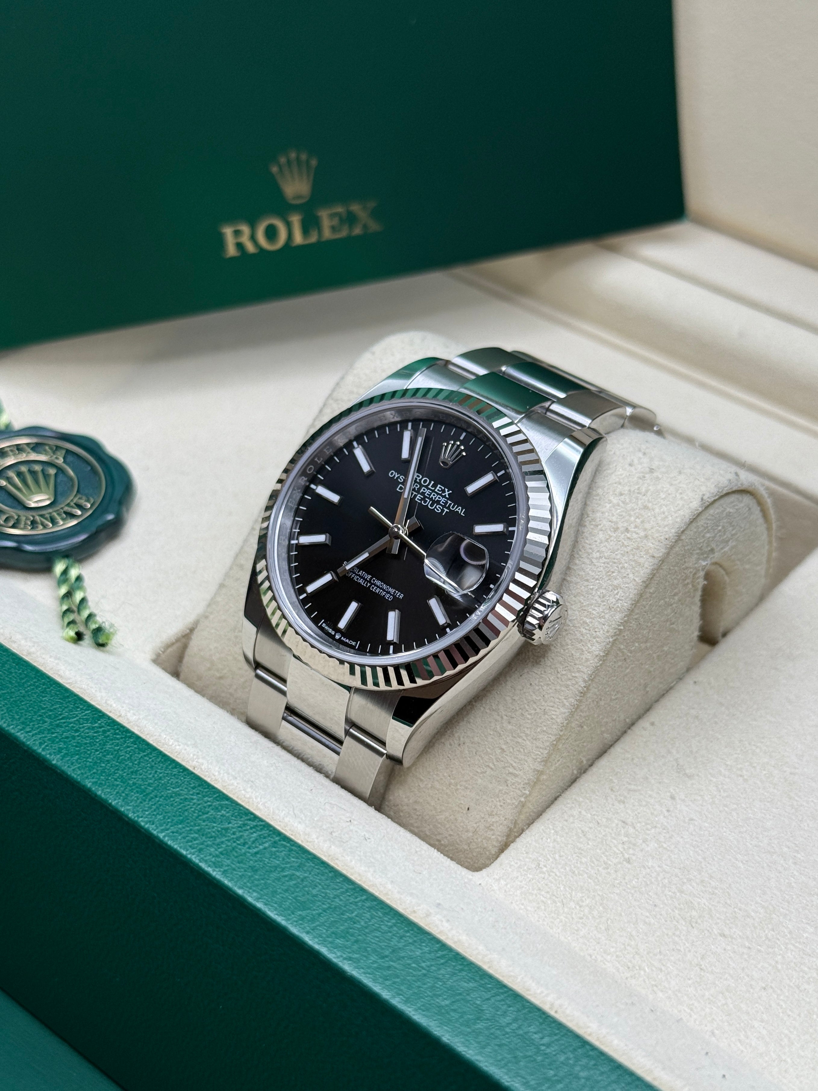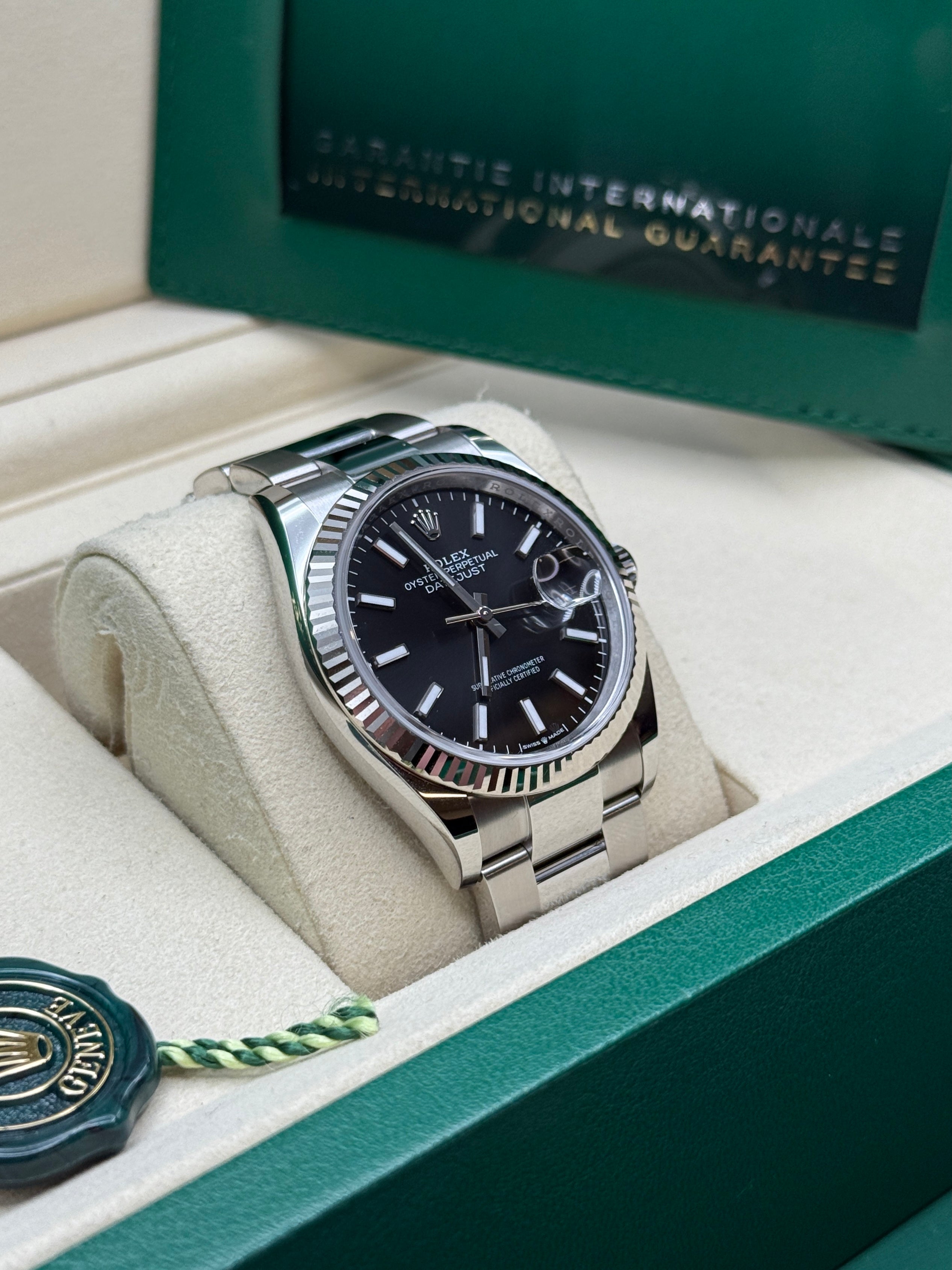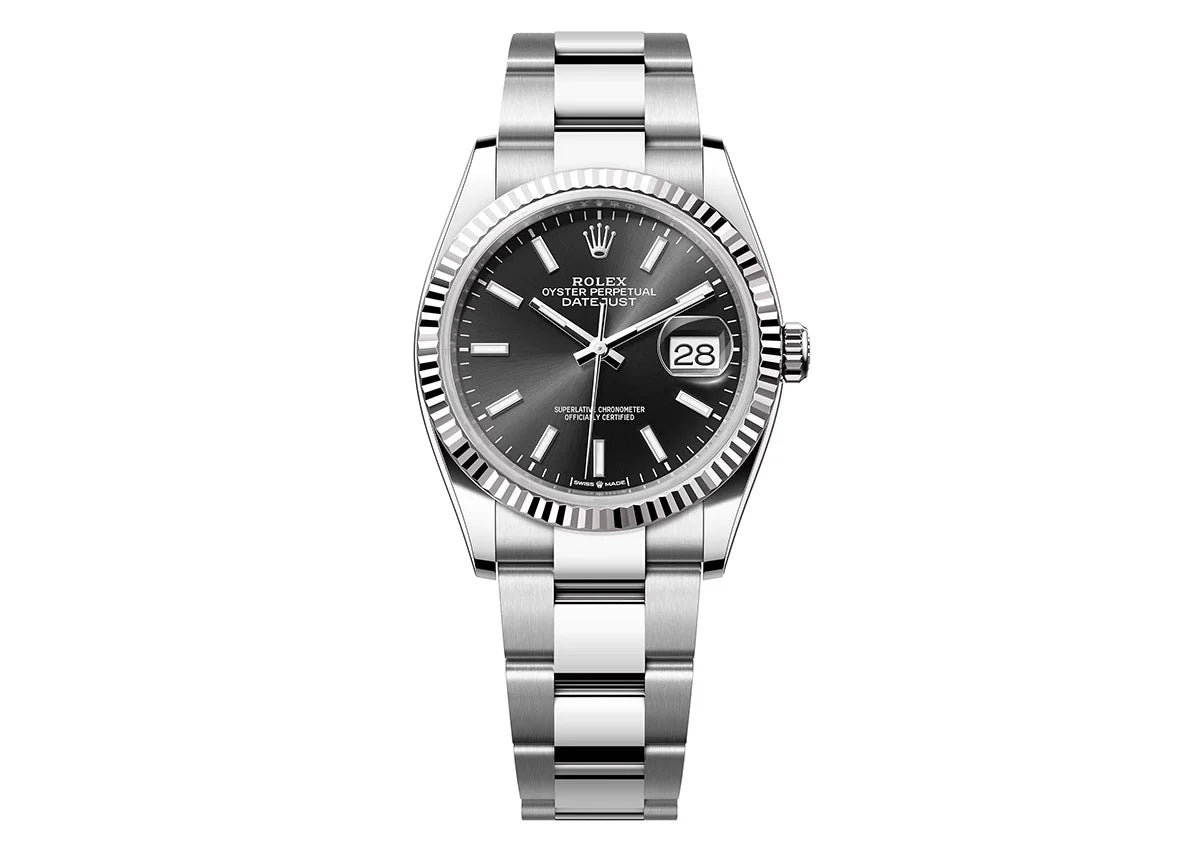 Rolex’s Datejust is the archetype of the classic watch thanks to functions and aesthetics that never go out of fashion. Launched in 1945, it was the first self-winding waterproof chronometer wristwatch to display the date in a window at 3 o’clock on the dial, and consolidated all the major innovations that Rolex had contributed to the modern wristwatch until then. The Datejust has spanned eras while retaining the enduring aesthetic characteristics that make it so instantly recognizable. A paragon of robustness and elegance, the Oyster case of the Datejust 36 is guaranteed waterproof to a depth of 100 meters (330 feet) and is equipped with calibre 3235, a movement entirely developed and manufactured by Rolex.