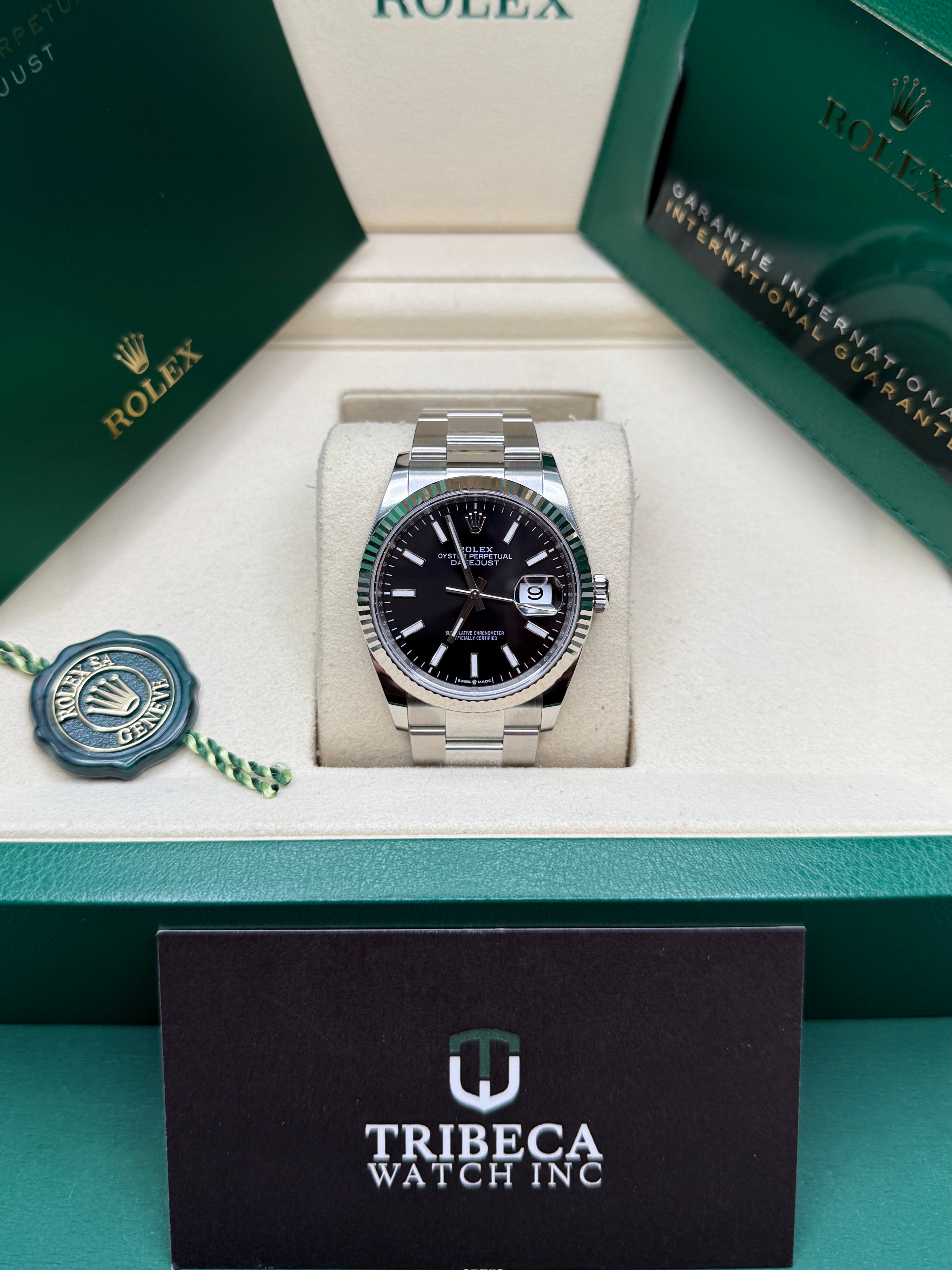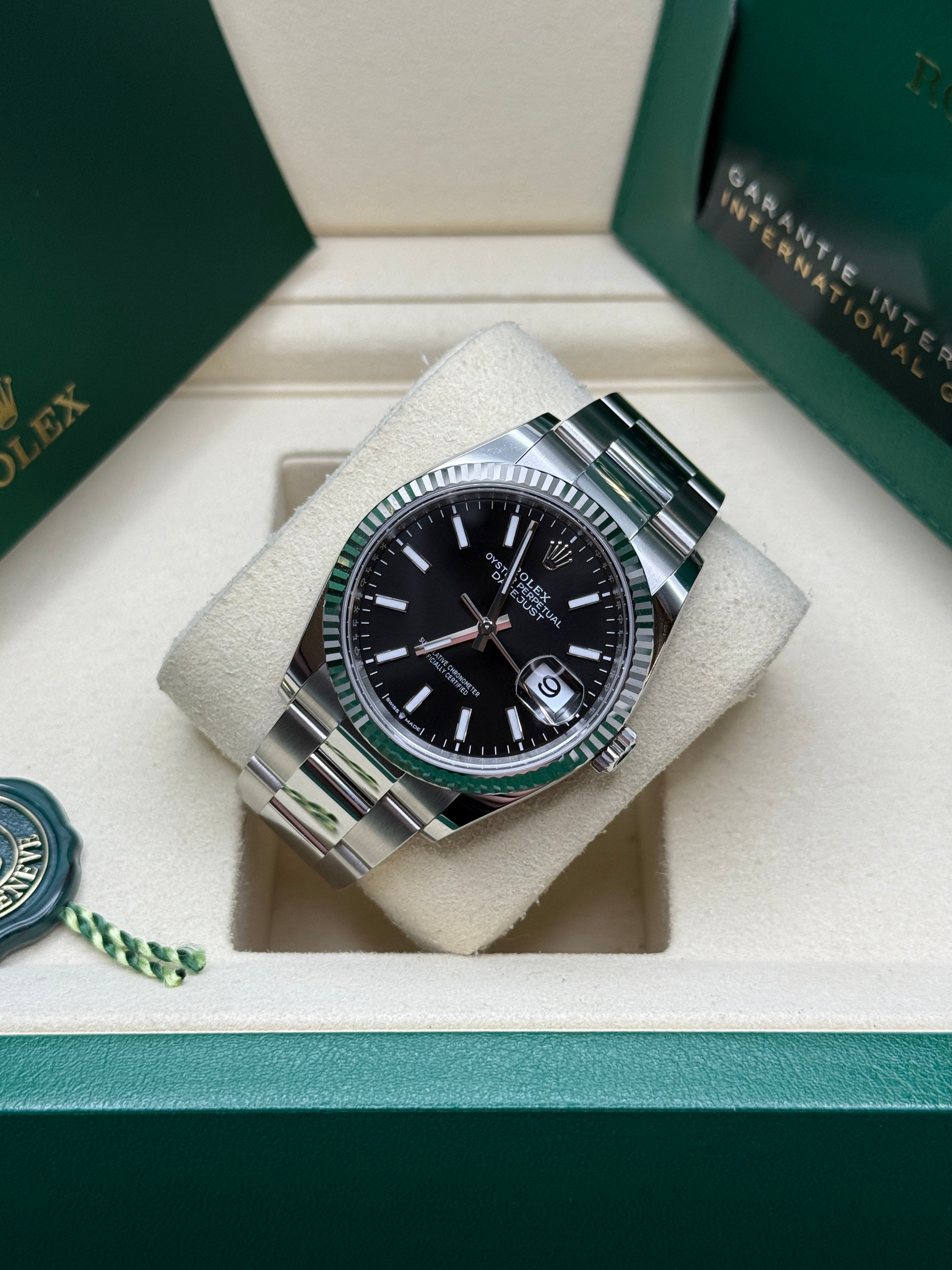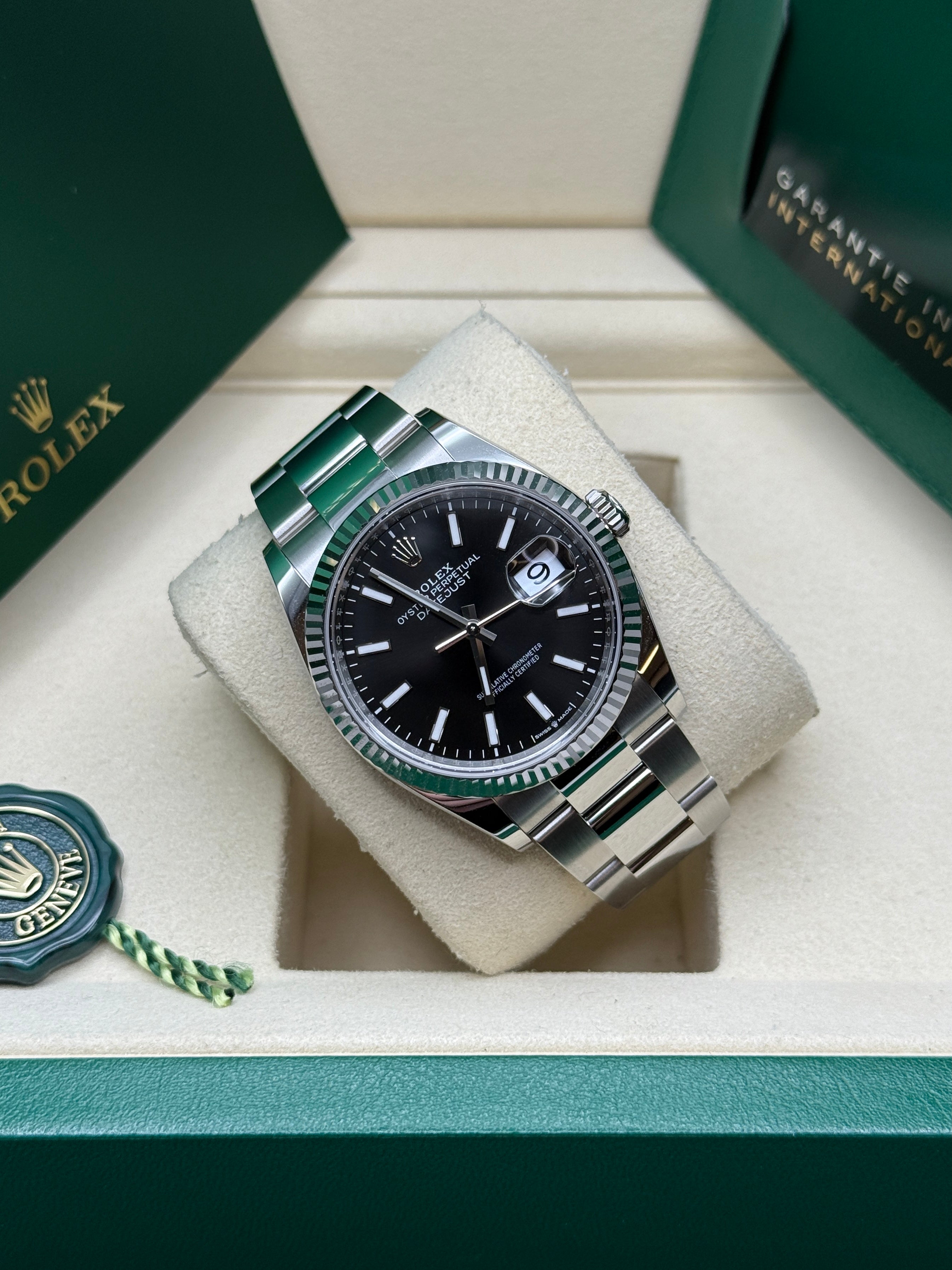 Rolex’s Datejust is the archetype of the classic watch thanks to functions and aesthetics that never go out of fashion. Launched in 1945, it was the first self-winding waterproof chronometer wristwatch to display the date in a window at 3 o’clock on the dial, and consolidated all the major innovations that Rolex had contributed to the modern wristwatch until then. The Datejust has spanned eras while retaining the enduring aesthetic characteristics that make it so instantly recognizable. A paragon of robustness and elegance, the Oyster case of the Datejust 36 is guaranteed waterproof to a depth of 100 meters (330 feet) and is equipped with calibre 3235, a movement entirely developed and manufactured by Rolex.