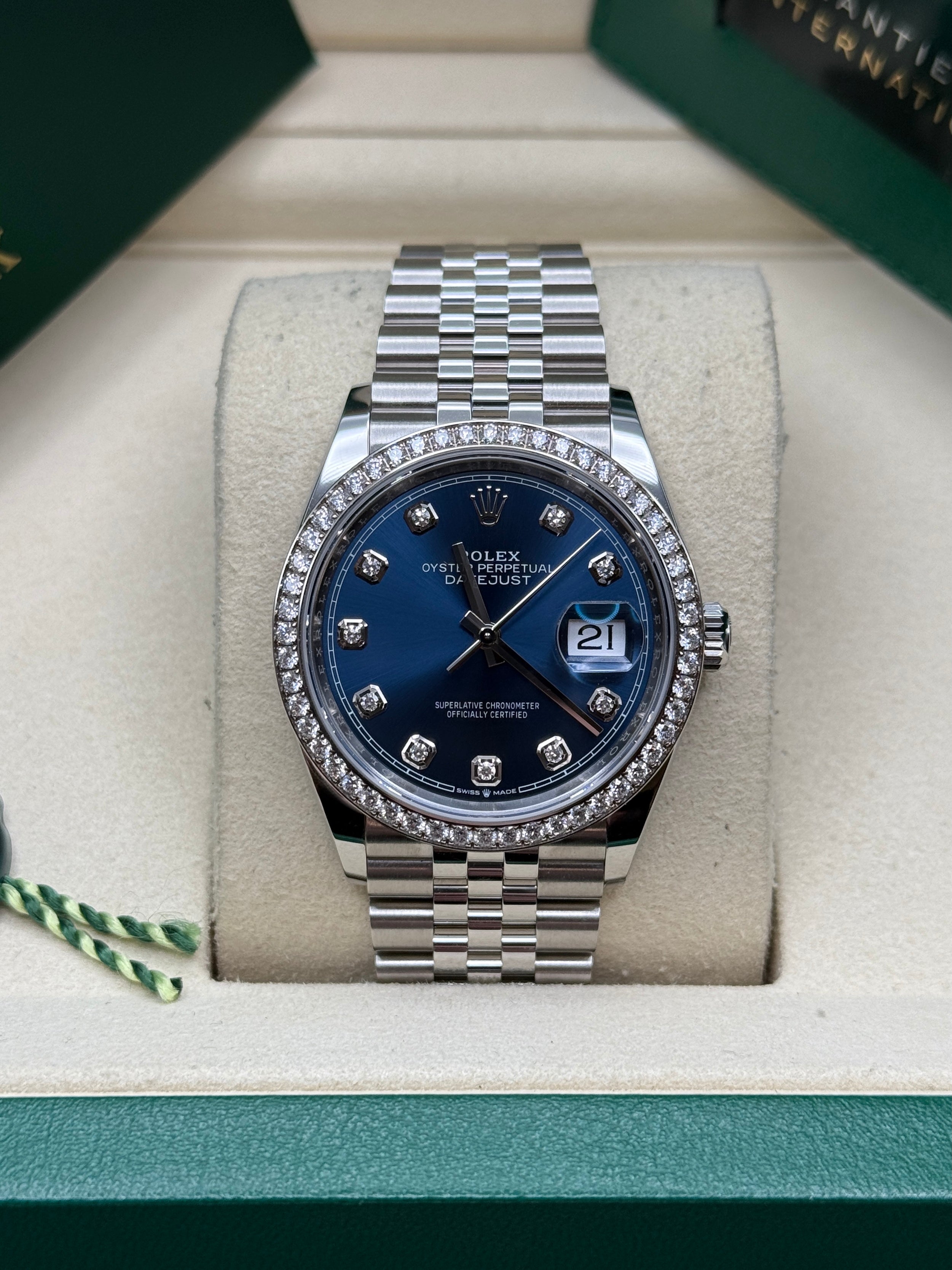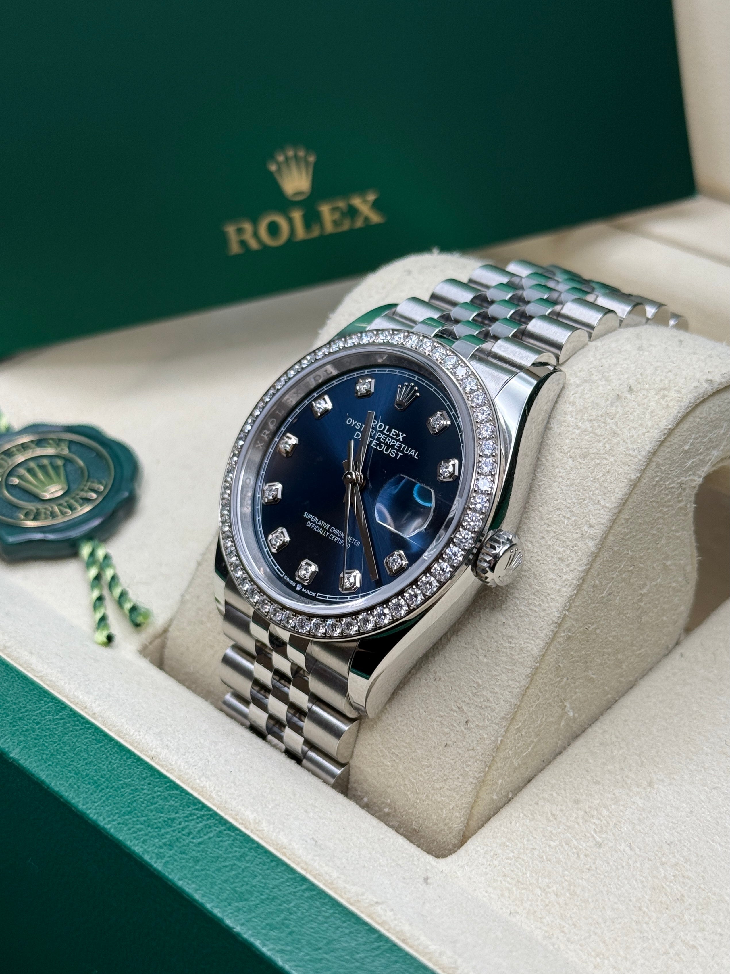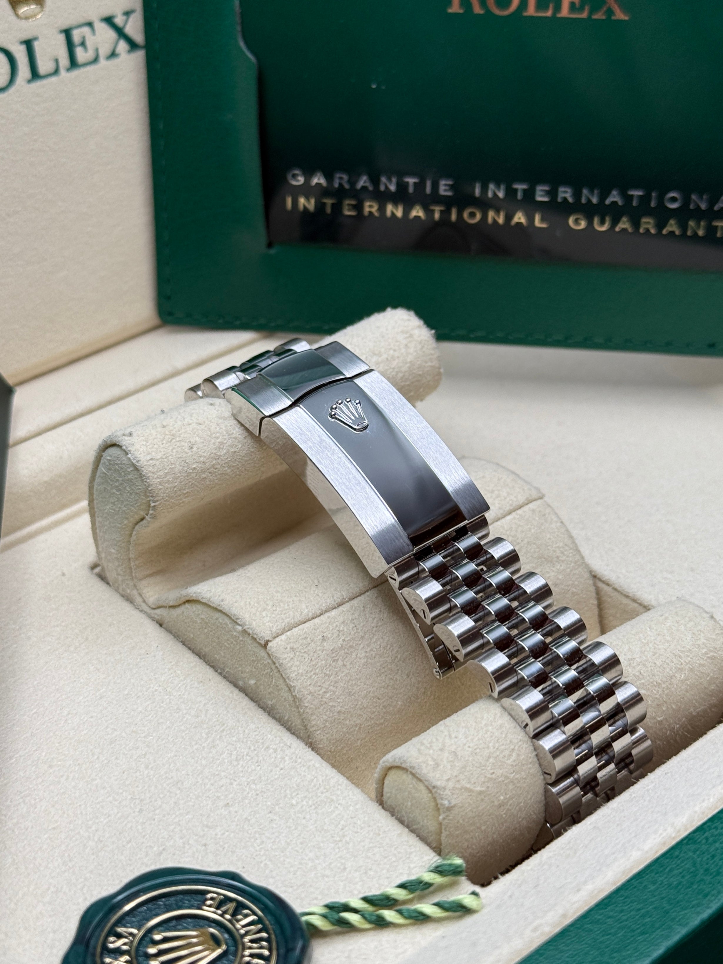 Rolex’s Datejust is the archetype of the classic watch thanks to functions and aesthetics that never go out of fashion. Launched in 1945, it was the first self-winding waterproof chronometer wristwatch to display the date in a window at 3 o’clock on the dial, and consolidated all the major innovations that Rolex had contributed to the modern wristwatch until then. The Datejust has spanned eras while retaining the enduring aesthetic characteristics that make it so instantly recognizable. A paragon of robustness and elegance, the Oyster case of the Datejust 36 is guaranteed waterproof to a depth of 100 meters (330 feet) and is equipped with calibre 3235, a movement entirely developed and manufactured by Rolex.