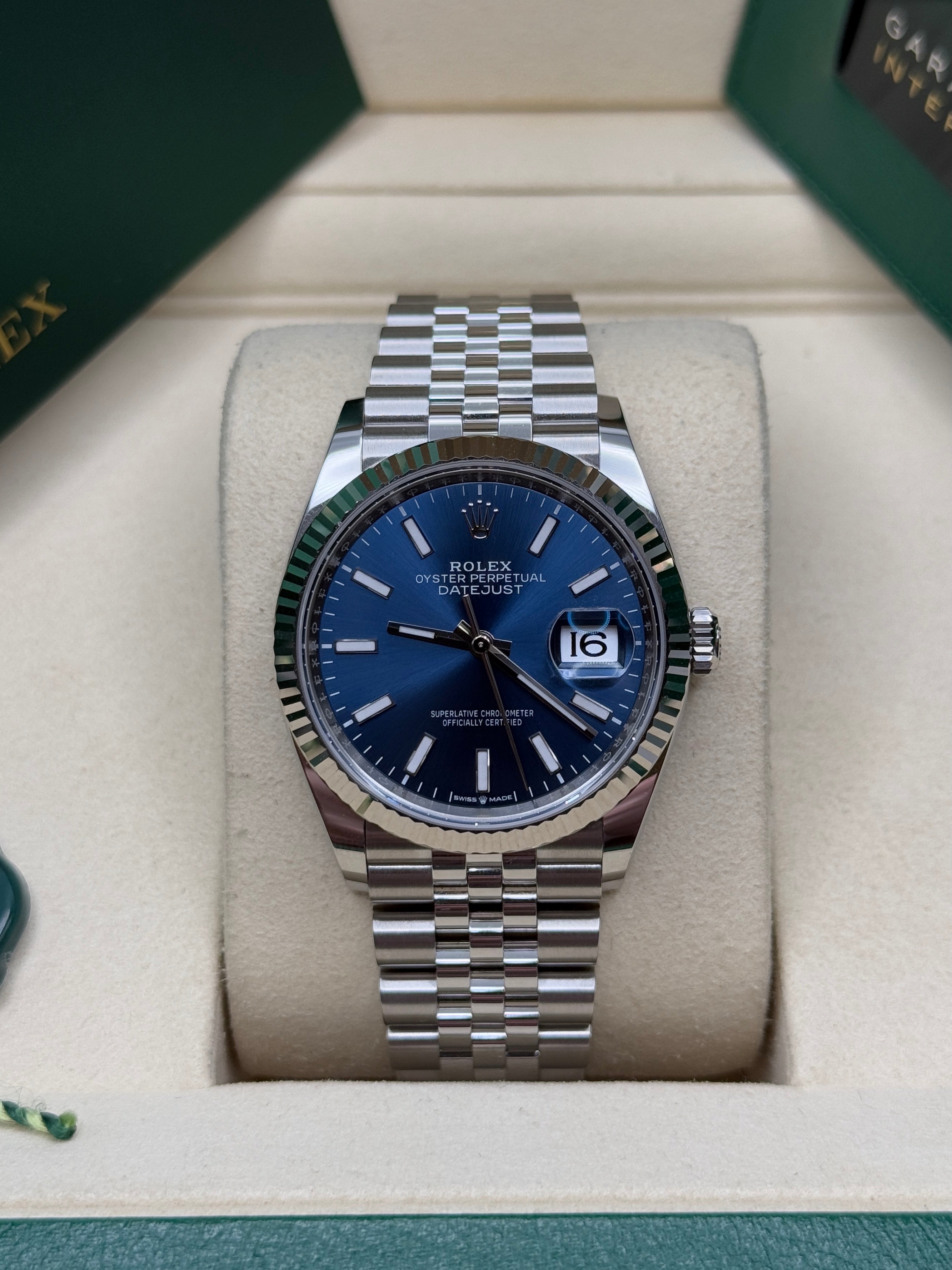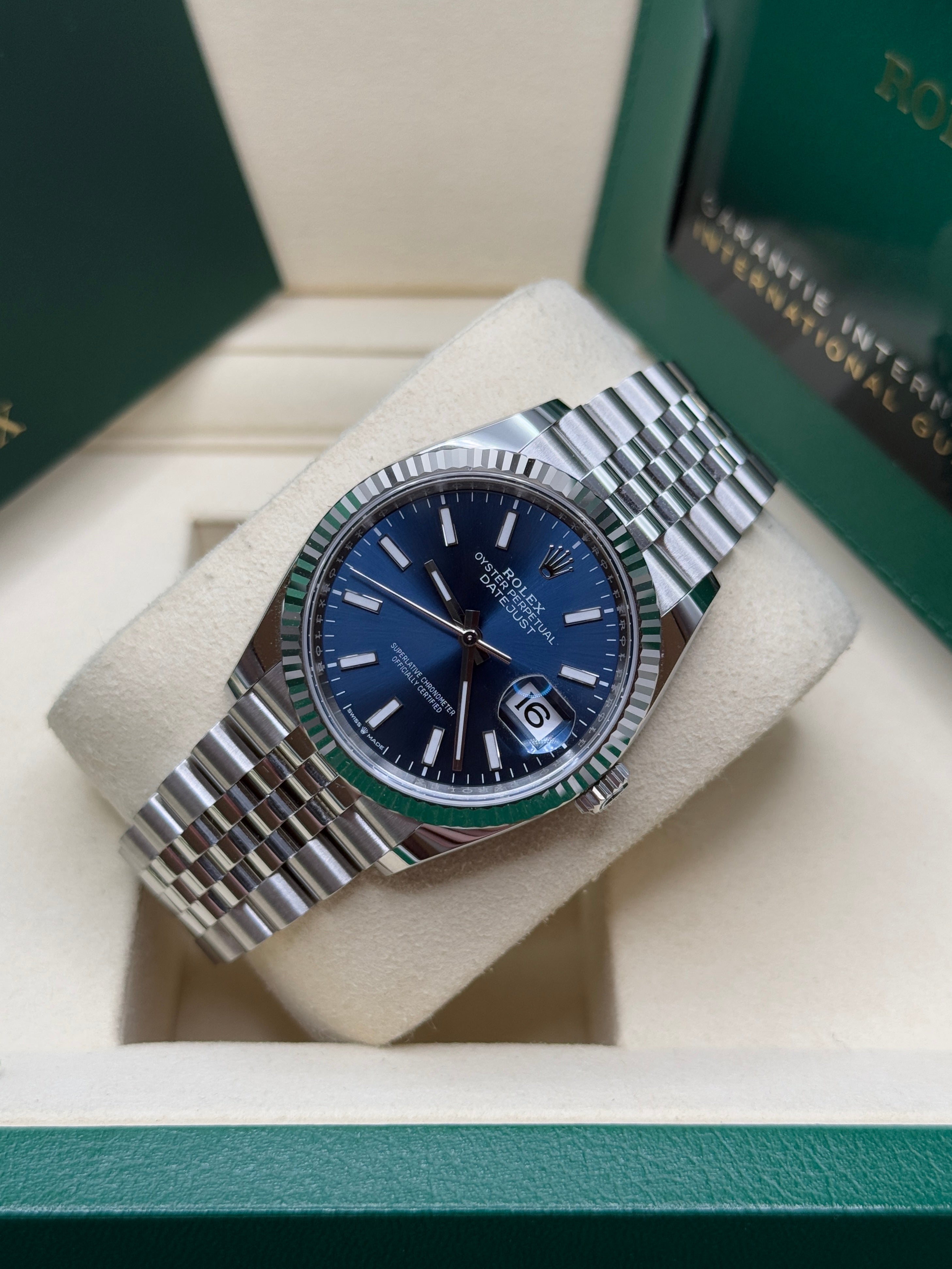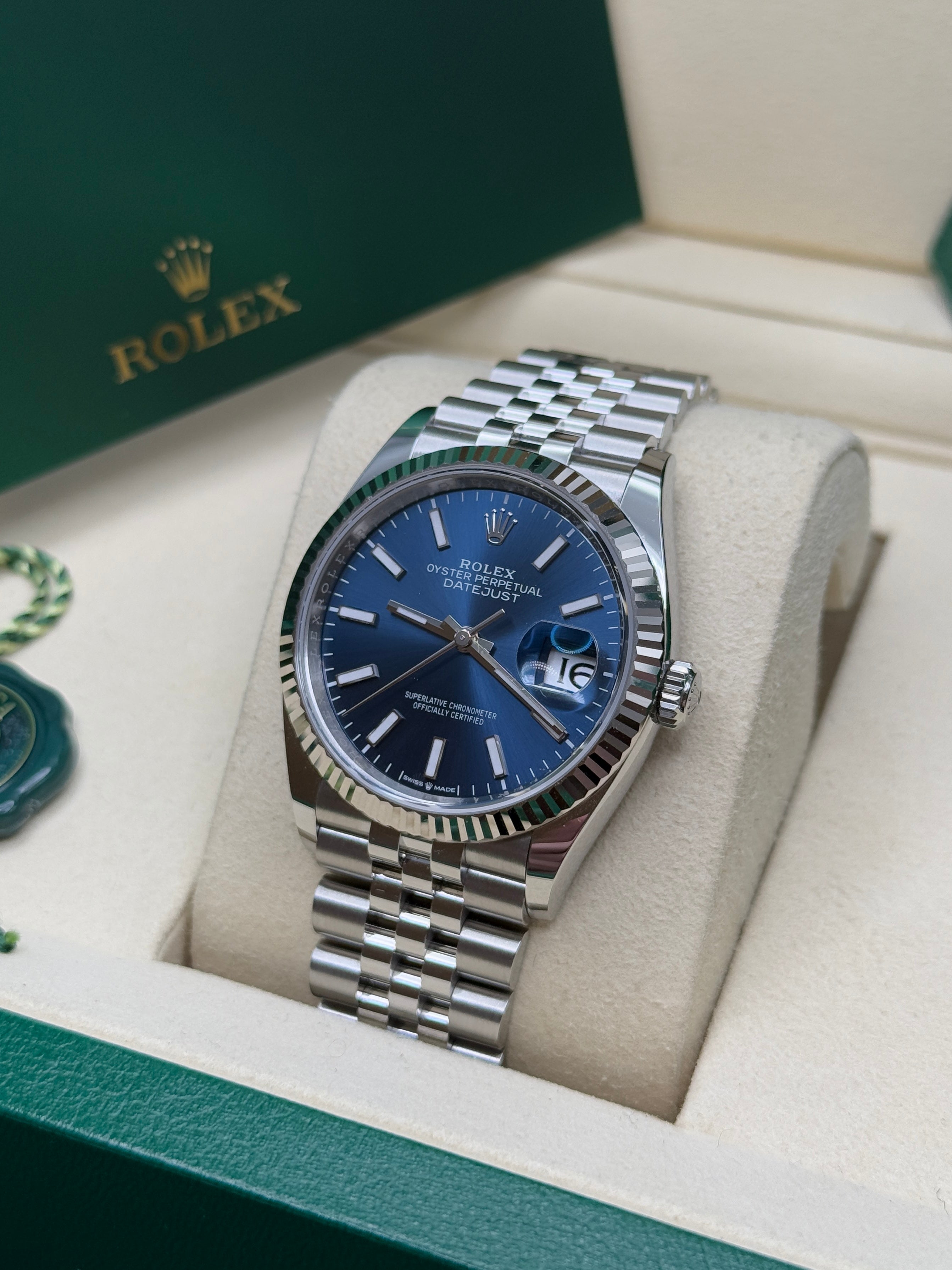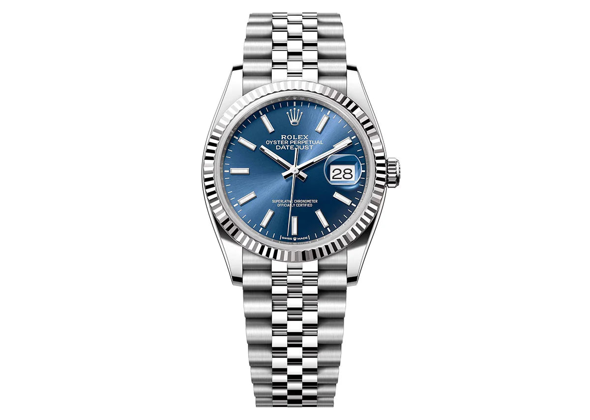 Rolex’s Datejust is the archetype of the classic watch thanks to functions and aesthetics that never go out of fashion. Launched in 1945, it was the first self-winding waterproof chronometer wristwatch to display the date in a window at 3 o’clock on the dial, and consolidated all the major innovations that Rolex had contributed to the modern wristwatch until then. The Datejust has spanned eras while retaining the enduring aesthetic characteristics that make it so instantly recognizable. A paragon of robustness and elegance, the Oyster case of the Datejust 36 is guaranteed waterproof to a depth of 100 meters (330 feet) and is equipped with calibre 3235, a movement entirely developed and manufactured by Rolex.
