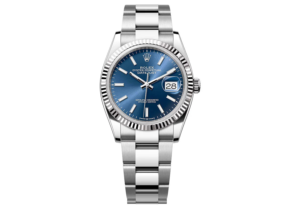 Rolex’s Datejust is the archetype of the classic watch thanks to functions and aesthetics that never go out of fashion. Launched in 1945, it was the first self-winding waterproof chronometer wristwatch to display the date in a window at 3 o’clock on the dial, and consolidated all the major innovations that Rolex had contributed to the modern wristwatch until then. The Datejust has spanned eras while retaining the enduring aesthetic characteristics that make it so instantly recognizable. A paragon of robustness and elegance, the Oyster case of the Datejust 36 is guaranteed waterproof to a depth of 100 meters (330 feet) and is equipped with calibre 3235, a movement entirely developed and manufactured by Rolex.