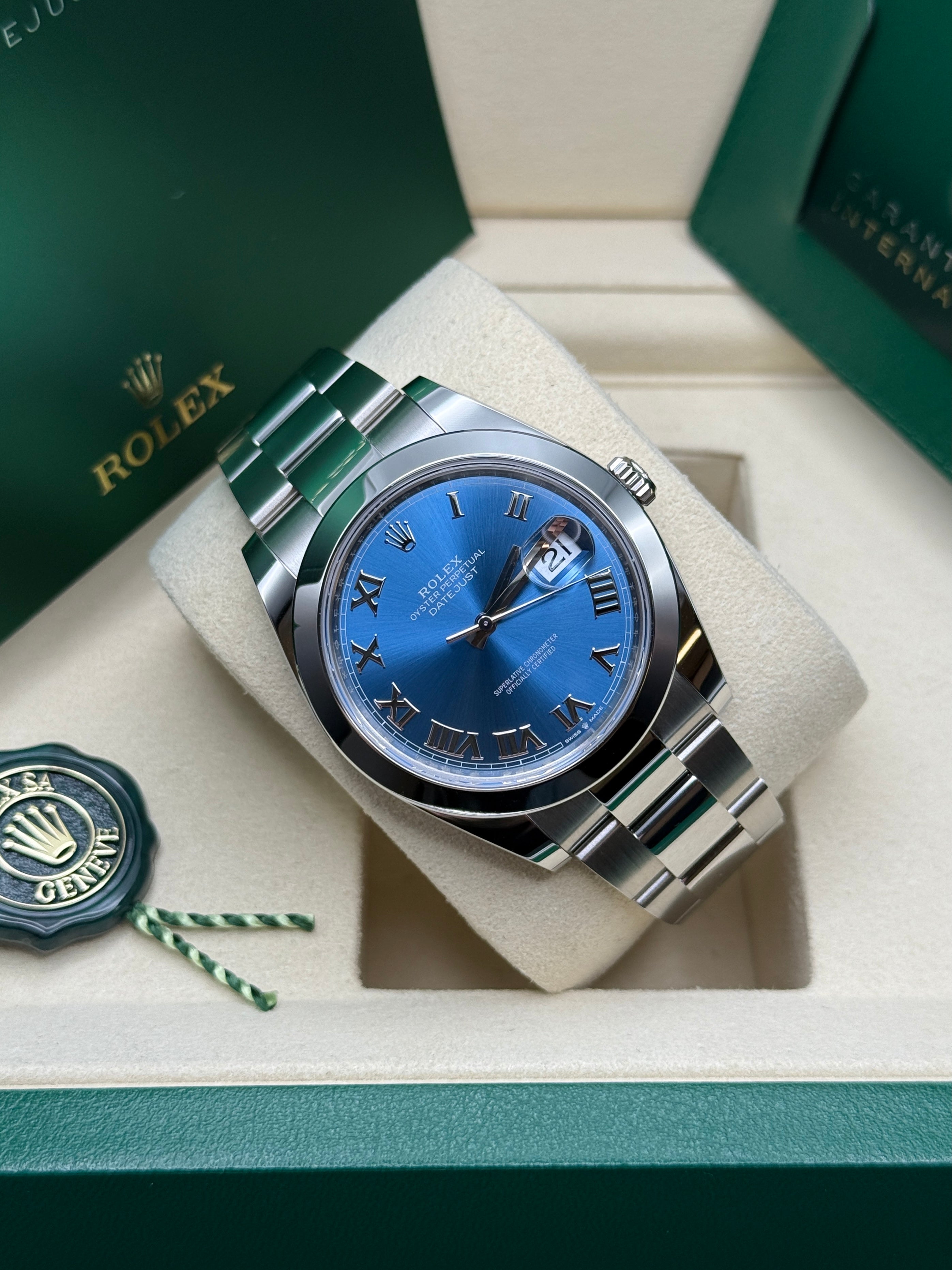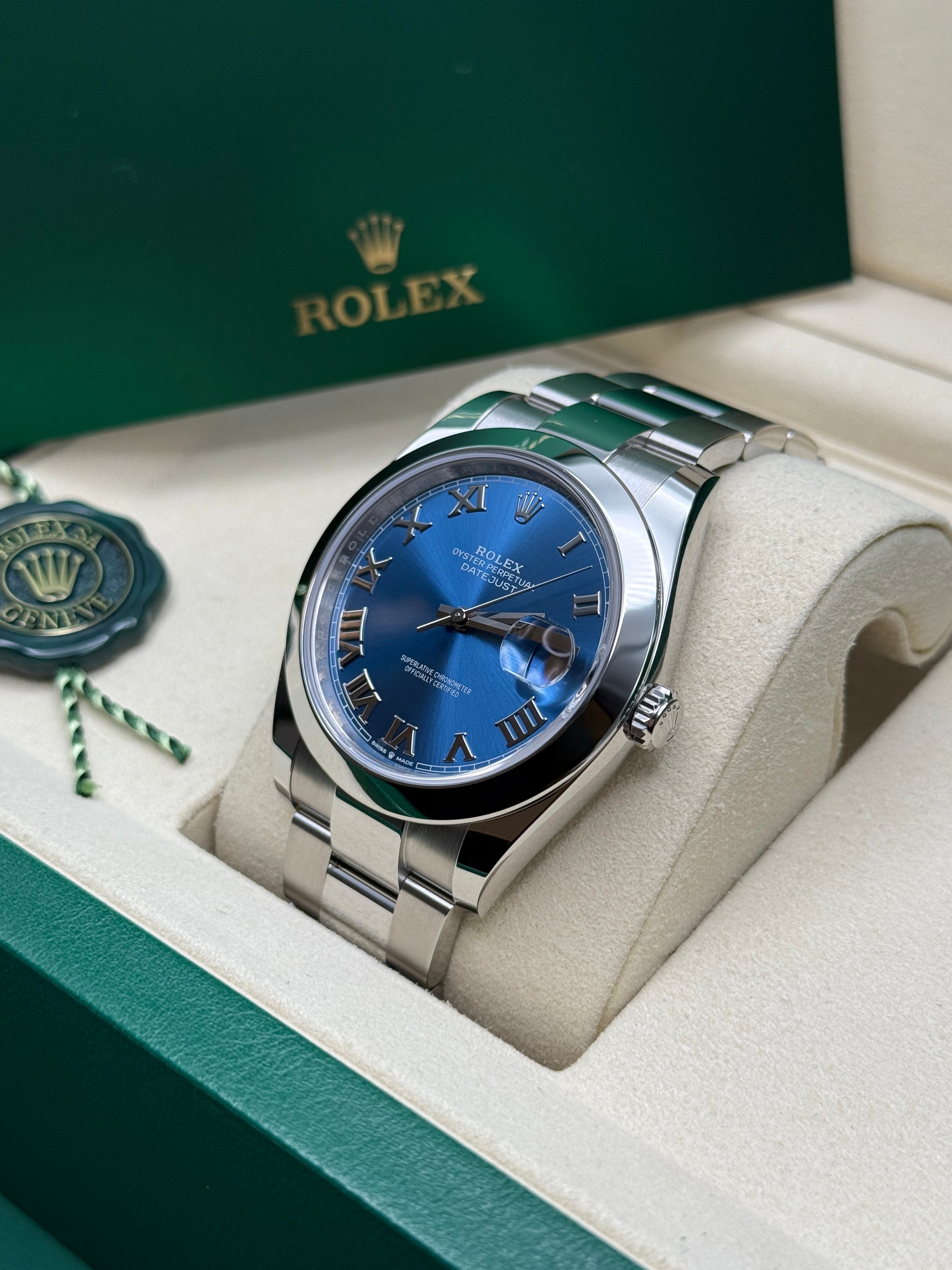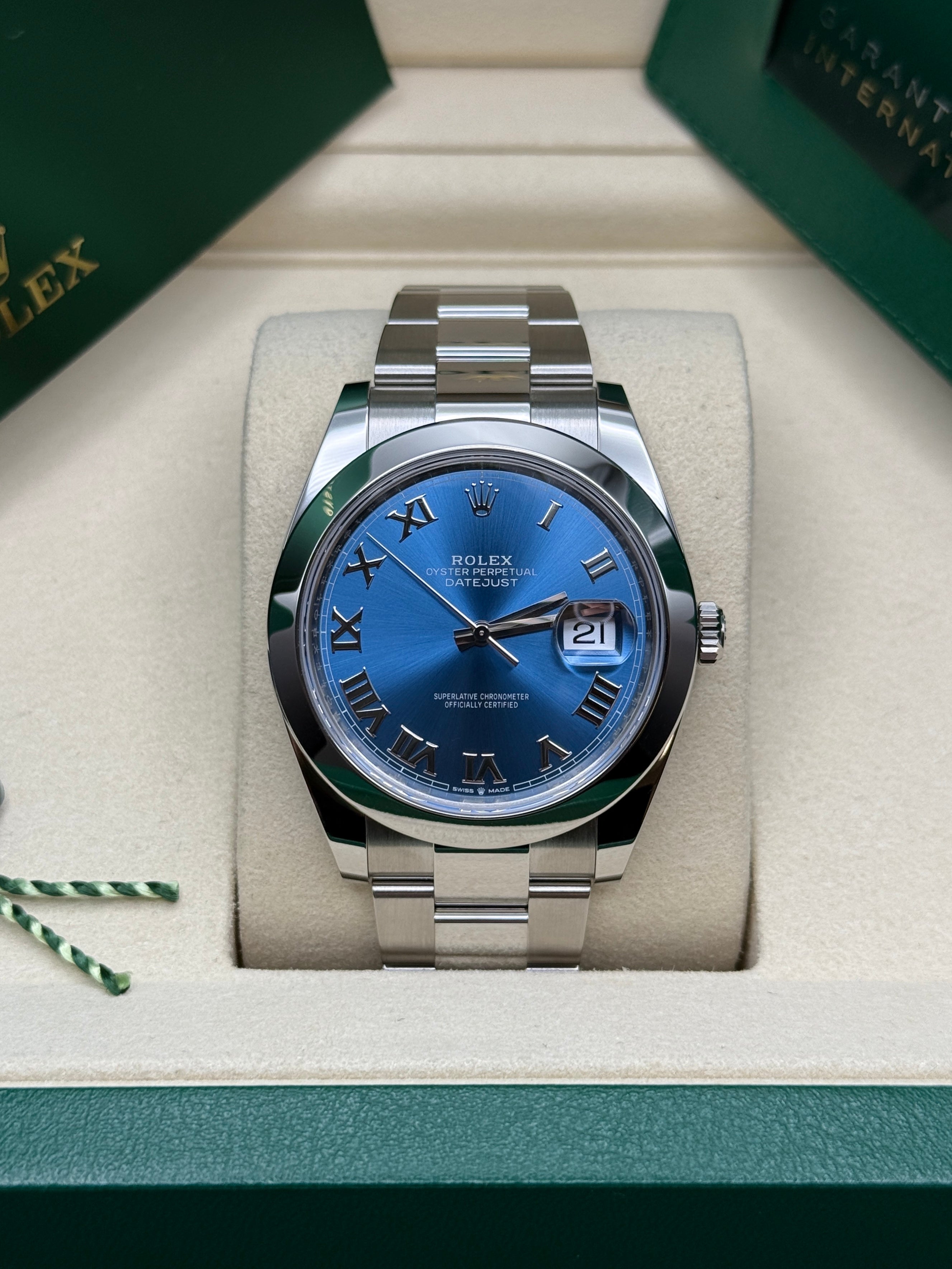 Rolex’s Datejust is the archetype of the classic watch thanks to functions and aesthetics that never go out of fashion. Launched in 1945, it was the first self-winding waterproof chronometer wristwatch to display the date in a window at 3 o’clock on the dial, and consolidated all the major innovations that Rolex had contributed to the modern wristwatch until then. The Datejust has spanned eras while retaining the enduring aesthetic characteristics that make it so instantly recognizable. A paragon of robustness and elegance, the Oyster case of the Datejust 41 is guaranteed waterproof to a depth of 100 meters (330 feet) and is equipped with calibre 3235, a movement entirely developed and manufactured by Rolex.