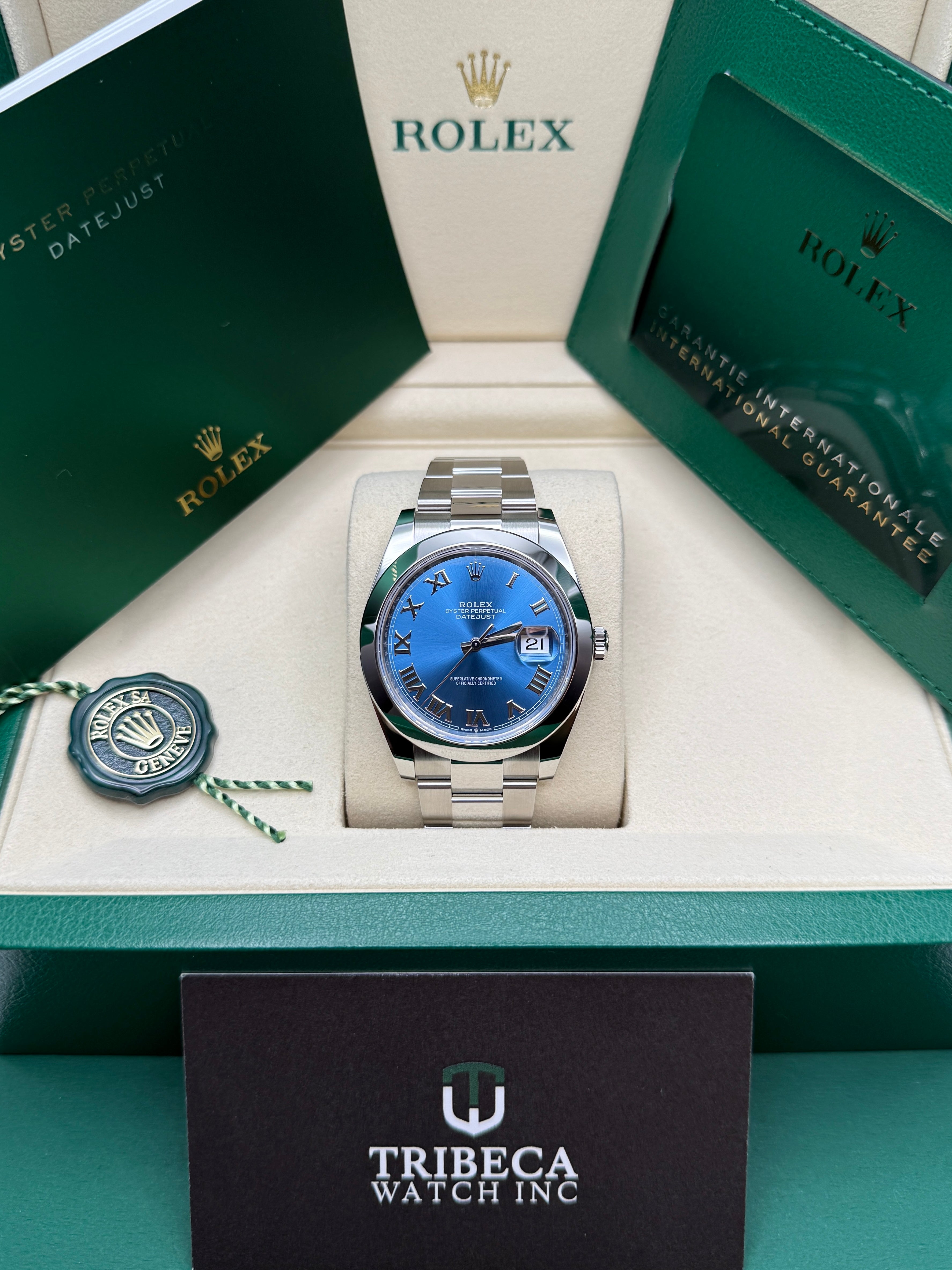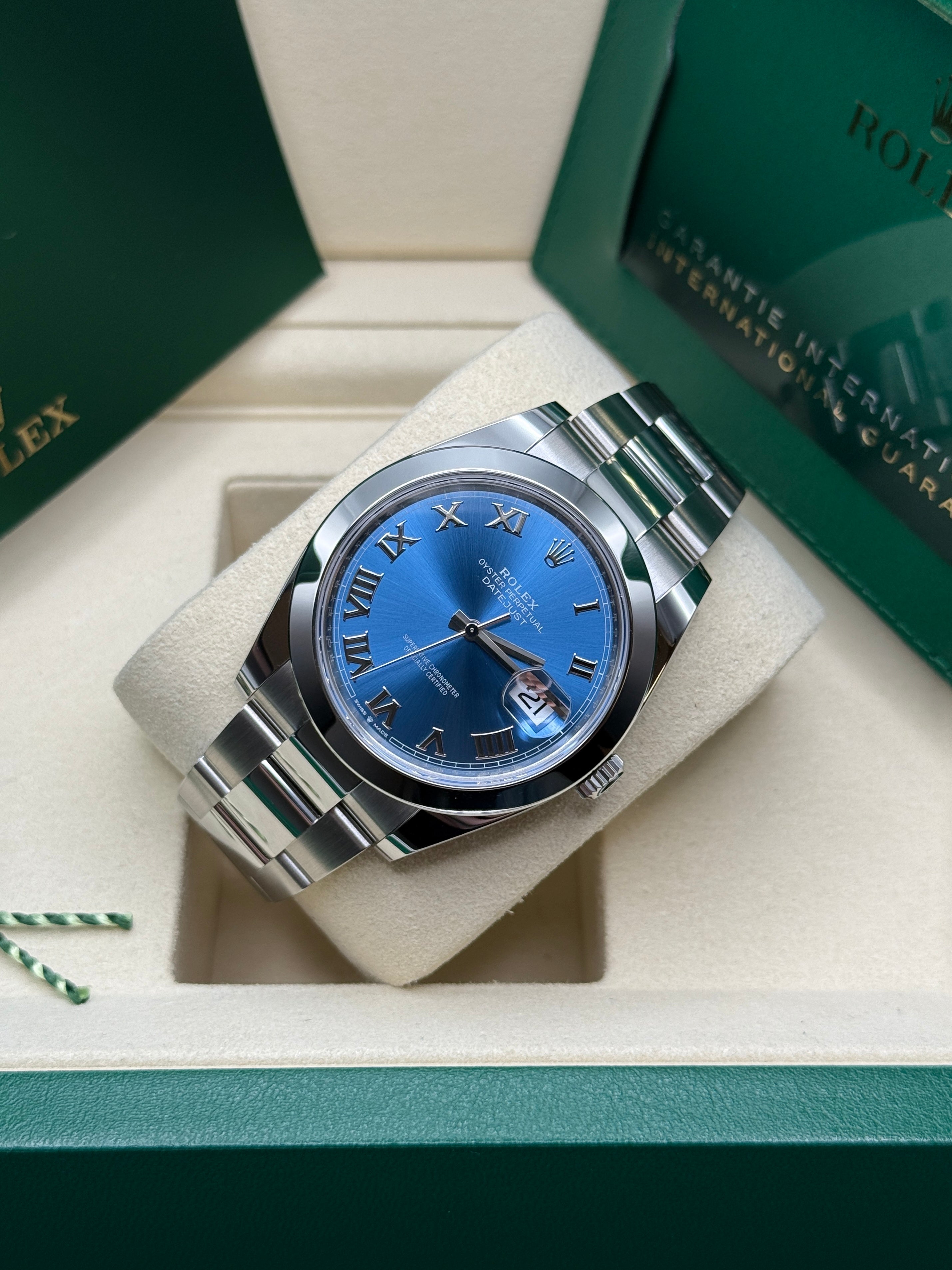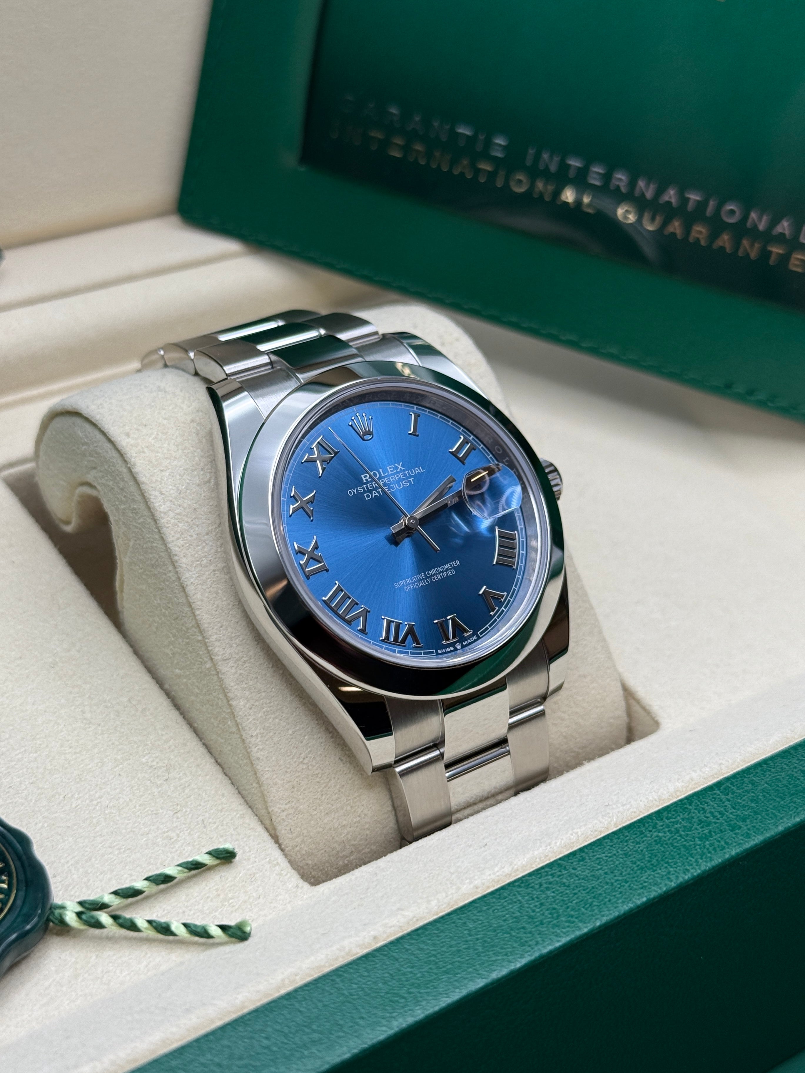 Rolex’s Datejust is the archetype of the classic watch thanks to functions and aesthetics that never go out of fashion. Launched in 1945, it was the first self-winding waterproof chronometer wristwatch to display the date in a window at 3 o’clock on the dial, and consolidated all the major innovations that Rolex had contributed to the modern wristwatch until then. The Datejust has spanned eras while retaining the enduring aesthetic characteristics that make it so instantly recognizable. A paragon of robustness and elegance, the Oyster case of the Datejust 41 is guaranteed waterproof to a depth of 100 meters (330 feet) and is equipped with calibre 3235, a movement entirely developed and manufactured by Rolex.