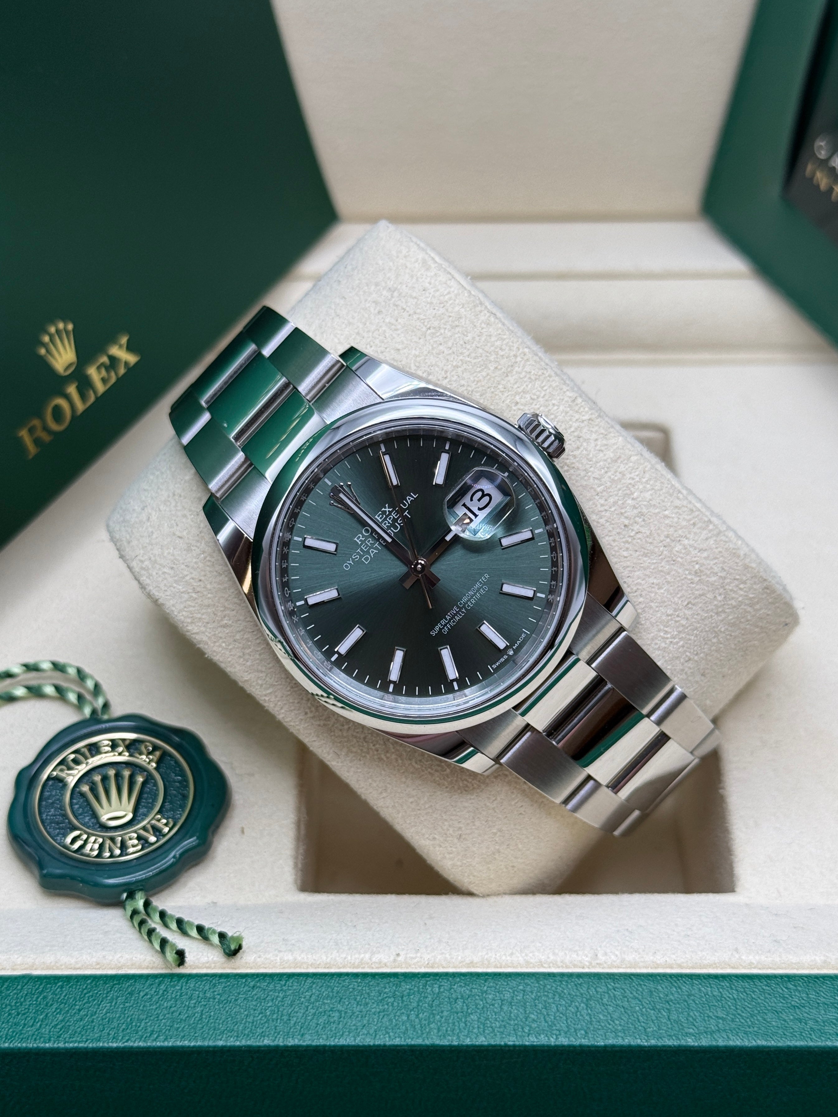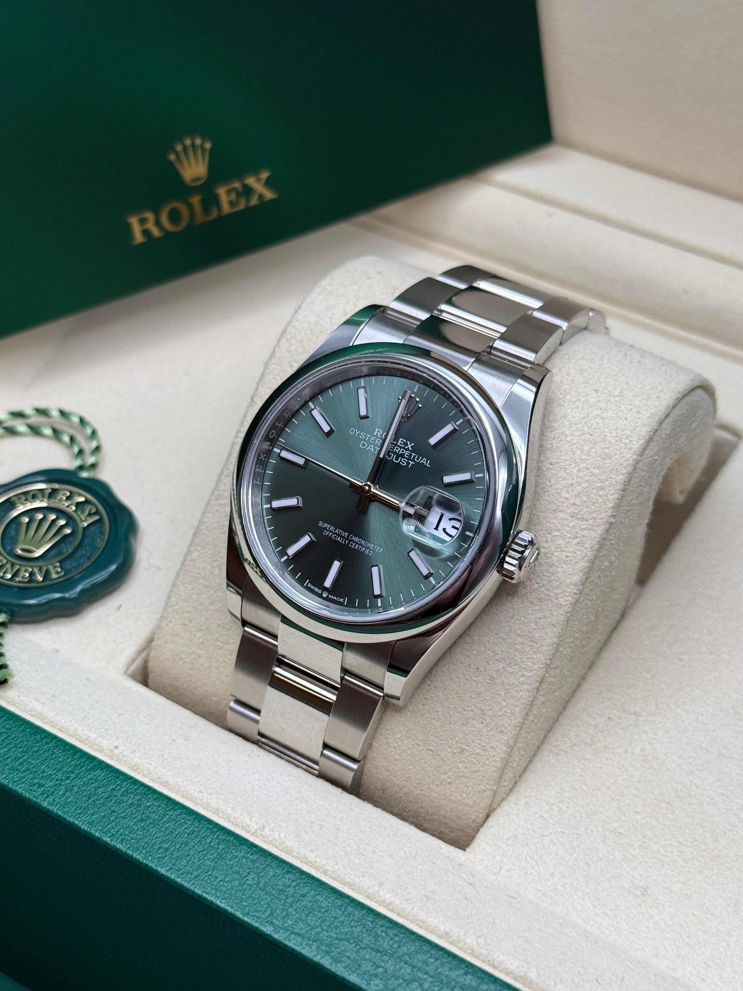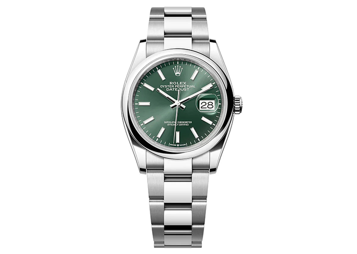 Rolex’s Datejust is the archetype of the classic watch thanks to functions and aesthetics that never go out of fashion. Launched in 1945, it was the first self-winding waterproof chronometer wristwatch to display the date in a window at 3 o’clock on the dial, and consolidated all the major innovations that Rolex had contributed to the modern wristwatch until then. The Datejust has spanned eras while retaining the enduring aesthetic characteristics that make it so instantly recognizable. A paragon of robustness and elegance, the Oyster case of the Datejust 36 is guaranteed waterproof to a depth of 100 meters (330 feet) and is equipped with calibre 3235, a movement entirely developed and manufactured by Rolex.