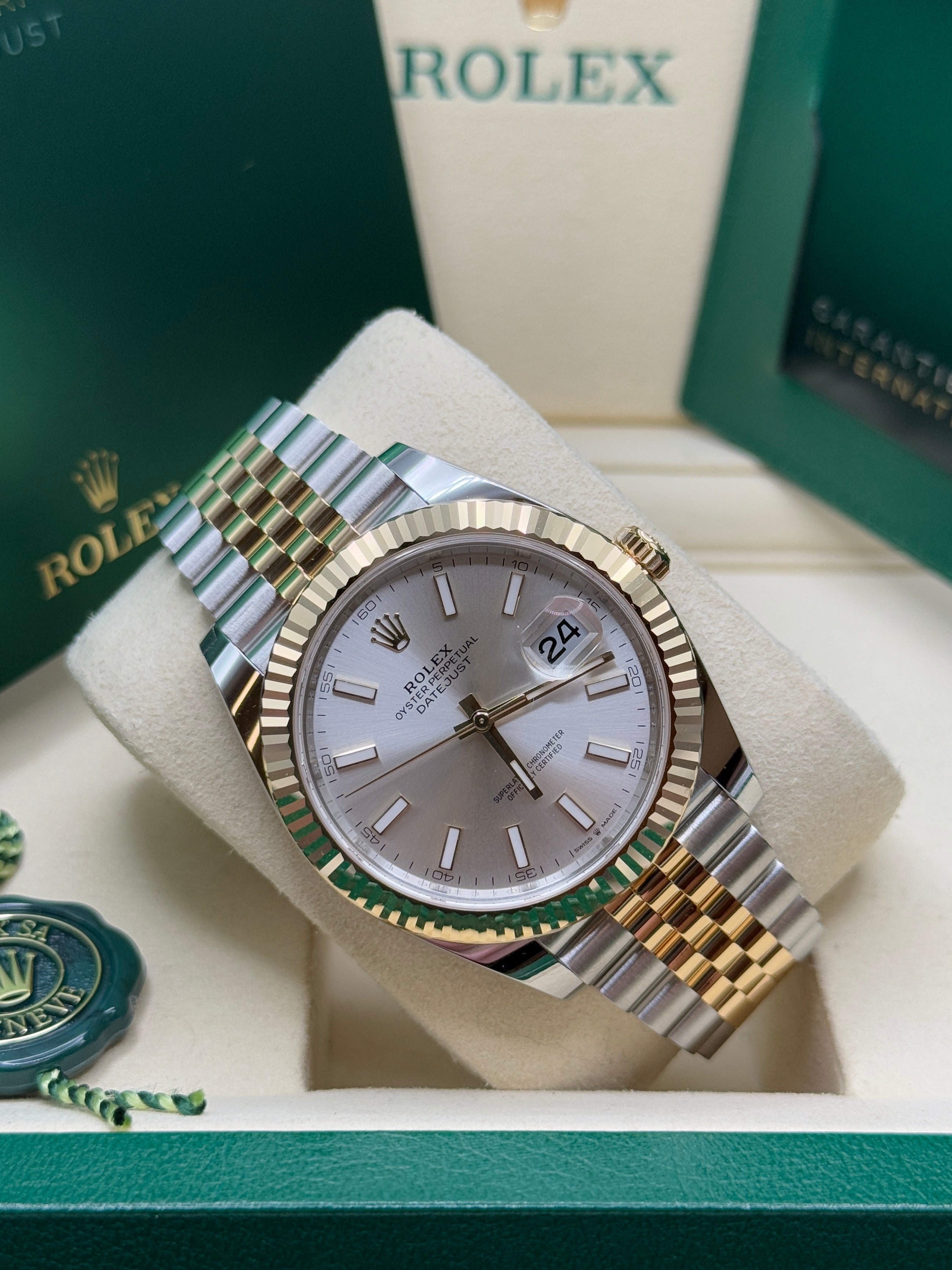 Rolex’s Datejust is the archetype of the classic watch thanks to functions and aesthetics that never go out of fashion. Launched in 1945, it was the first self-winding waterproof chronometer wristwatch to display the date in a window at 3 o’clock on the dial, and consolidated all the major innovations that Rolex had contributed to the modern wristwatch until then. The Datejust has spanned eras while retaining the enduring aesthetic characteristics that make it so instantly recognizable. A paragon of robustness and elegance, the Oyster case of the Datejust 41 is guaranteed waterproof to a depth of 100 meters (330 feet) and is equipped with calibre 3235, a movement entirely developed and manufactured by Rolex.