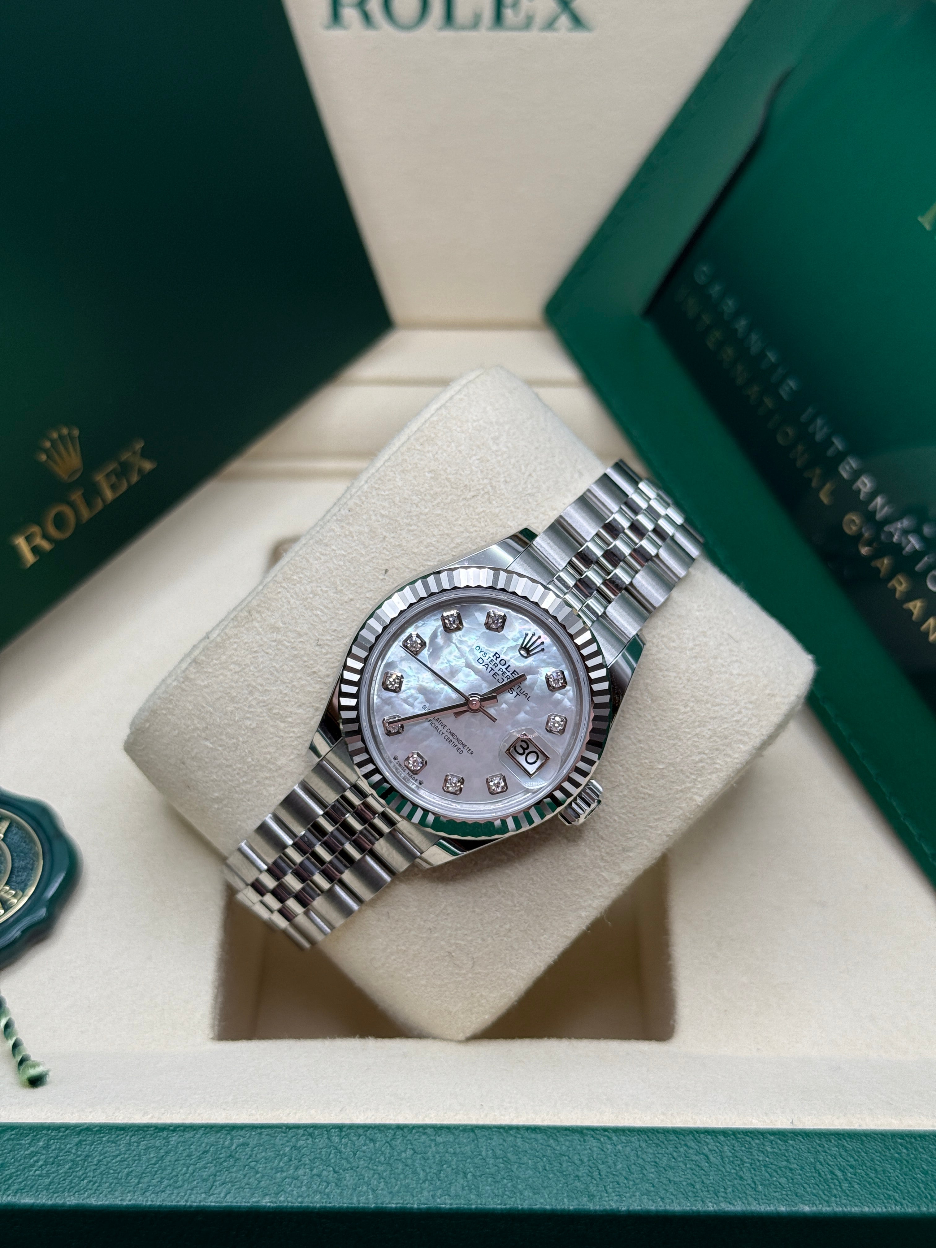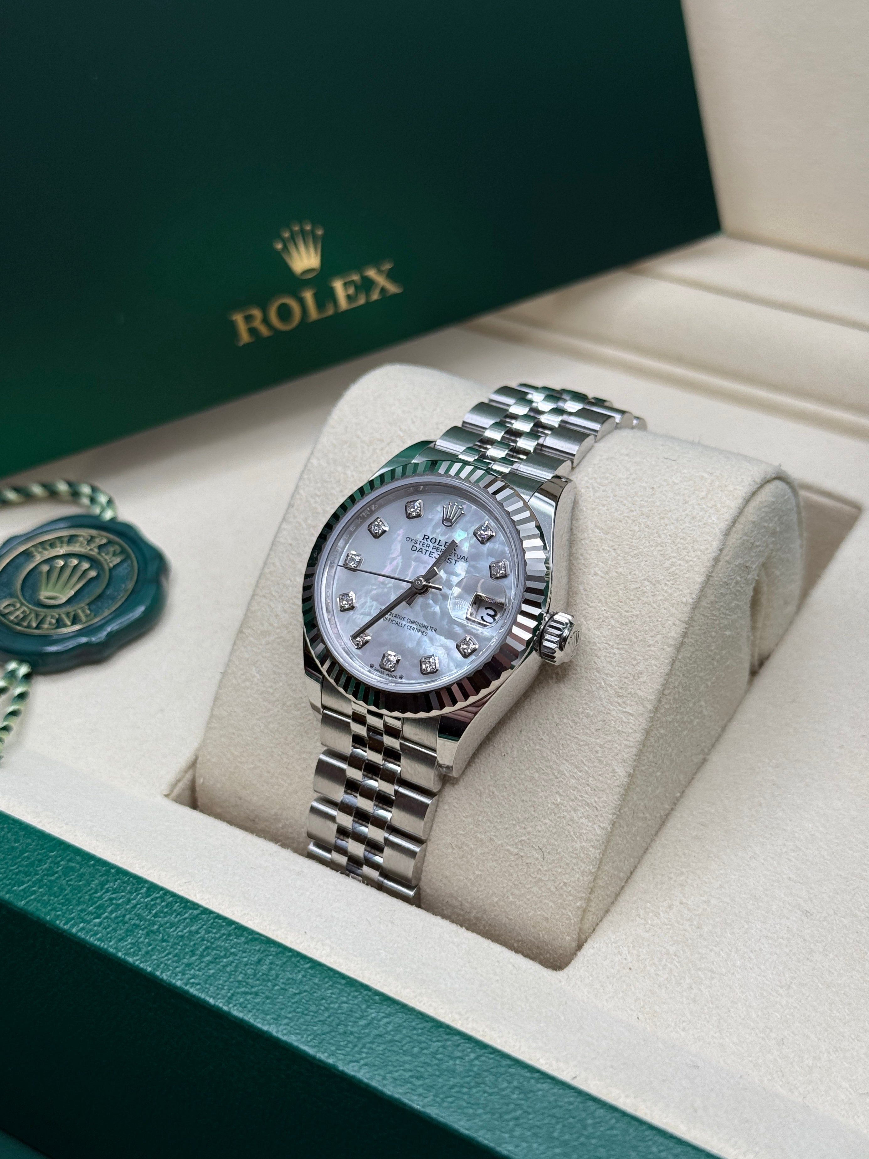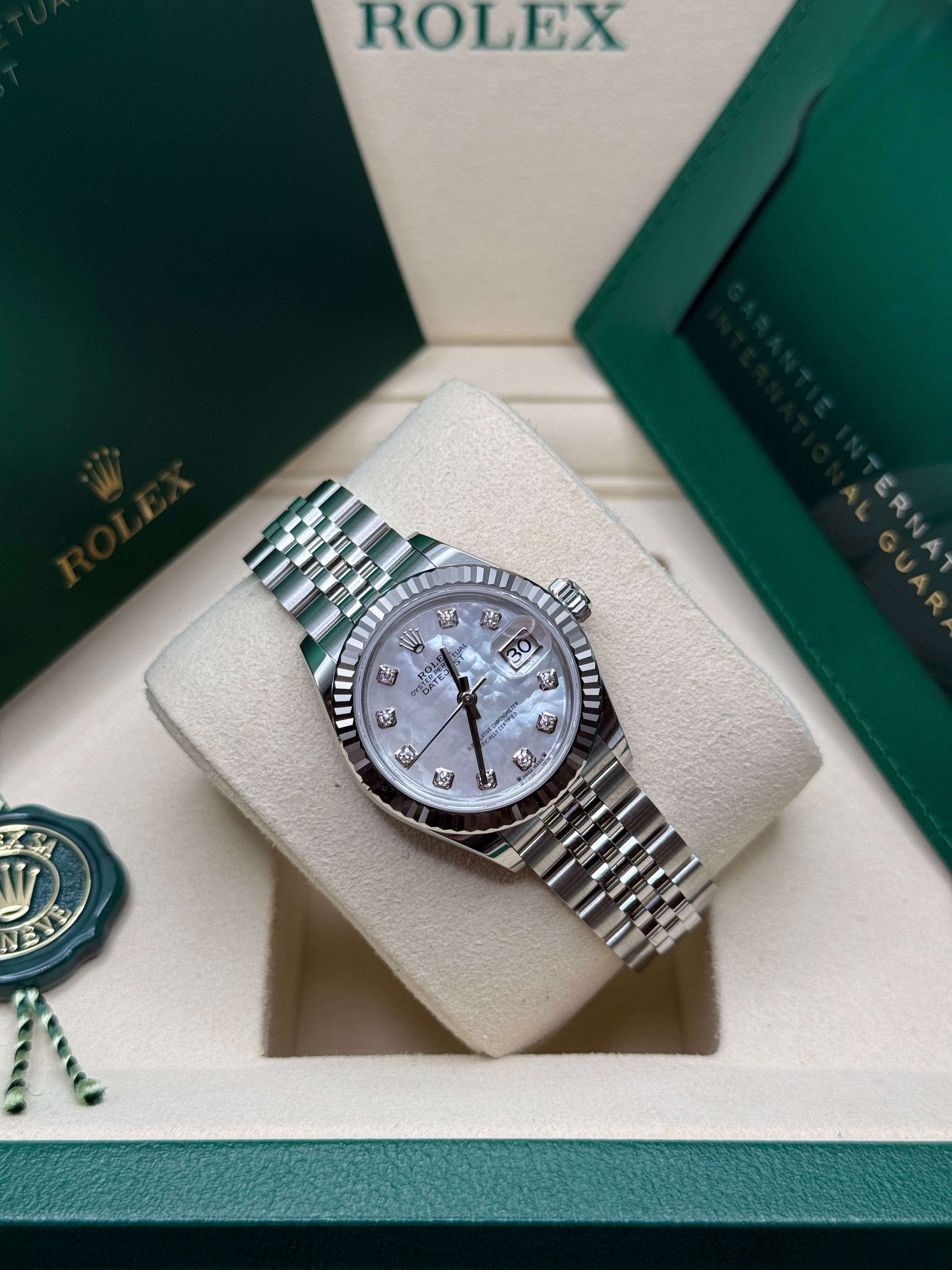 The classic Rolex feminine watch, the Lady-Datejust concentrates all the attributes of the Datejust, the brand’s emblematic watch that has been a byword for style and technical performance ever since its launch in 1945. The women’s version of this date chronometer, the Lady-Datejust, which first appeared in 1957, carries the elegance of the Datejust in a small 28 mm size particularly suited to a slender wrist. The Lady-Datejust upholds the hallmark features of the Datejust line, with a self-winding, waterproof Oyster case that is robust yet graceful. Its calibre 2236 movement, crafted entirely by Rolex, ensures precision and performance. The Lady-Datejust is guaranteed waterproof to a depth of 100 meters (330 feet), making it a resilient and elegant choice for any occasion.