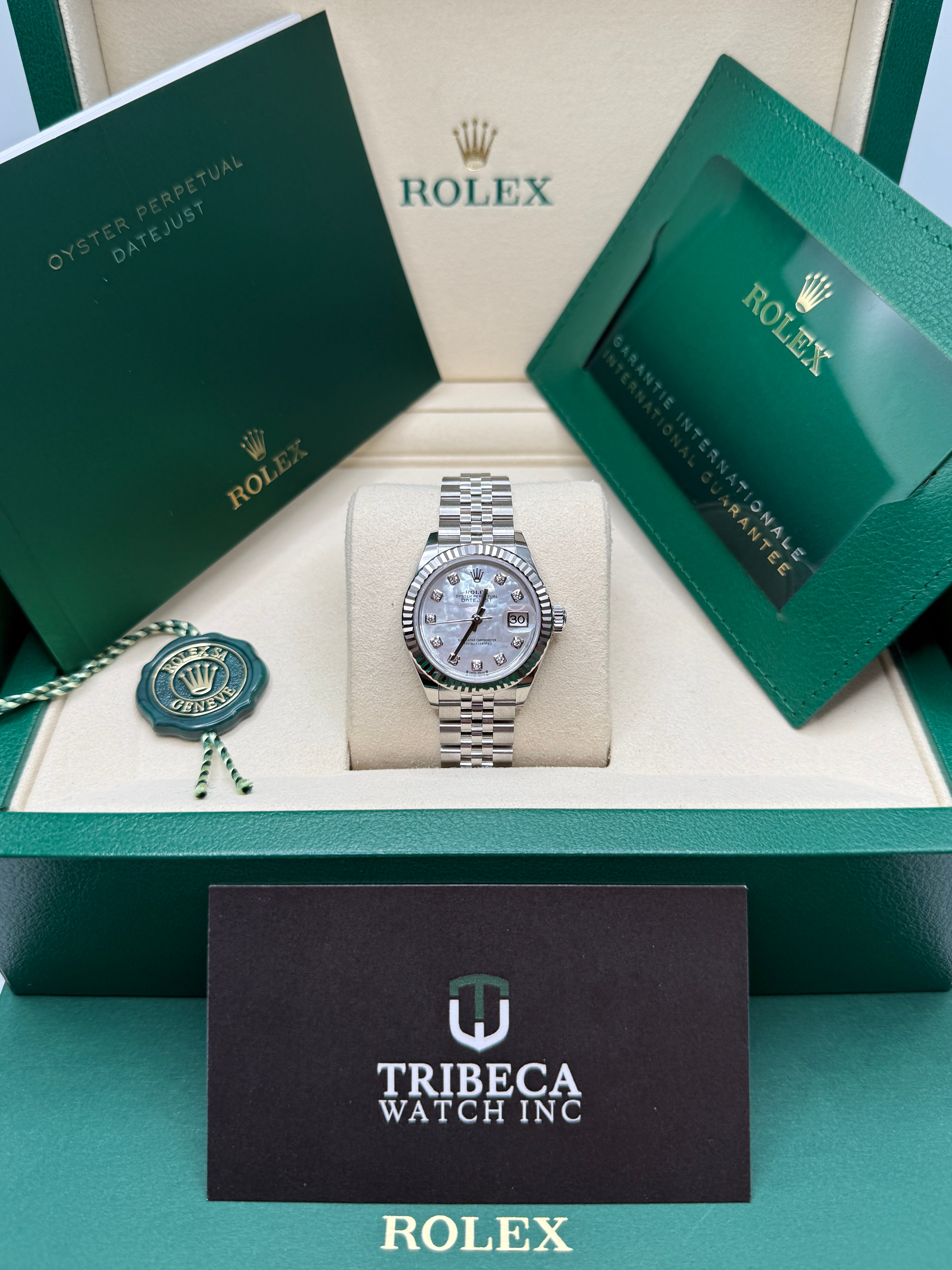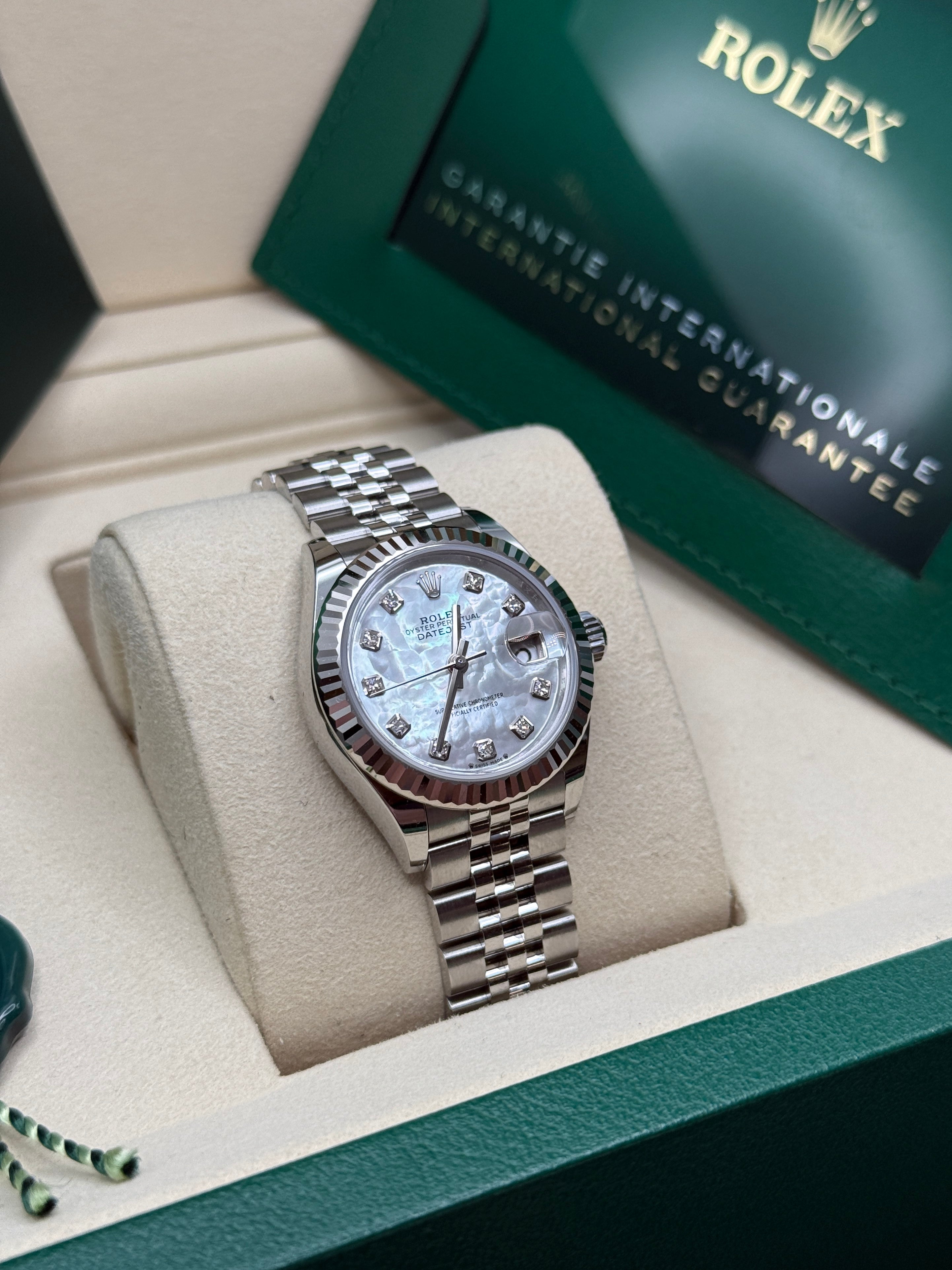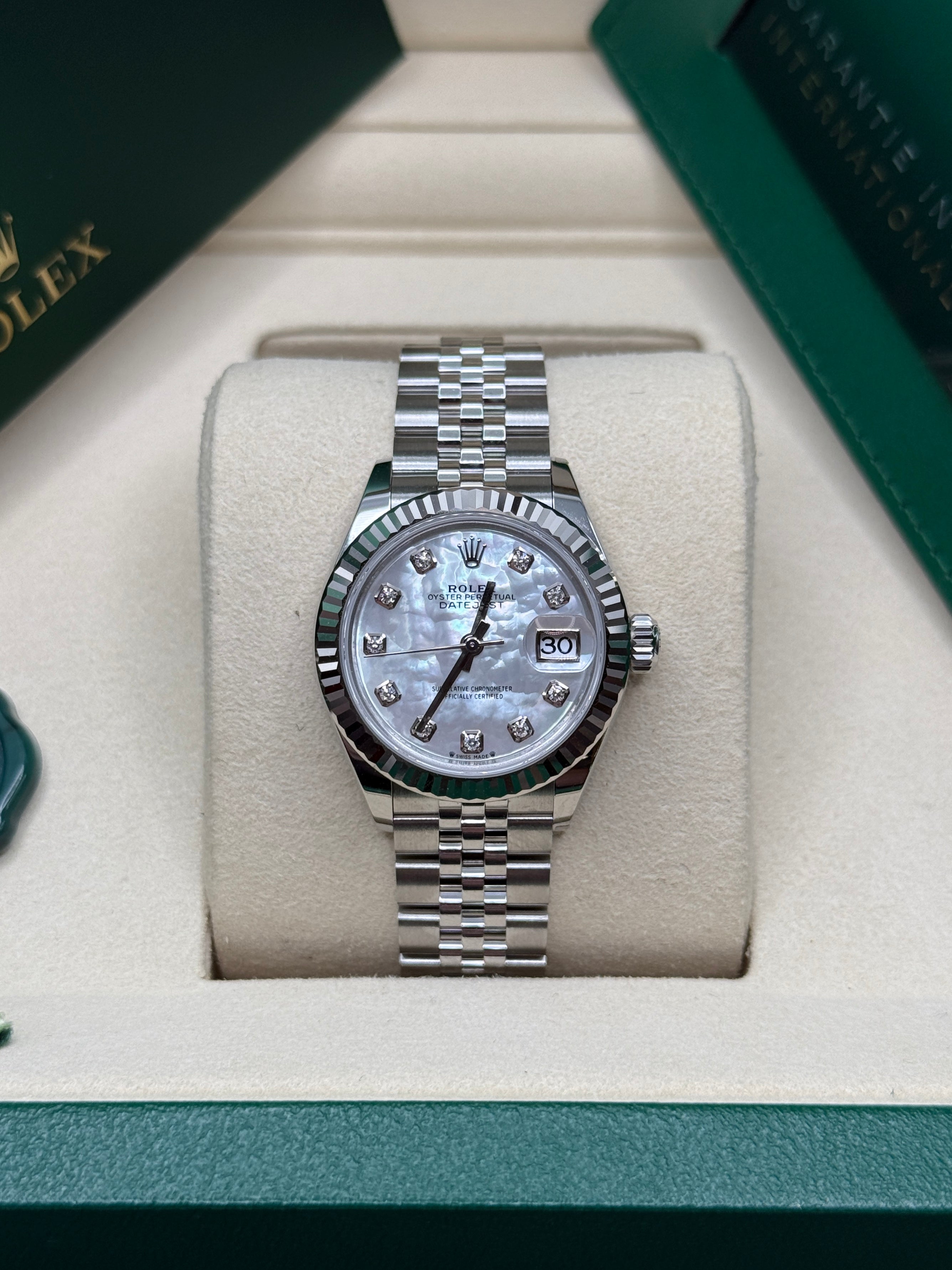 The classic Rolex feminine watch, the Lady-Datejust concentrates all the attributes of the Datejust, the brand’s emblematic watch that has been a byword for style and technical performance ever since its launch in 1945. The women’s version of this date chronometer, the Lady-Datejust, which first appeared in 1957, carries the elegance of the Datejust in a small 28 mm size particularly suited to a slender wrist. The Lady-Datejust upholds the hallmark features of the Datejust line, with a self-winding, waterproof Oyster case that is robust yet graceful. Its calibre 2236 movement, crafted entirely by Rolex, ensures precision and performance. The Lady-Datejust is guaranteed waterproof to a depth of 100 meters (330 feet), making it a resilient and elegant choice for any occasion.