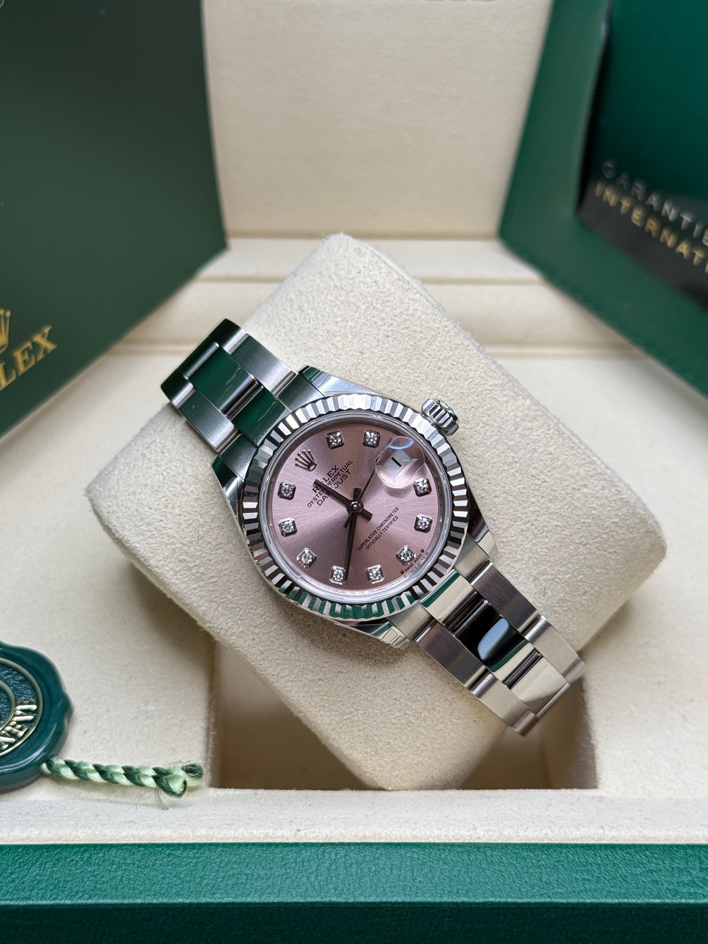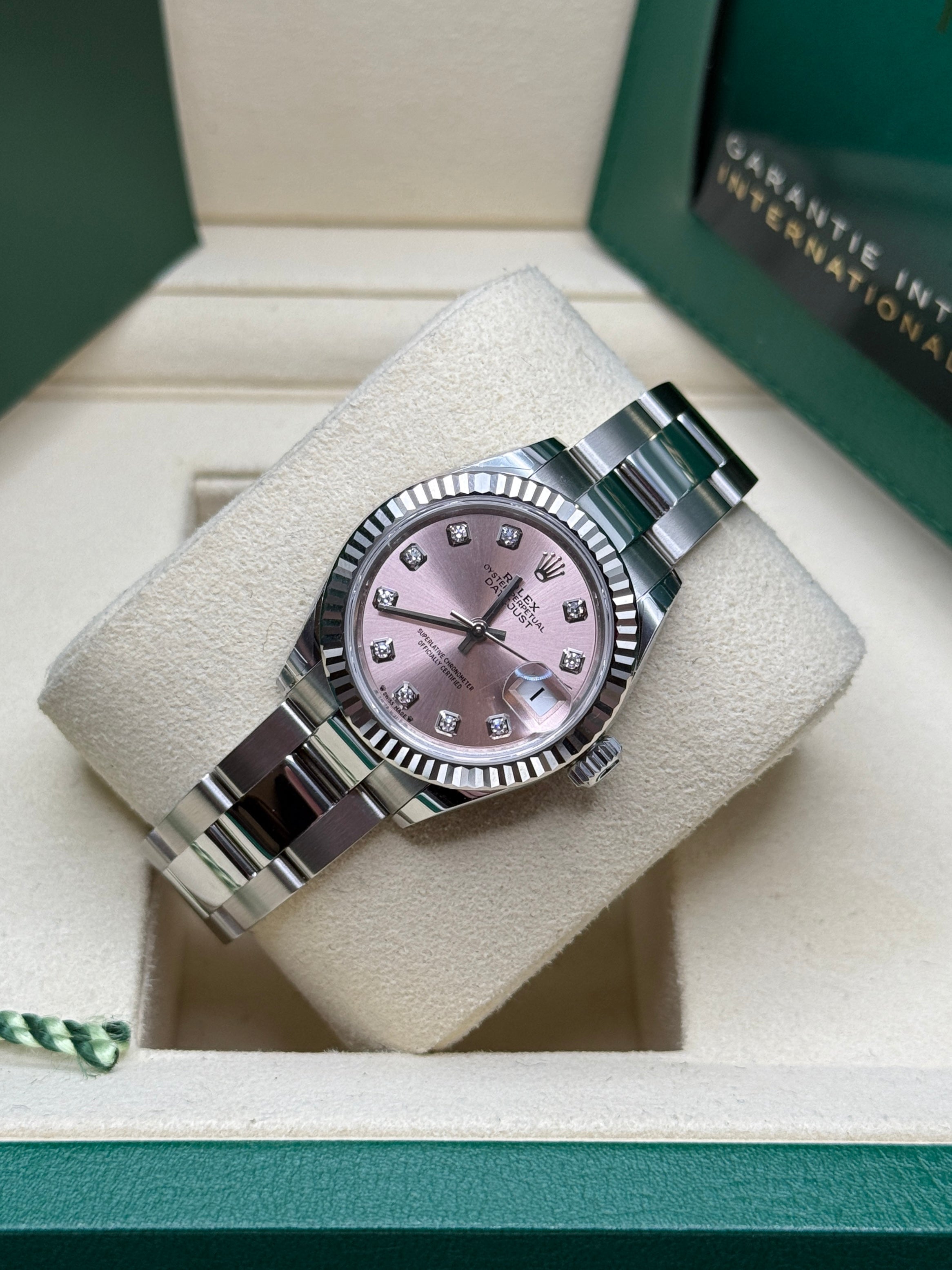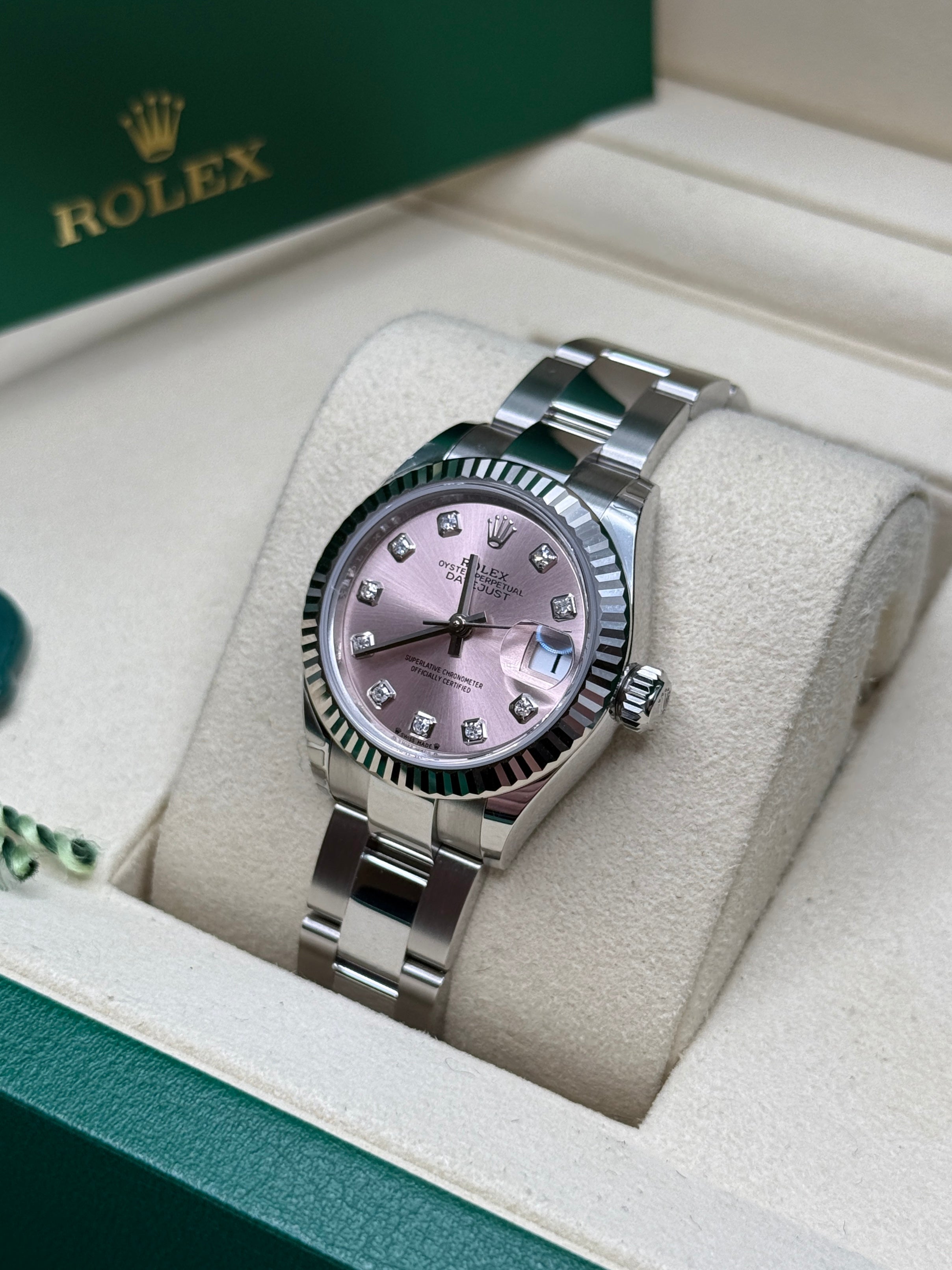 The classic Rolex feminine watch, the Lady-Datejust concentrates all the attributes of the Datejust, the brand’s emblematic watch that has been a byword for style and technical performance ever since its launch in 1945. The women’s version of this date chronometer, the Lady-Datejust, which first appeared in 1957, carries the elegance of the Datejust in a small 28 mm size particularly suited to a slender wrist. The Lady-Datejust upholds the hallmark features of the Datejust line, with a self-winding, waterproof Oyster case that is robust yet graceful. Its calibre 2236 movement, crafted entirely by Rolex, ensures precision and performance. The Lady-Datejust is guaranteed waterproof to a depth of 100 meters (330 feet), making it a resilient and elegant choice for any occasion.