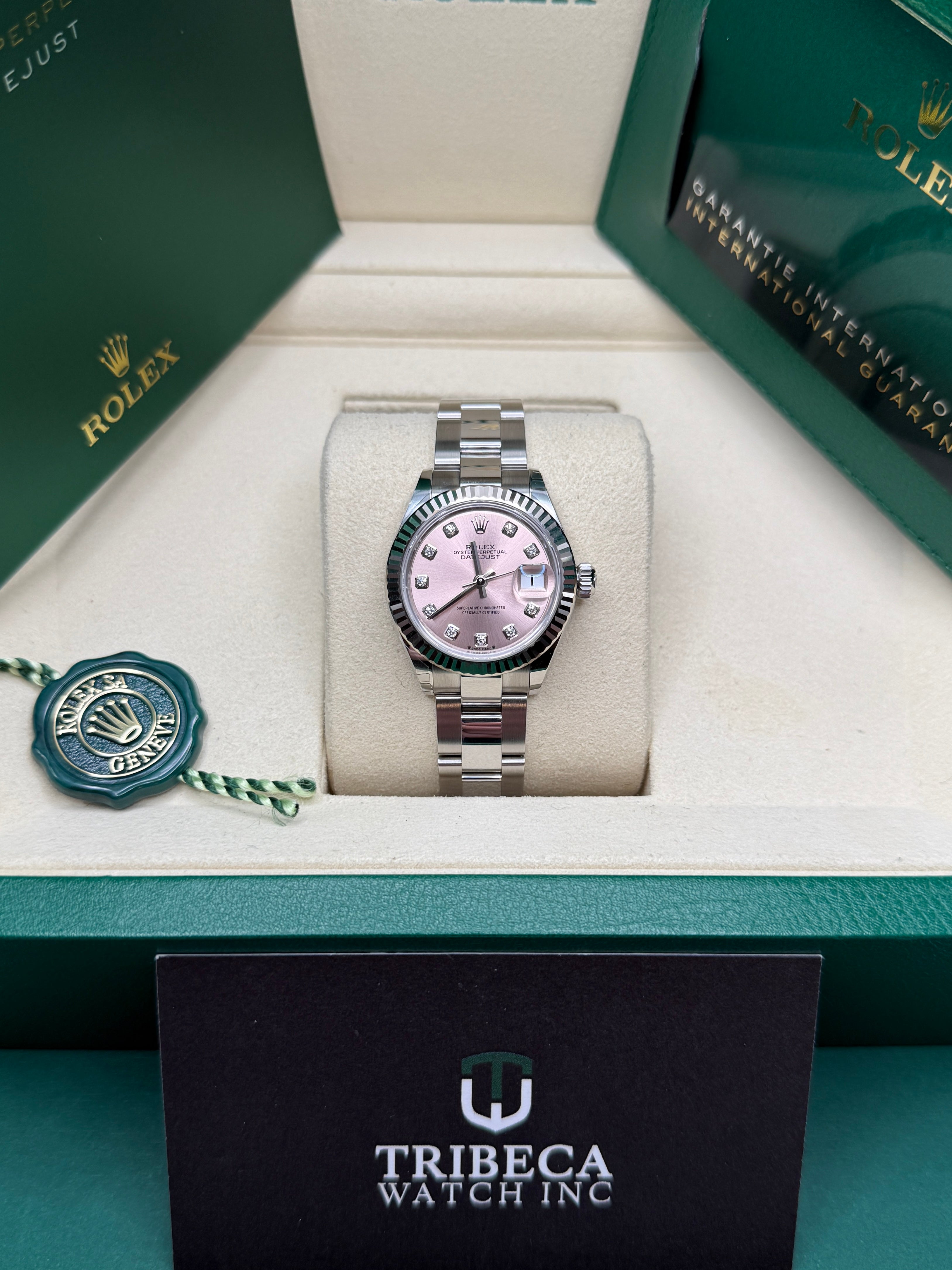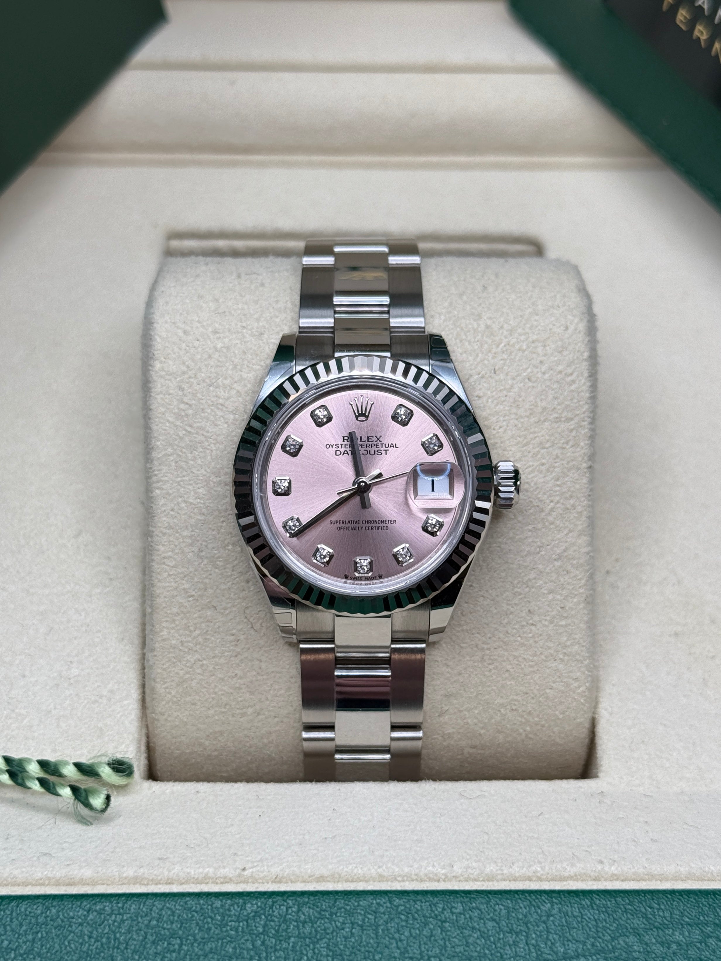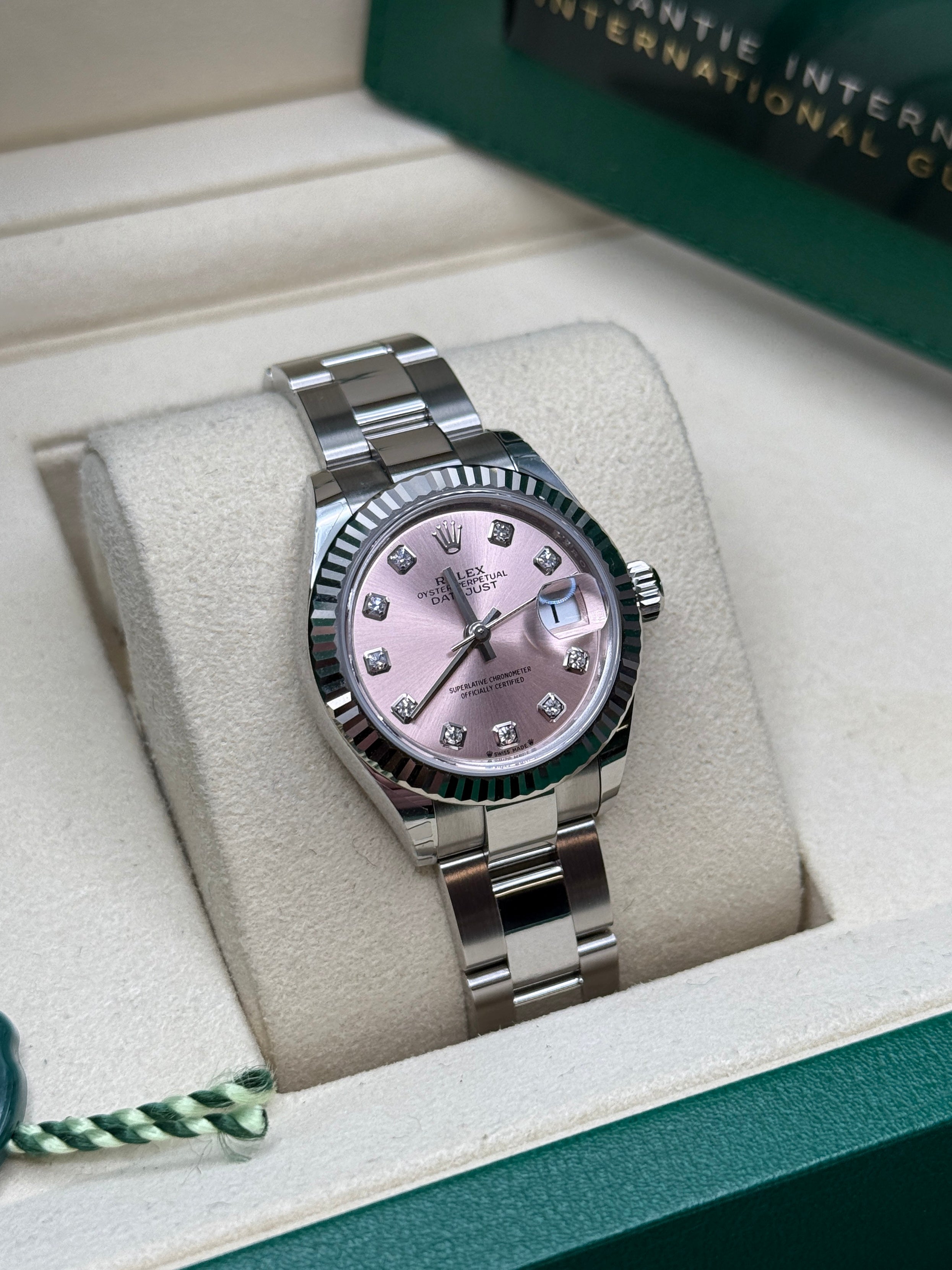 The classic Rolex feminine watch, the Lady-Datejust concentrates all the attributes of the Datejust, the brand’s emblematic watch that has been a byword for style and technical performance ever since its launch in 1945. The women’s version of this date chronometer, the Lady-Datejust, which first appeared in 1957, carries the elegance of the Datejust in a small 28 mm size particularly suited to a slender wrist. The Lady-Datejust upholds the hallmark features of the Datejust line, with a self-winding, waterproof Oyster case that is robust yet graceful. Its calibre 2236 movement, crafted entirely by Rolex, ensures precision and performance. The Lady-Datejust is guaranteed waterproof to a depth of 100 meters (330 feet), making it a resilient and elegant choice for any occasion.