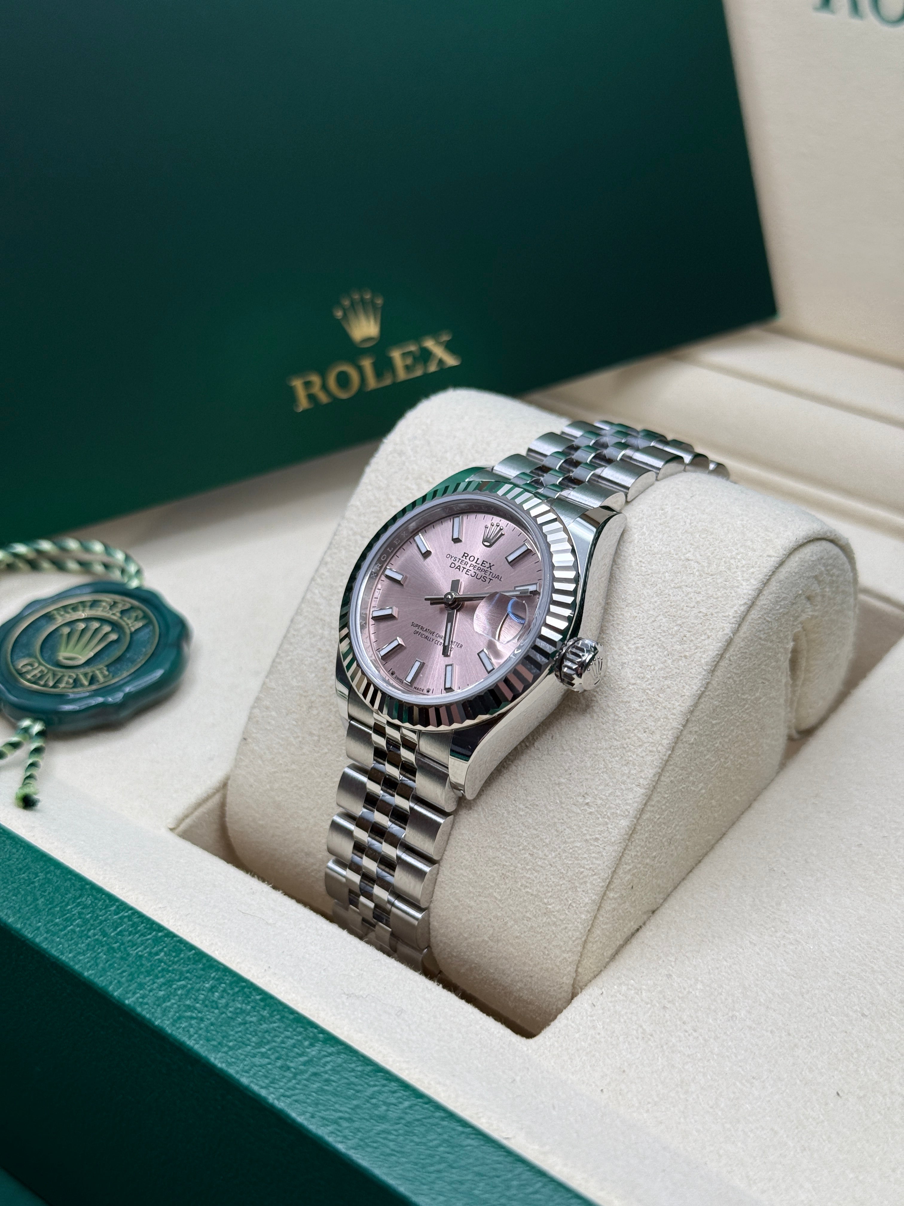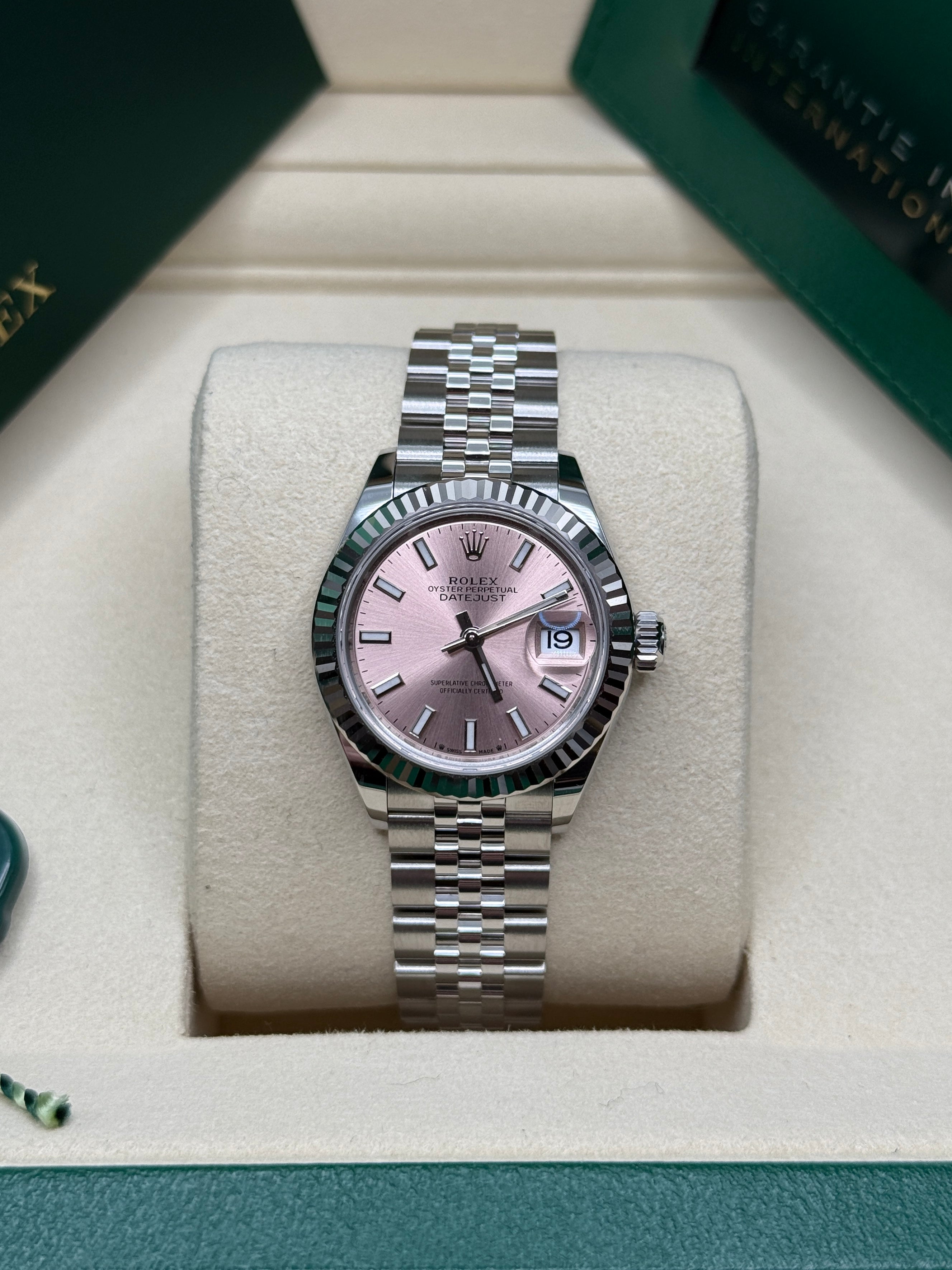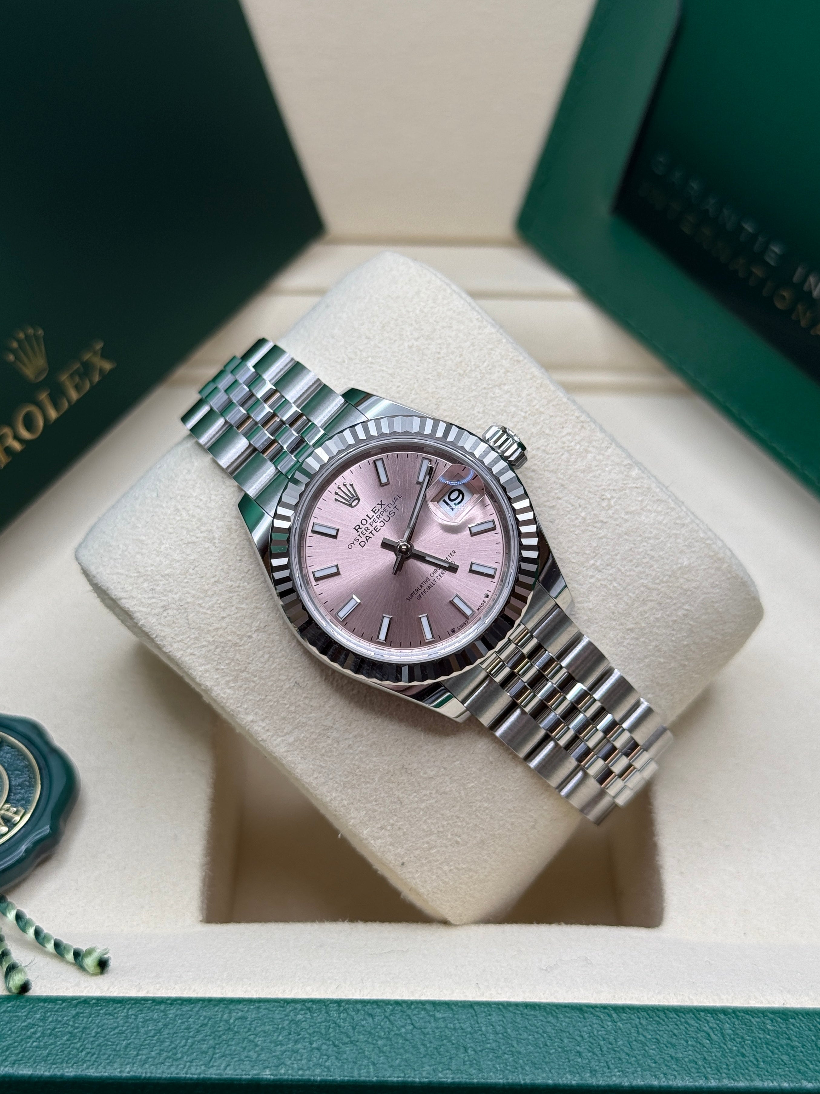 The classic Rolex feminine watch, the Lady-Datejust concentrates all the attributes of the Datejust, the brand’s emblematic watch that has been a byword for style and technical performance ever since its launch in 1945. The women’s version of this date chronometer, the Lady-Datejust, which first appeared in 1957, carries the elegance of the Datejust in a small 28 mm size particularly suited to a slender wrist. The Lady-Datejust upholds the hallmark features of the Datejust line, with a self-winding, waterproof Oyster case that is robust yet graceful. Its calibre 2236 movement, crafted entirely by Rolex, ensures precision and performance. The Lady-Datejust is guaranteed waterproof to a depth of 100 meters (330 feet), making it a resilient and elegant choice for any occasion.