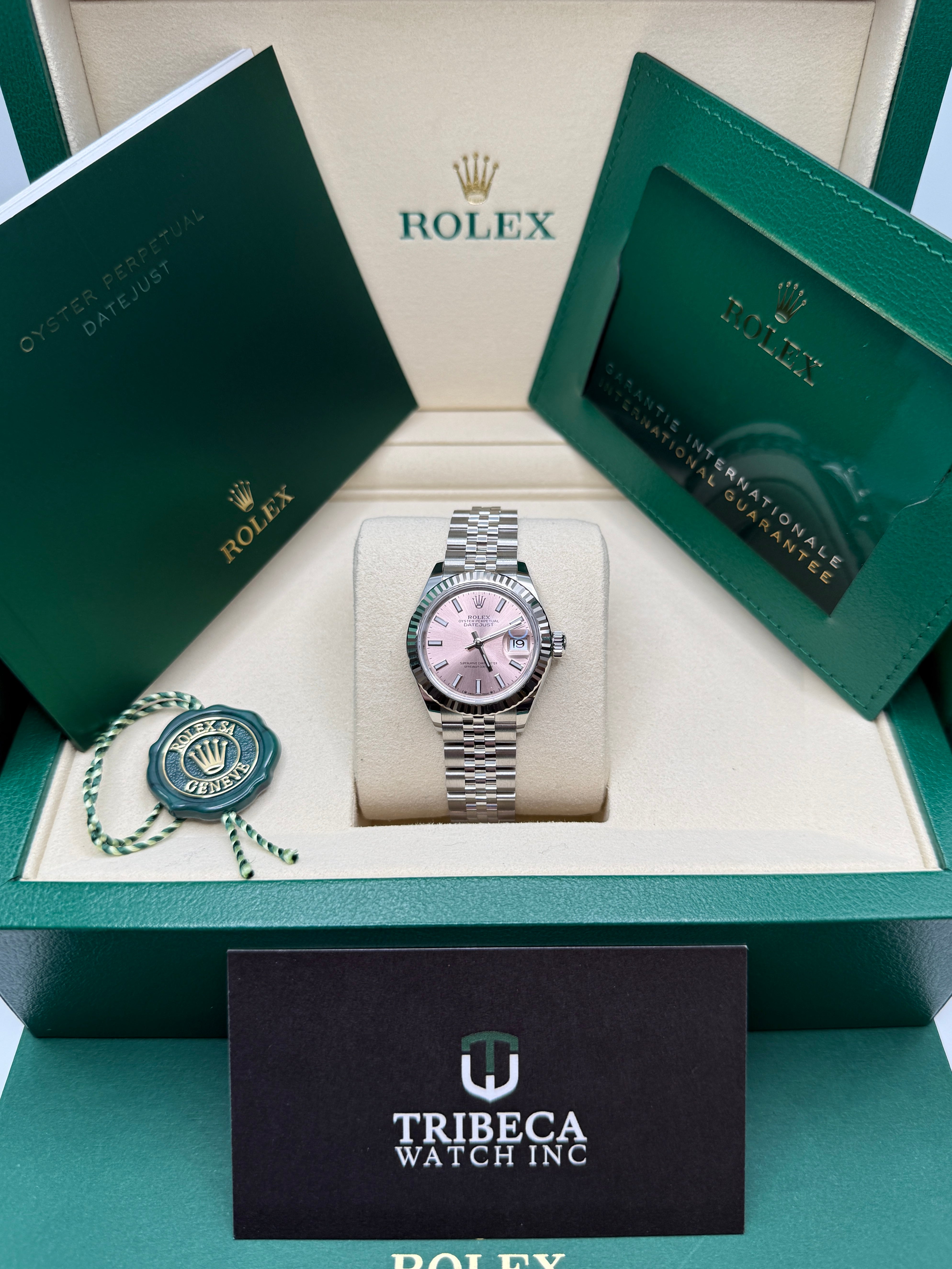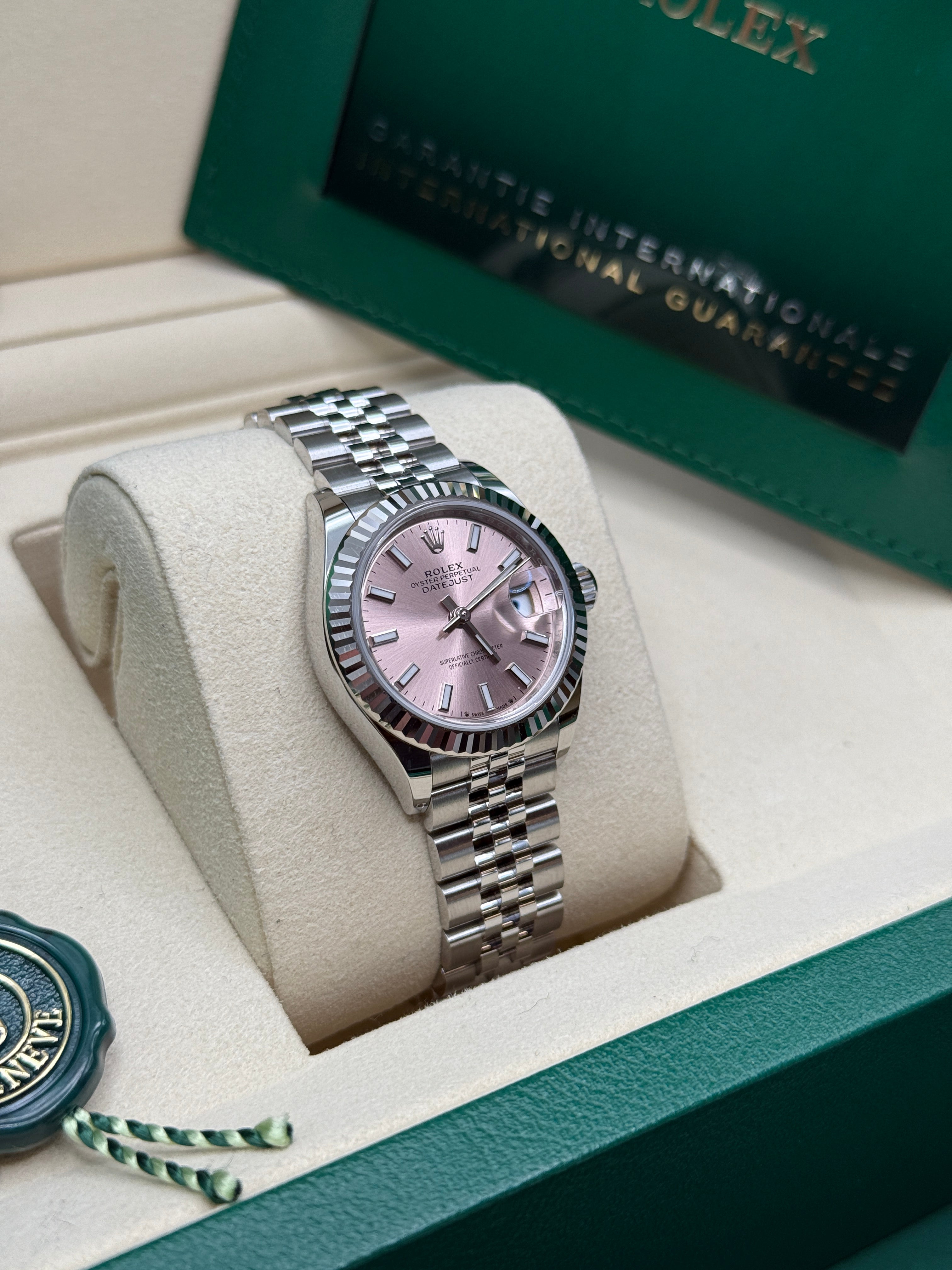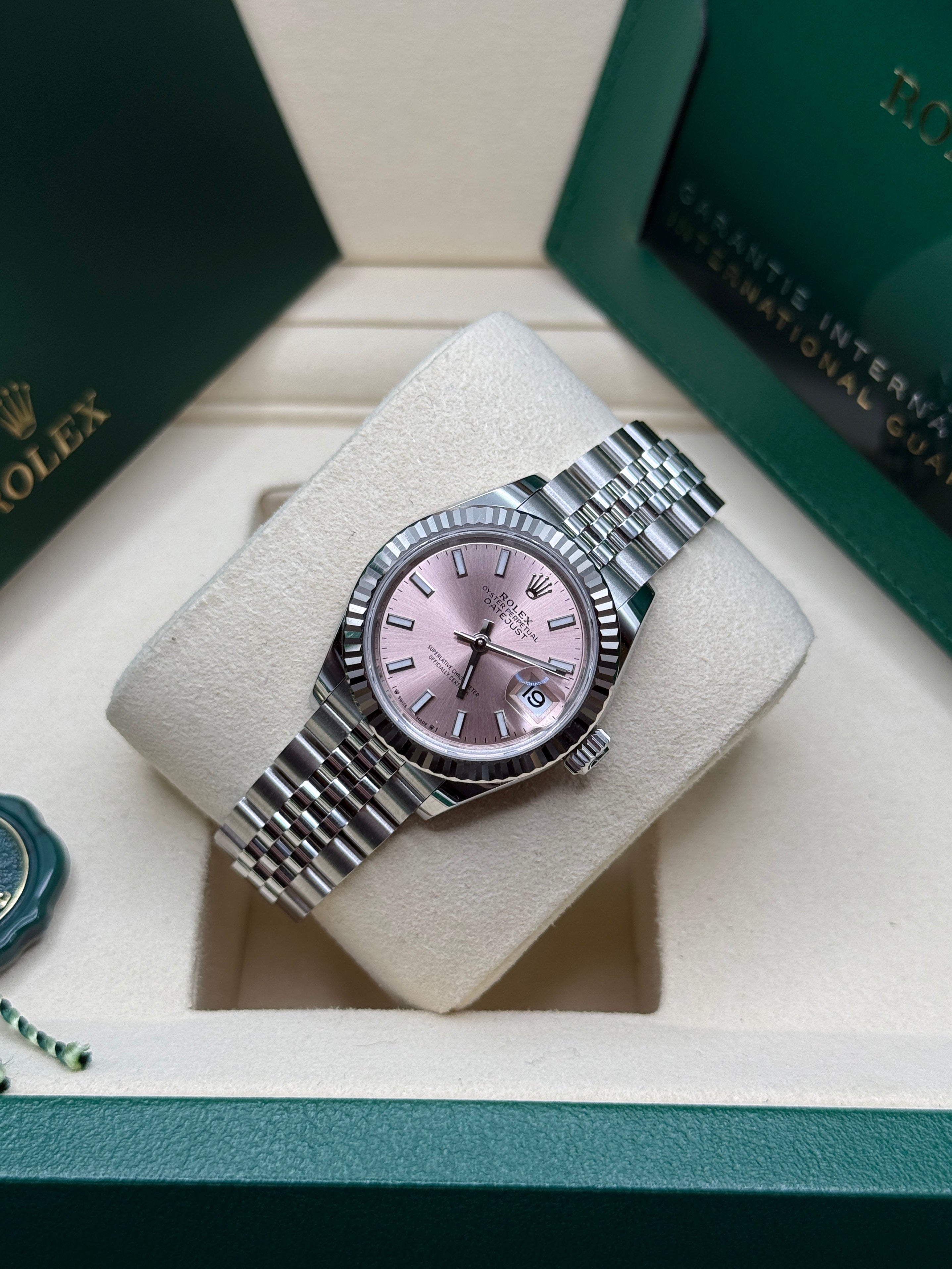The classic Rolex feminine watch, the Lady-Datejust concentrates all the attributes of the Datejust, the brand’s emblematic watch that has been a byword for style and technical performance ever since its launch in 1945. The women’s version of this date chronometer, the Lady-Datejust, which first appeared in 1957, carries the elegance of the Datejust in a small 28 mm size particularly suited to a slender wrist. The Lady-Datejust upholds the hallmark features of the Datejust line, with a self-winding, waterproof Oyster case that is robust yet graceful. Its calibre 2236 movement, crafted entirely by Rolex, ensures precision and performance. The Lady-Datejust is guaranteed waterproof to a depth of 100 meters (330 feet), making it a resilient and elegant choice for any occasion.
