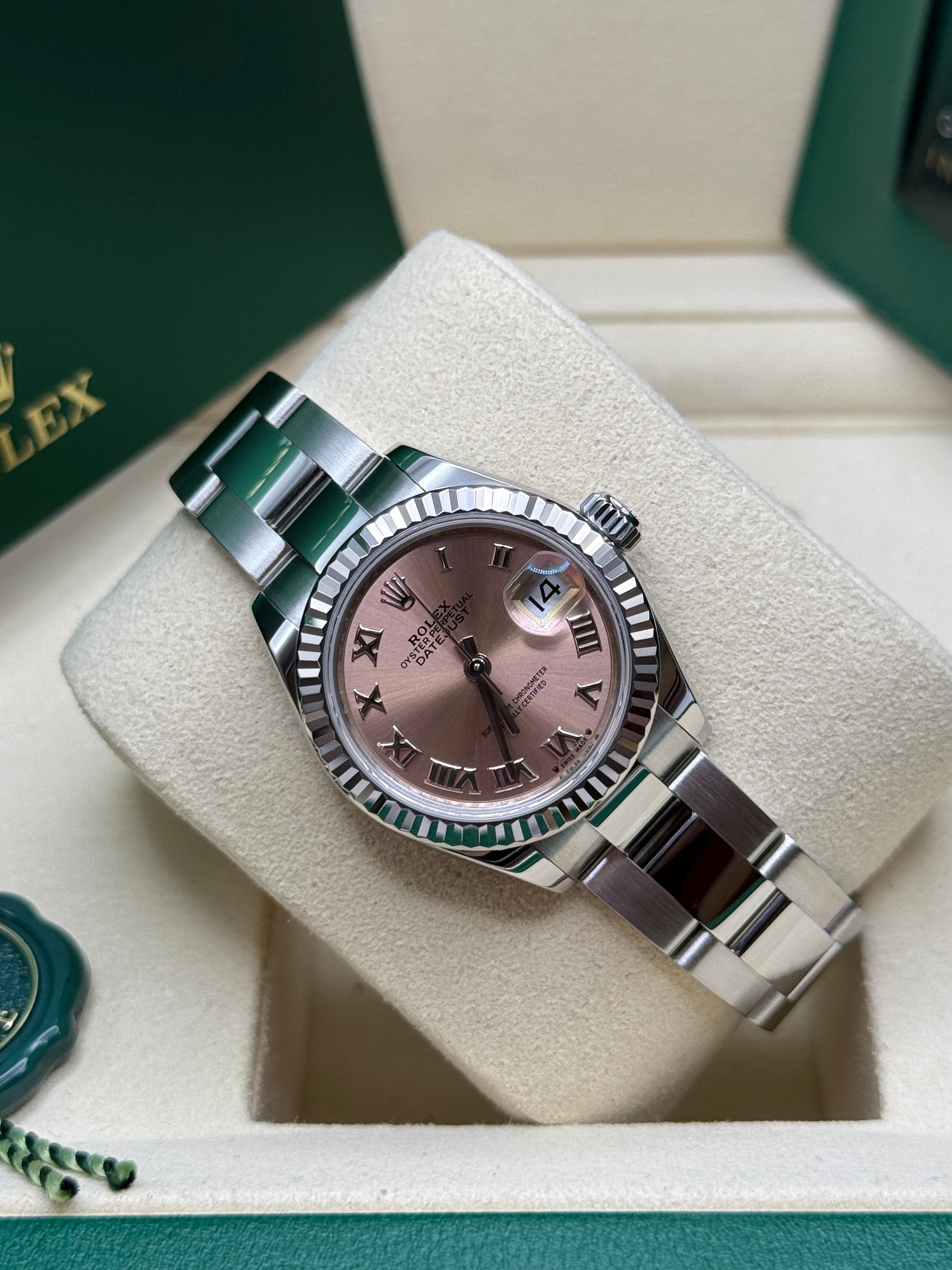 The classic Rolex feminine watch, the Lady-Datejust concentrates all the attributes of the Datejust, the brand’s emblematic watch that has been a byword for style and technical performance ever since its launch in 1945. The women’s version of this date chronometer, the Lady-Datejust, which first appeared in 1957, carries the elegance of the Datejust in a small 28 mm size particularly suited to a slender wrist. The Lady-Datejust upholds the hallmark features of the Datejust line, with a self-winding, waterproof Oyster case that is robust yet graceful. Its calibre 2236 movement, crafted entirely by Rolex, ensures precision and performance. The Lady-Datejust is guaranteed waterproof to a depth of 100 meters (330 feet), making it a resilient and elegant choice for any occasion.