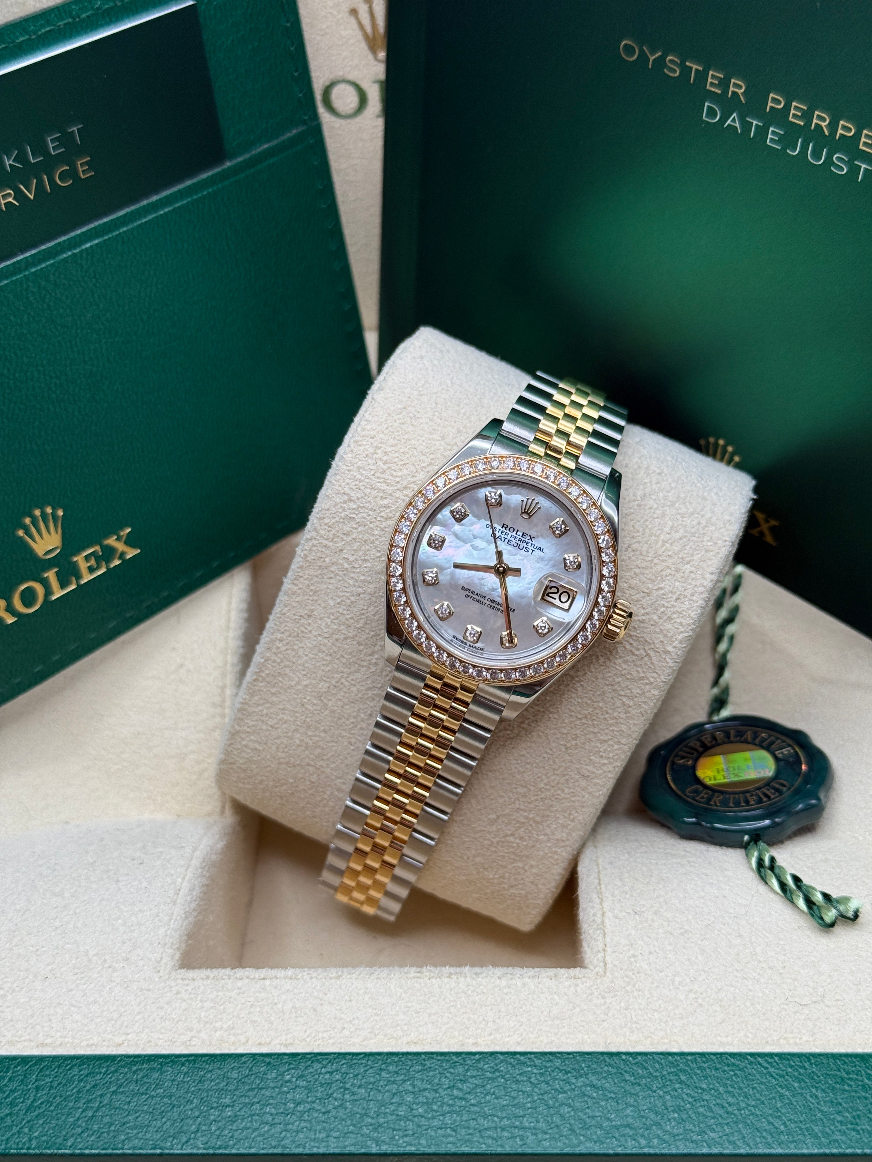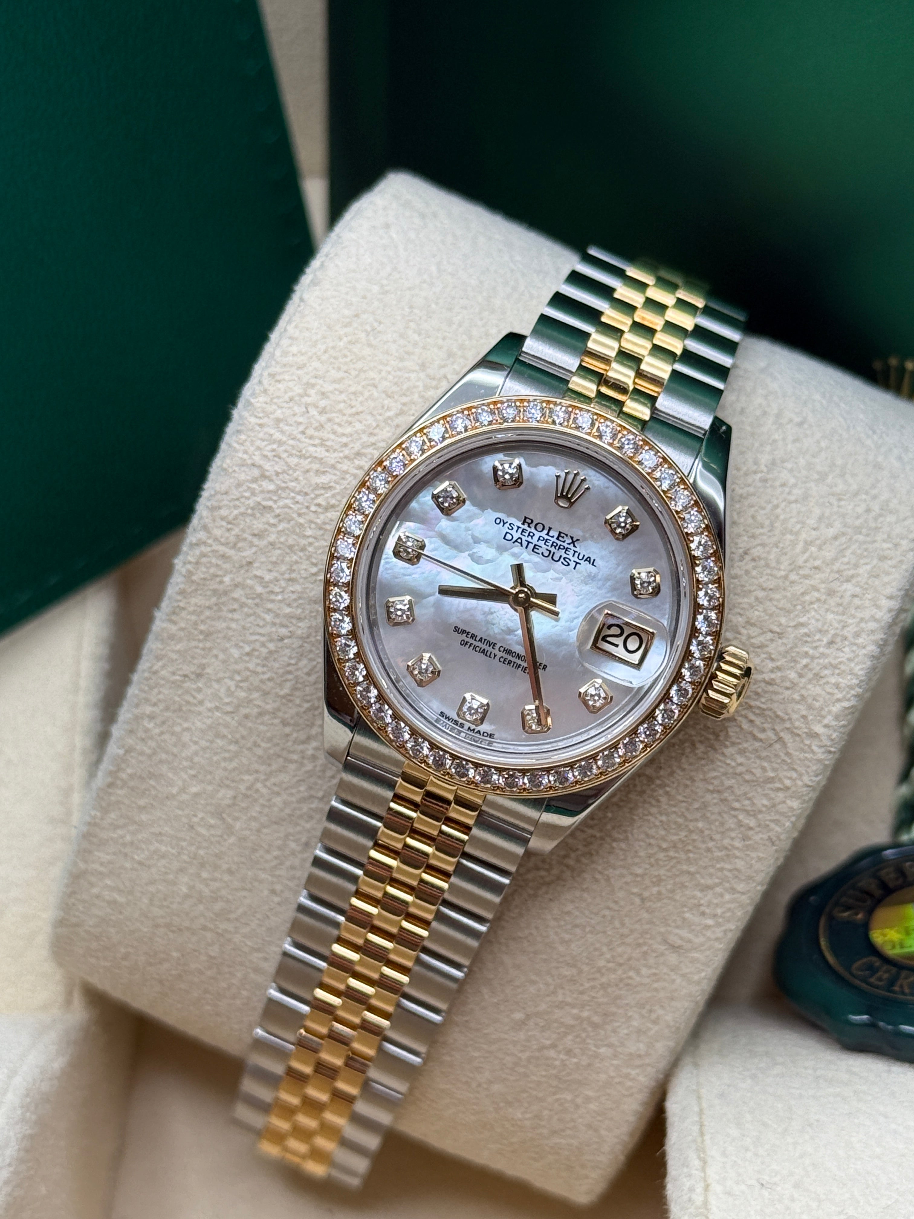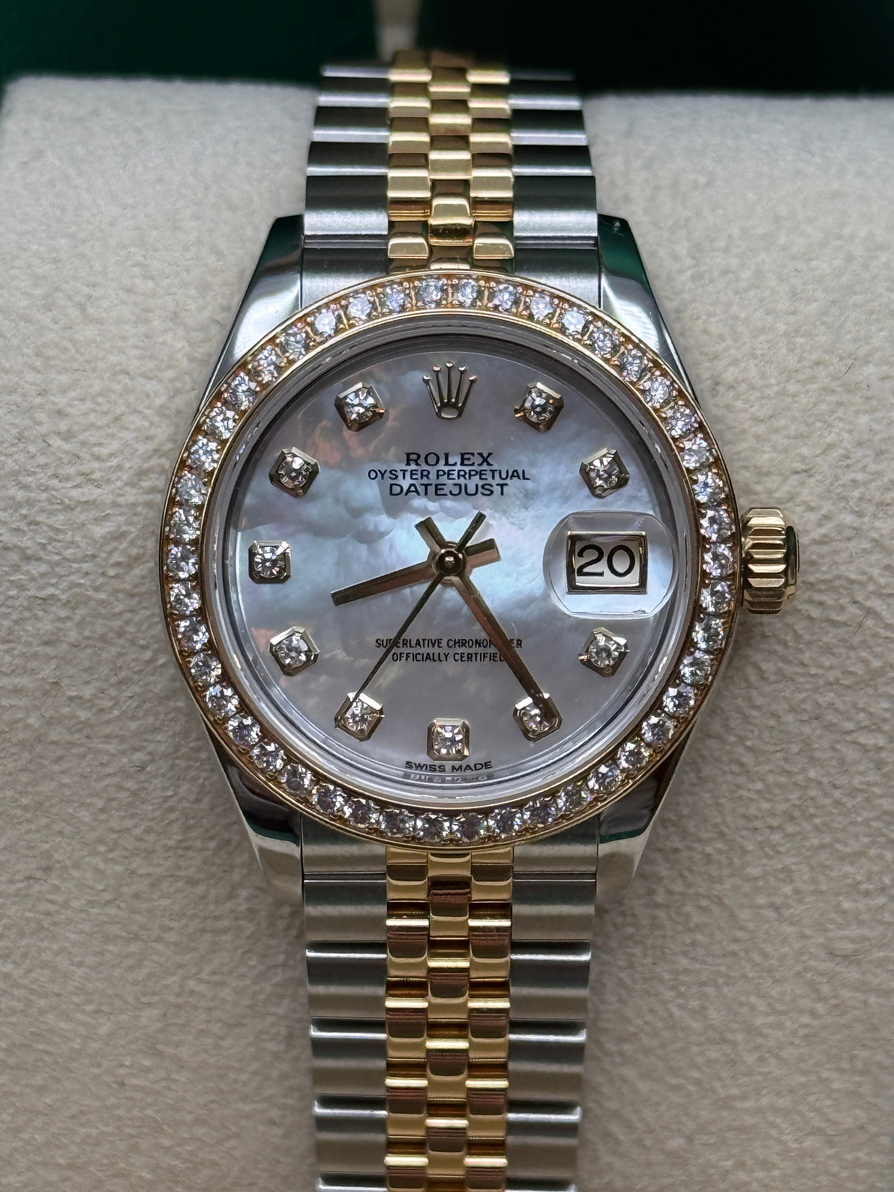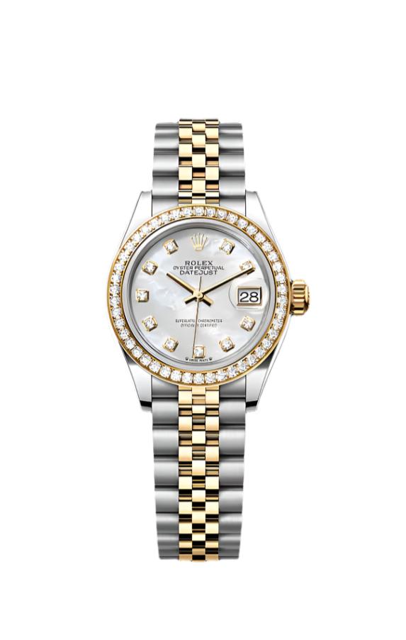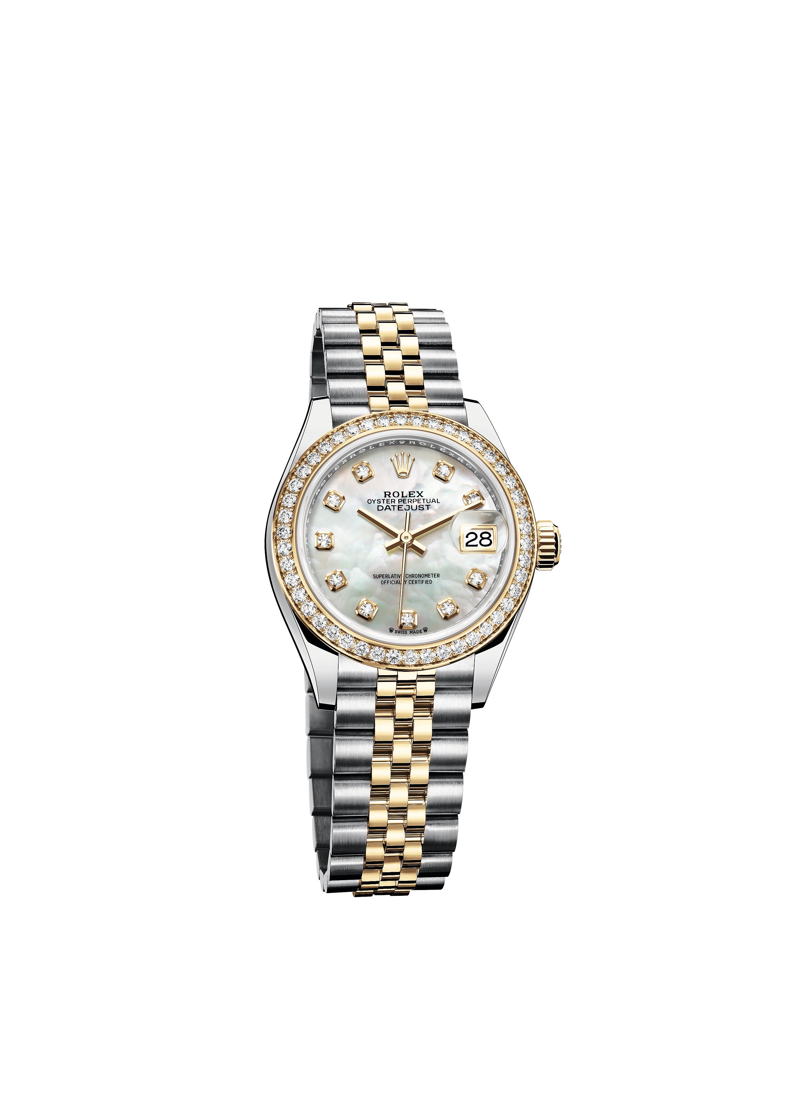 The classic Rolex feminine watch, the Lady-Datejust concentrates all the attributes of the Datejust, the brand’s emblematic watch that has been a byword for style and technical performance ever since its launch in 1945. The women’s version of this date chronometer, the Lady-Datejust, which first appeared in 1957, carries the elegance of the Datejust in a small 28 mm size particularly suited to a slender wrist. The Lady-Datejust upholds the hallmark features of the Datejust line, with a self-winding, waterproof Oyster case that is robust yet graceful. Its calibre 2236 movement, crafted entirely by Rolex, ensures precision and performance. The Lady-Datejust is guaranteed waterproof to a depth of 100 meters (330 feet), making it a resilient and elegant choice for any occasion.