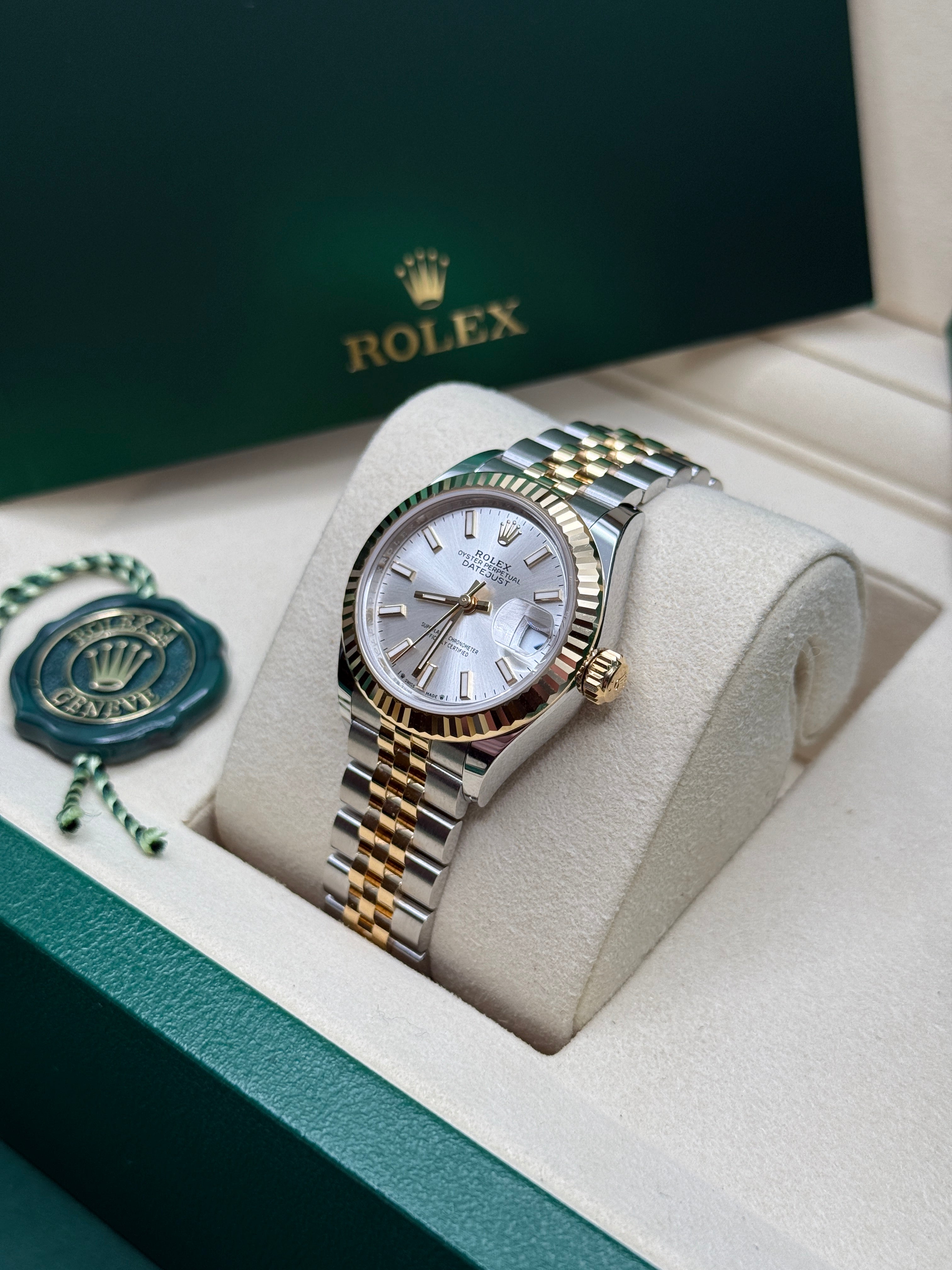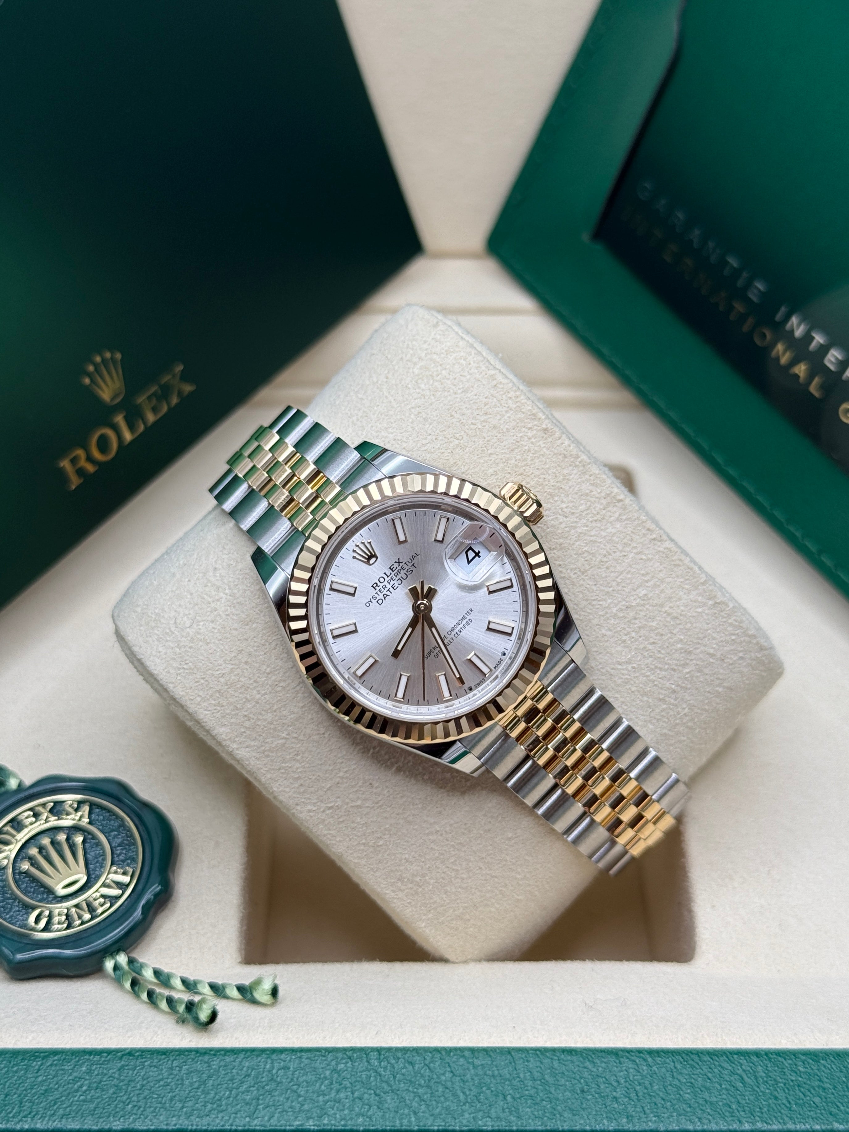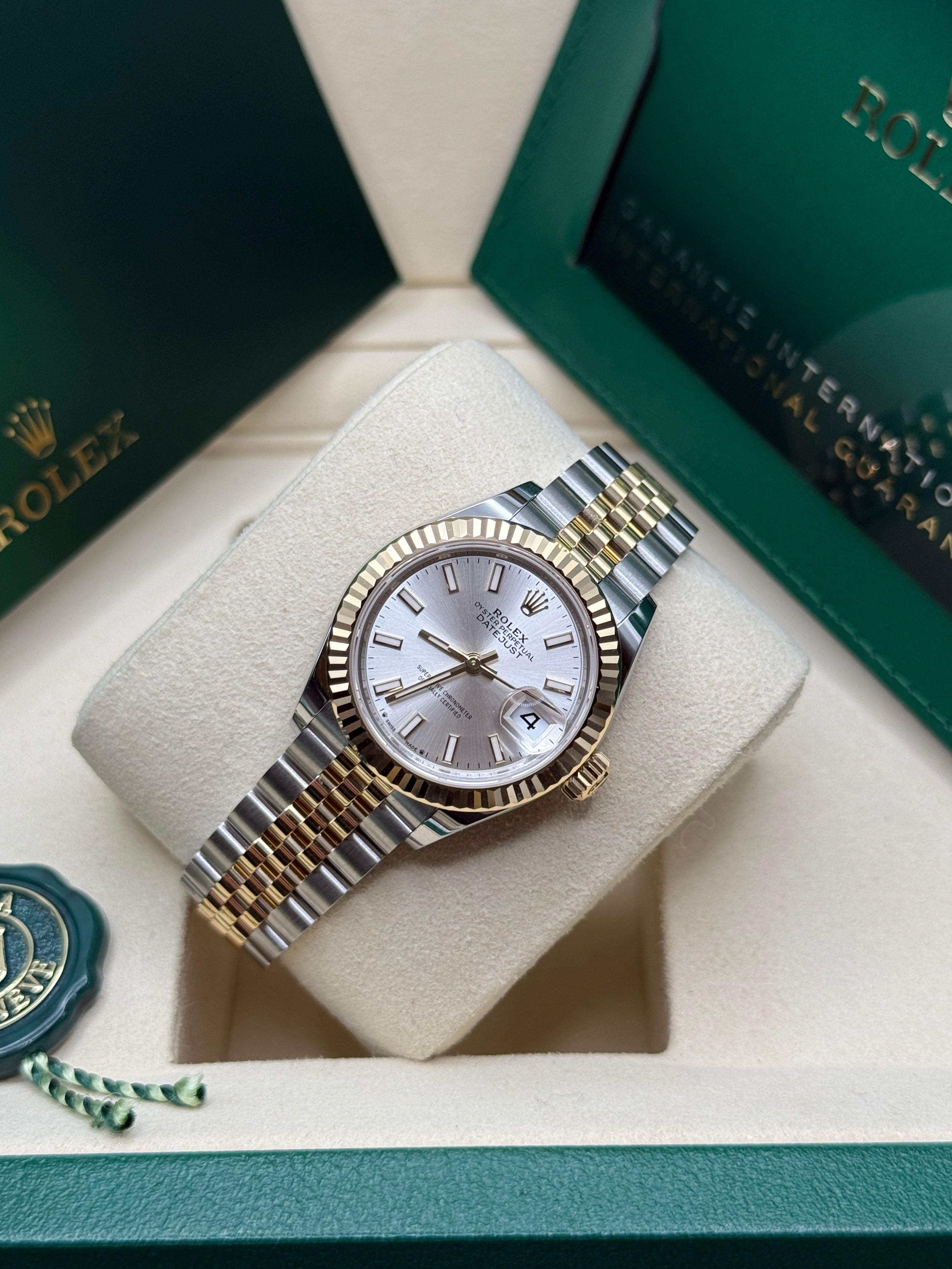 The classic Rolex feminine watch, the Lady-Datejust concentrates all the attributes of the Datejust, the brand’s emblematic watch that has been a byword for style and technical performance ever since its launch in 1945. The women’s version of this date chronometer, the Lady-Datejust, which first appeared in 1957, carries the elegance of the Datejust in a small 28 mm size particularly suited to a slender wrist. The Lady-Datejust upholds the hallmark features of the Datejust line, with a self-winding, waterproof Oyster case that is robust yet graceful. Its calibre 2236 movement, crafted entirely by Rolex, ensures precision and performance. The Lady-Datejust is guaranteed waterproof to a depth of 100 meters (330 feet), making it a resilient and elegant choice for any occasion.