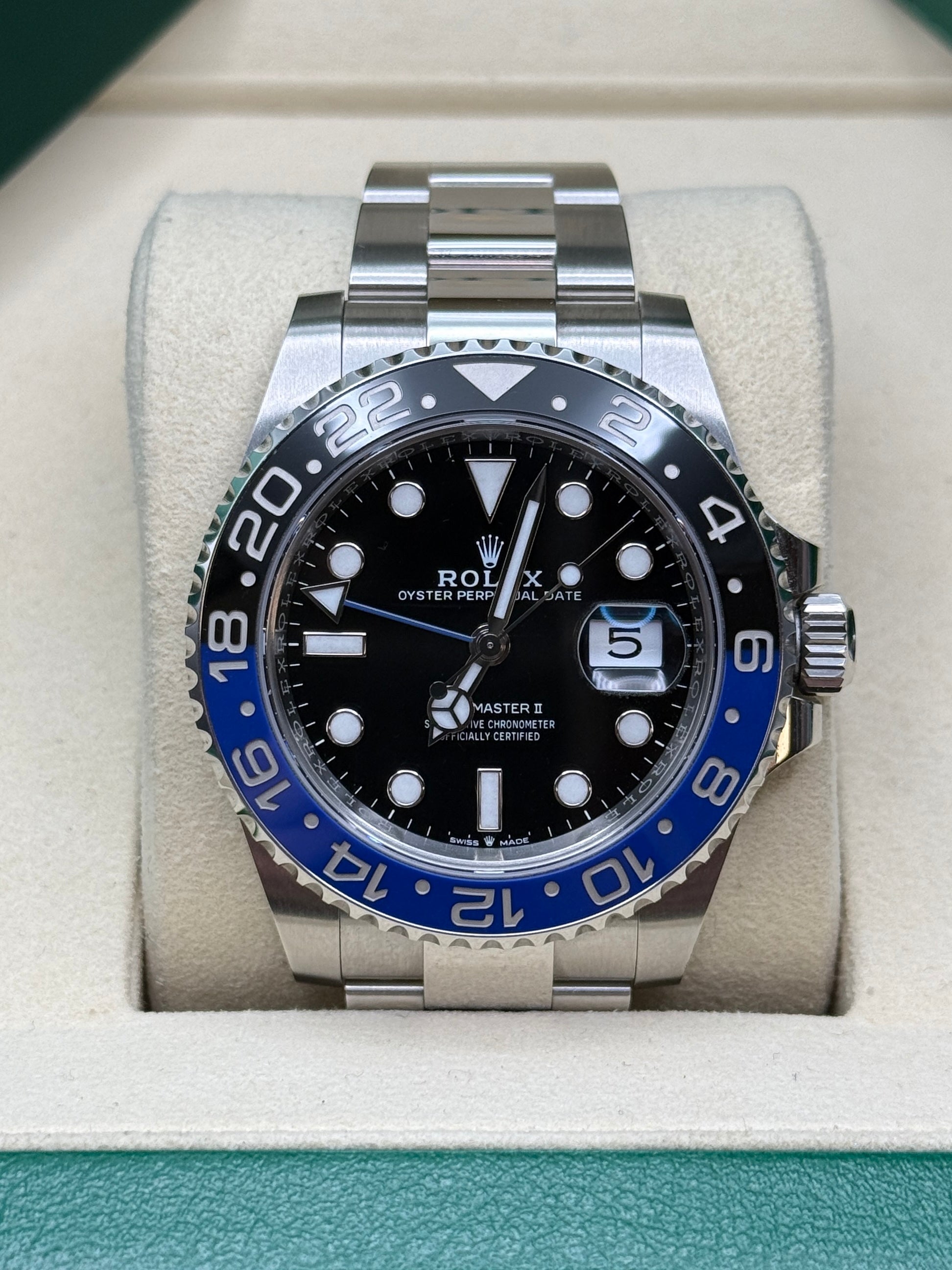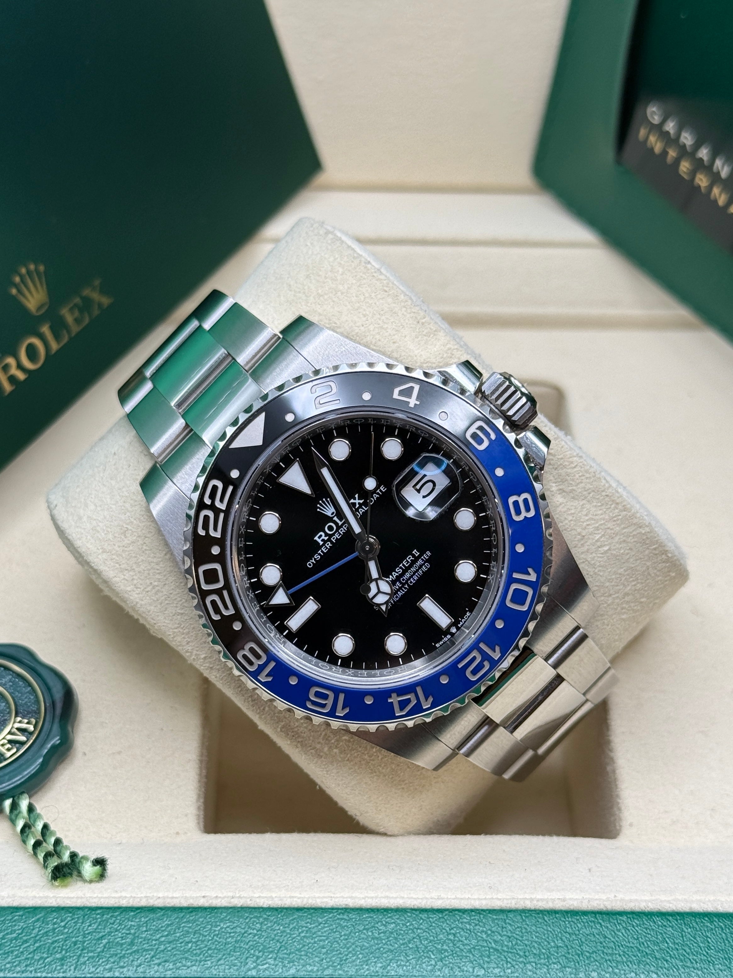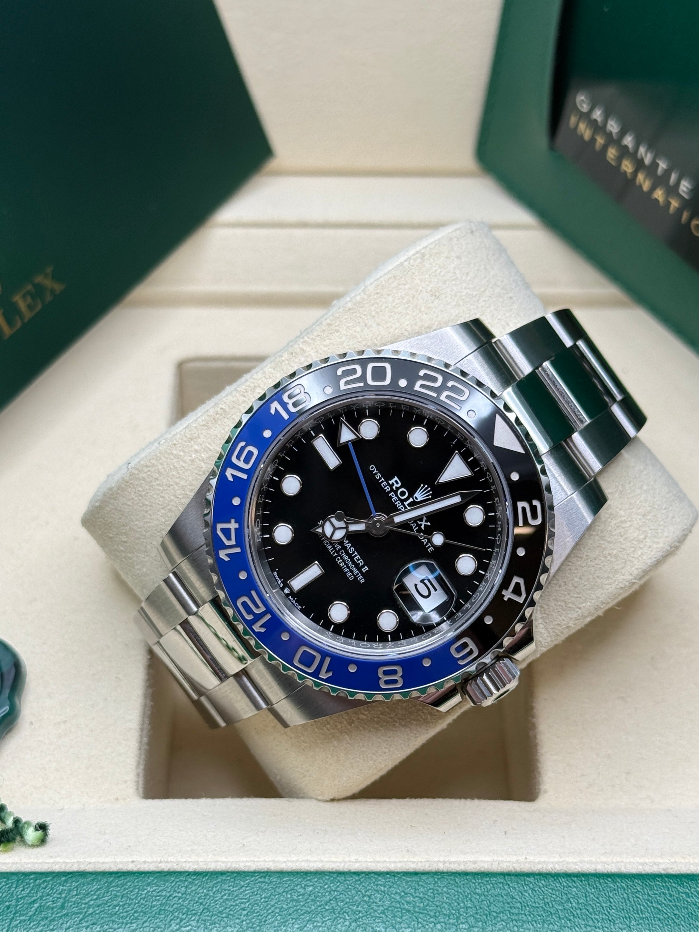 Powered by the Calibre 3285 movement, the Rolex GMT-Master II delivers exceptional precision, reliability, and an impressive power reserve of approximately 70 hours. Its rugged yet elegant Oyster case is waterproof to a depth of 100 meters, ensuring durability in any environment. The watch features a Cerachrom bezel, crafted from high-tech ceramic, which offers superior resistance to scratches and UV rays, maintaining its vibrant color over time. Equipped with an independently adjustable hour hand and 24-hour display, the GMT-Master II allows seamless tracking of multiple time zones, making it a perfect companion for global travelers and watch connoisseurs alike.