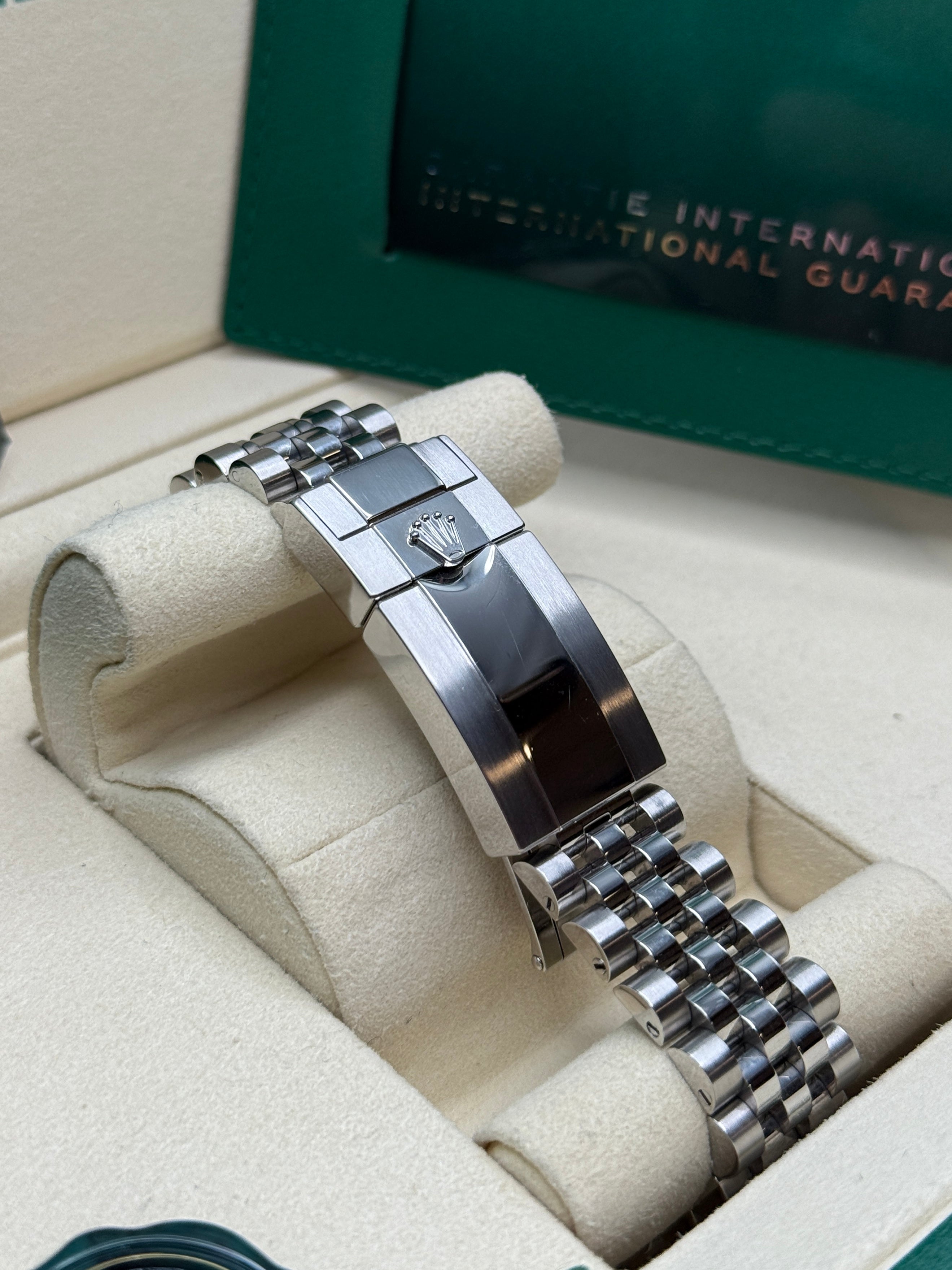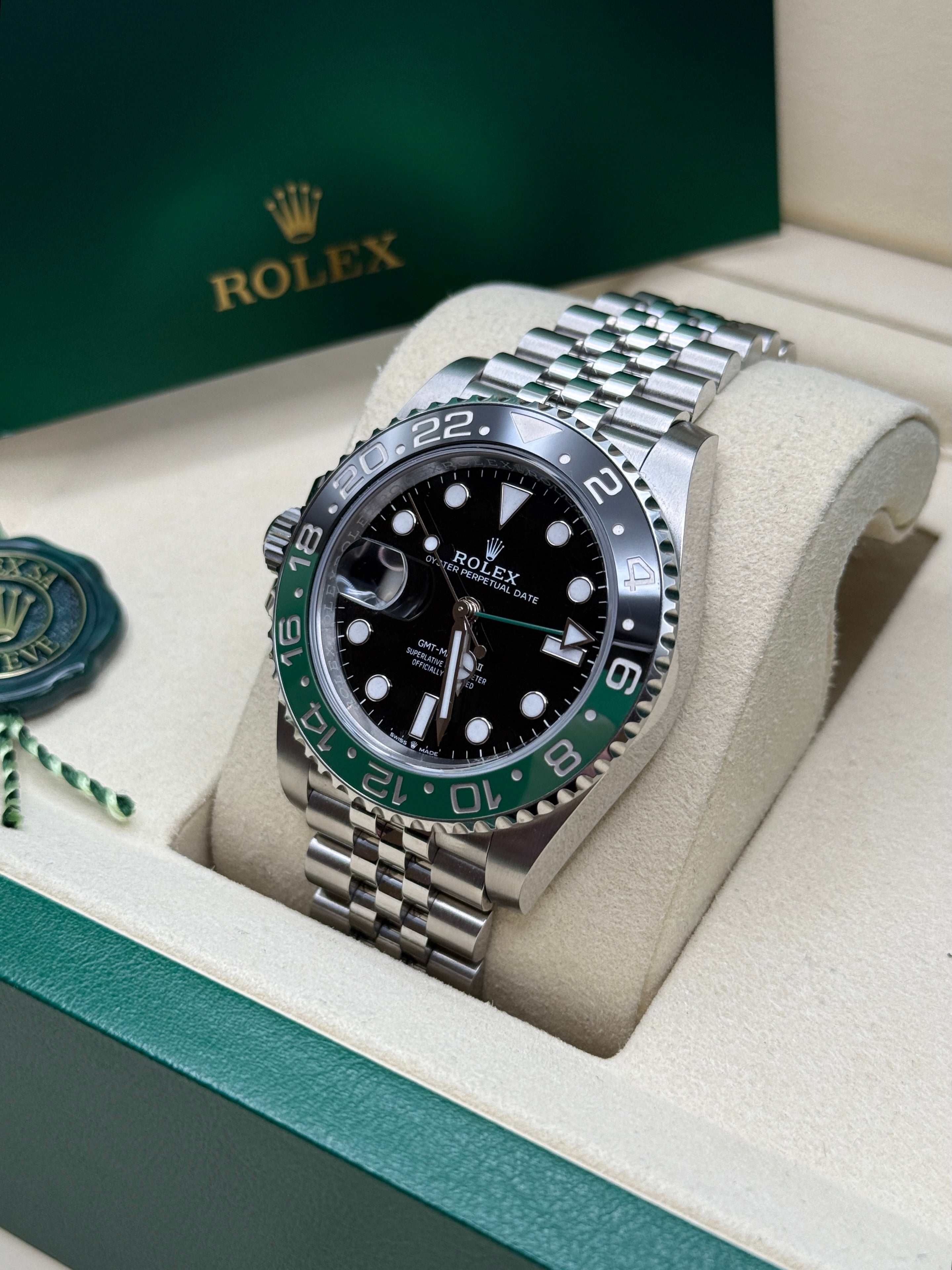 Powered by the Calibre 3285 movement, the Rolex GMT-Master II delivers exceptional precision, reliability, and an impressive power reserve of approximately 70 hours. Its rugged yet elegant Oyster case is waterproof to a depth of 100 meters, ensuring durability in any environment. The watch features a Cerachrom bezel, crafted from high-tech ceramic, which offers superior resistance to scratches and UV rays, maintaining its vibrant color over time. Equipped with an independently adjustable hour hand and 24-hour display, the GMT-Master II allows seamless tracking of multiple time zones, making it a perfect companion for global travelers and watch connoisseurs alike.
