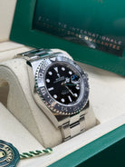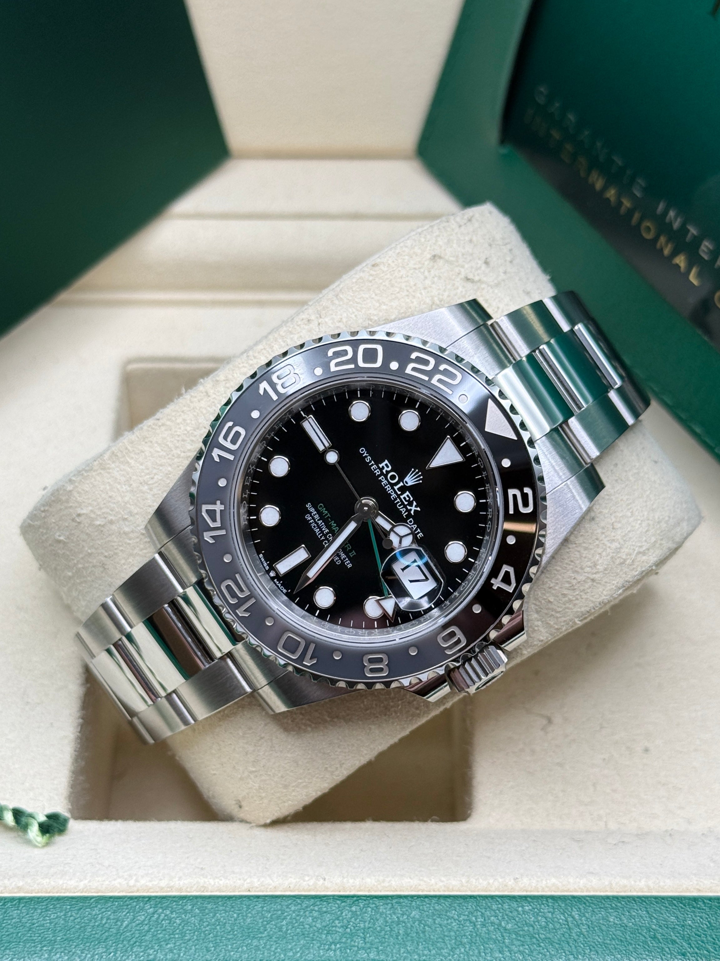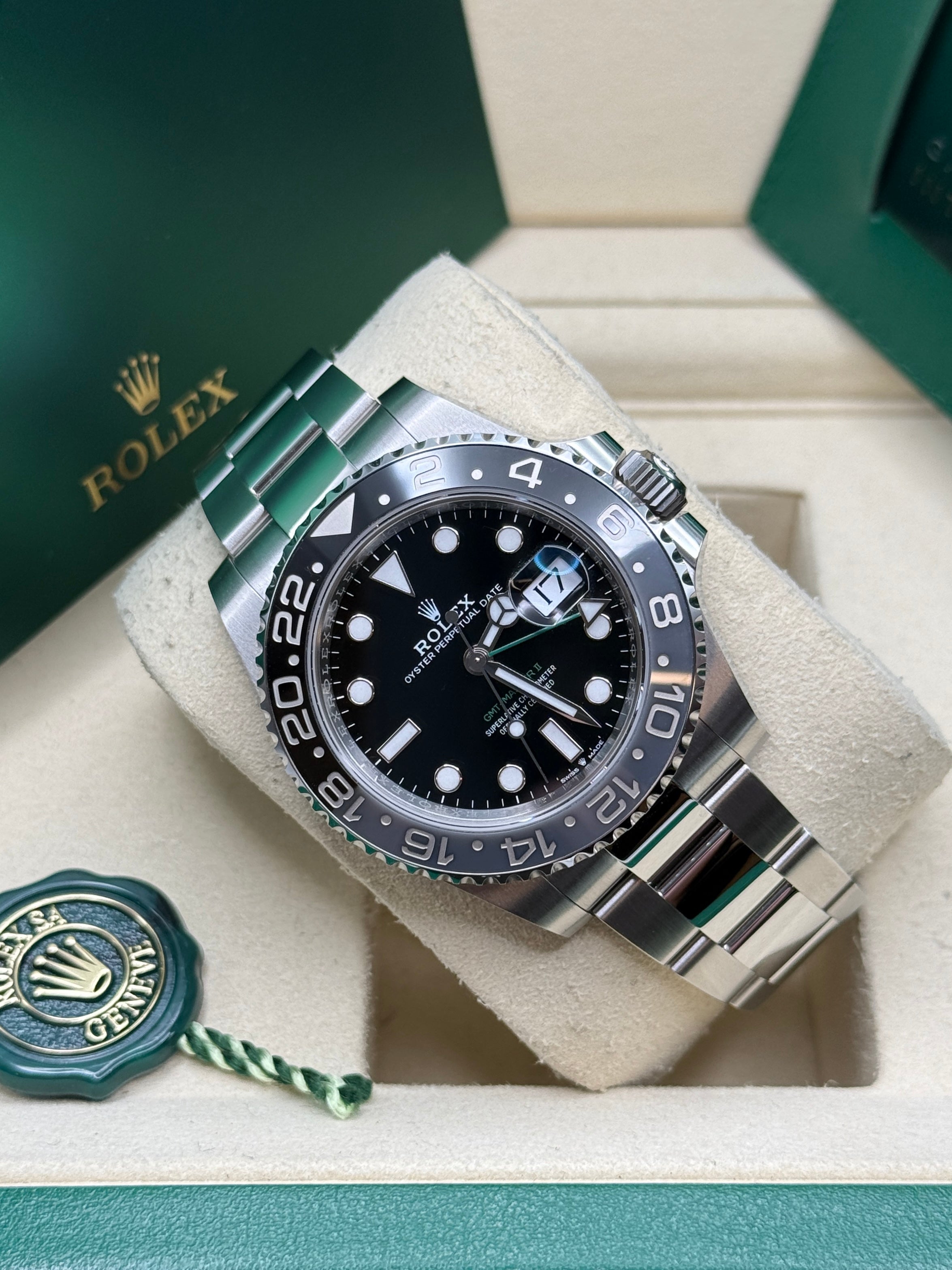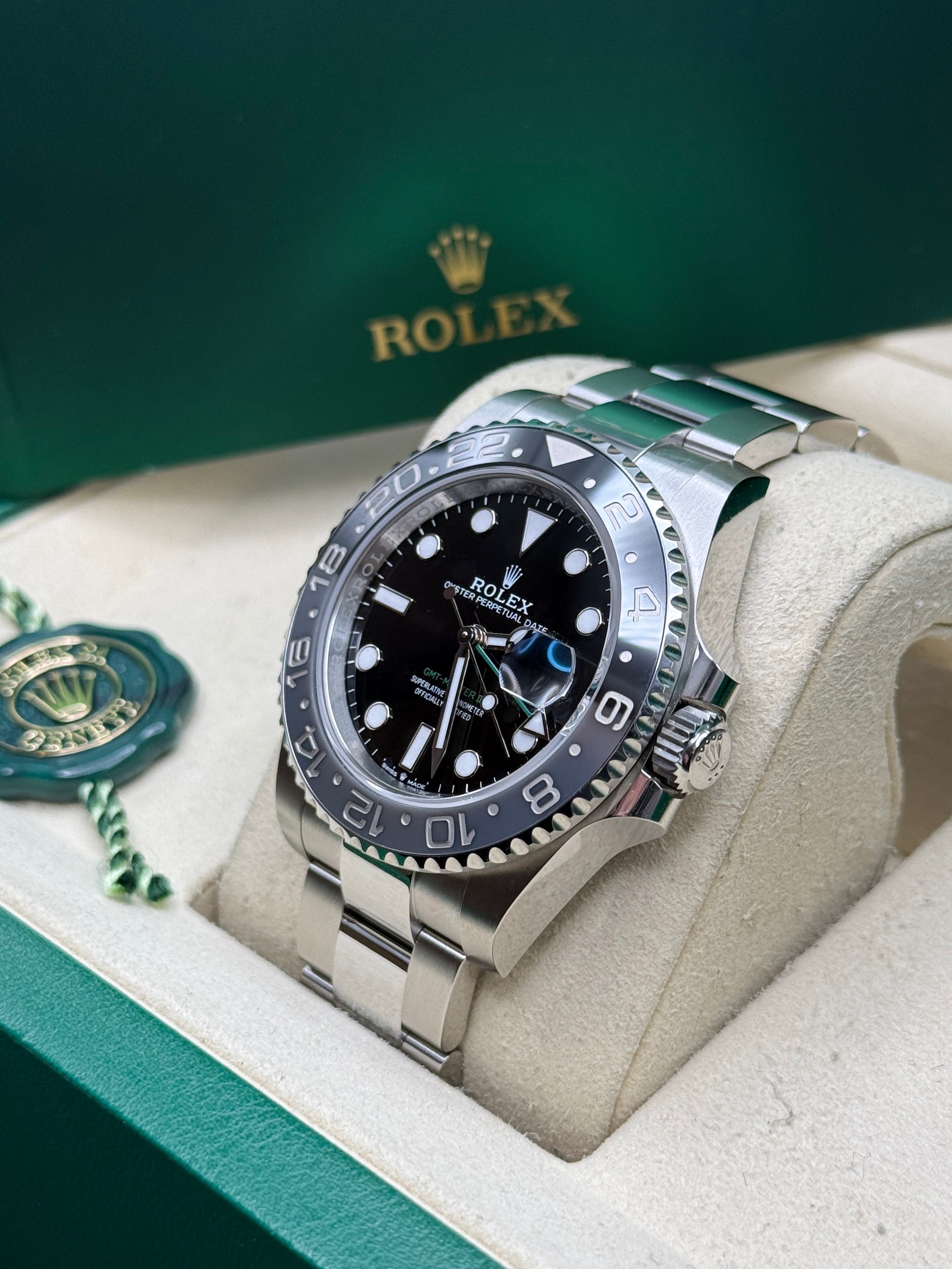 Powered by the Calibre 3285 movement, the Rolex GMT-Master II delivers exceptional precision, reliability, and an impressive power reserve of approximately 70 hours. Its rugged yet elegant Oyster case is waterproof to a depth of 100 meters, ensuring durability in any environment. The watch features a Cerachrom bezel, crafted from high-tech ceramic, which offers superior resistance to scratches and UV rays, maintaining its vibrant color over time. Equipped with an independently adjustable hour hand and 24-hour display, the GMT-Master II allows seamless tracking of multiple time zones, making it a perfect companion for global travelers and watch connoisseurs alike.