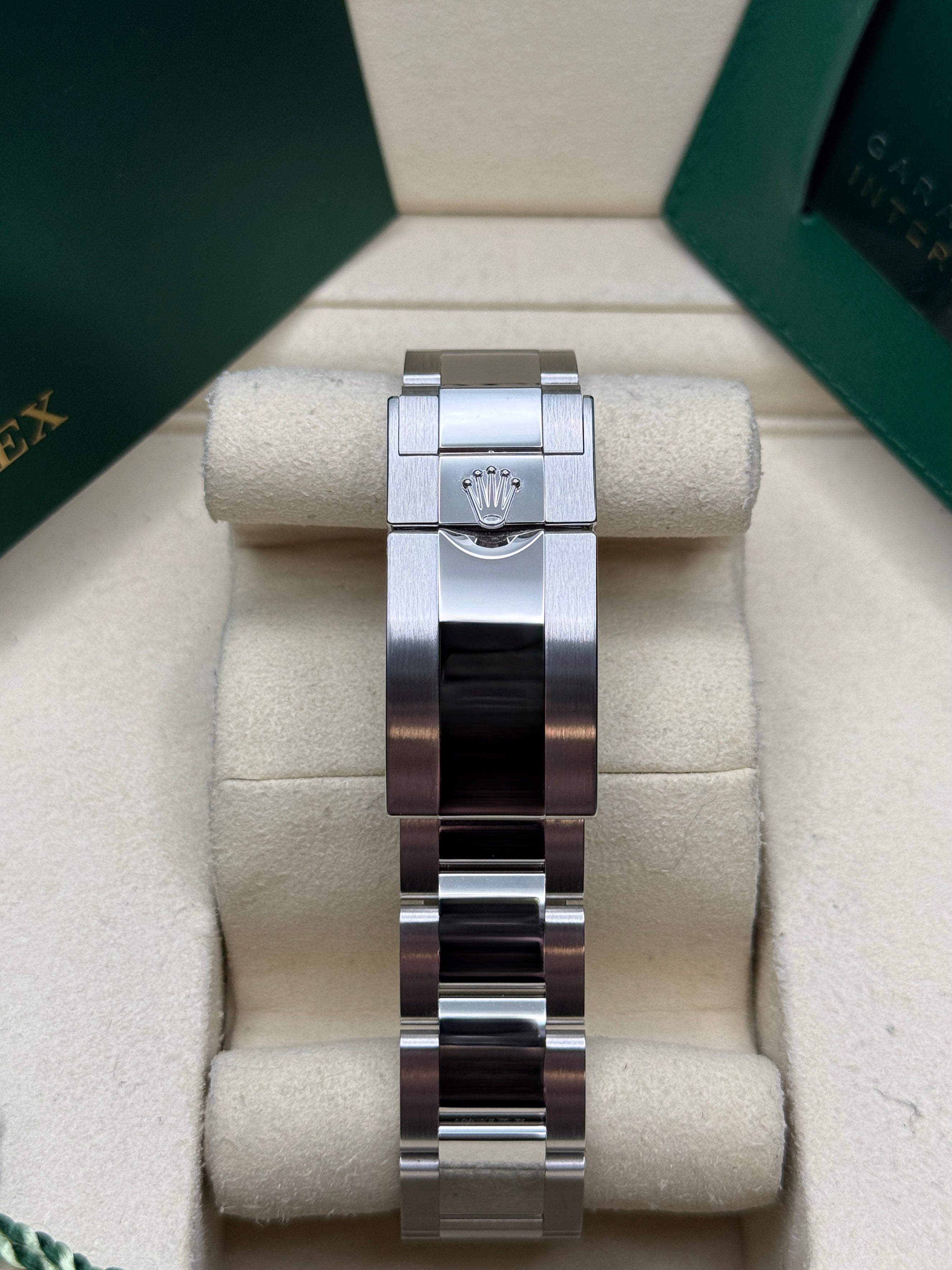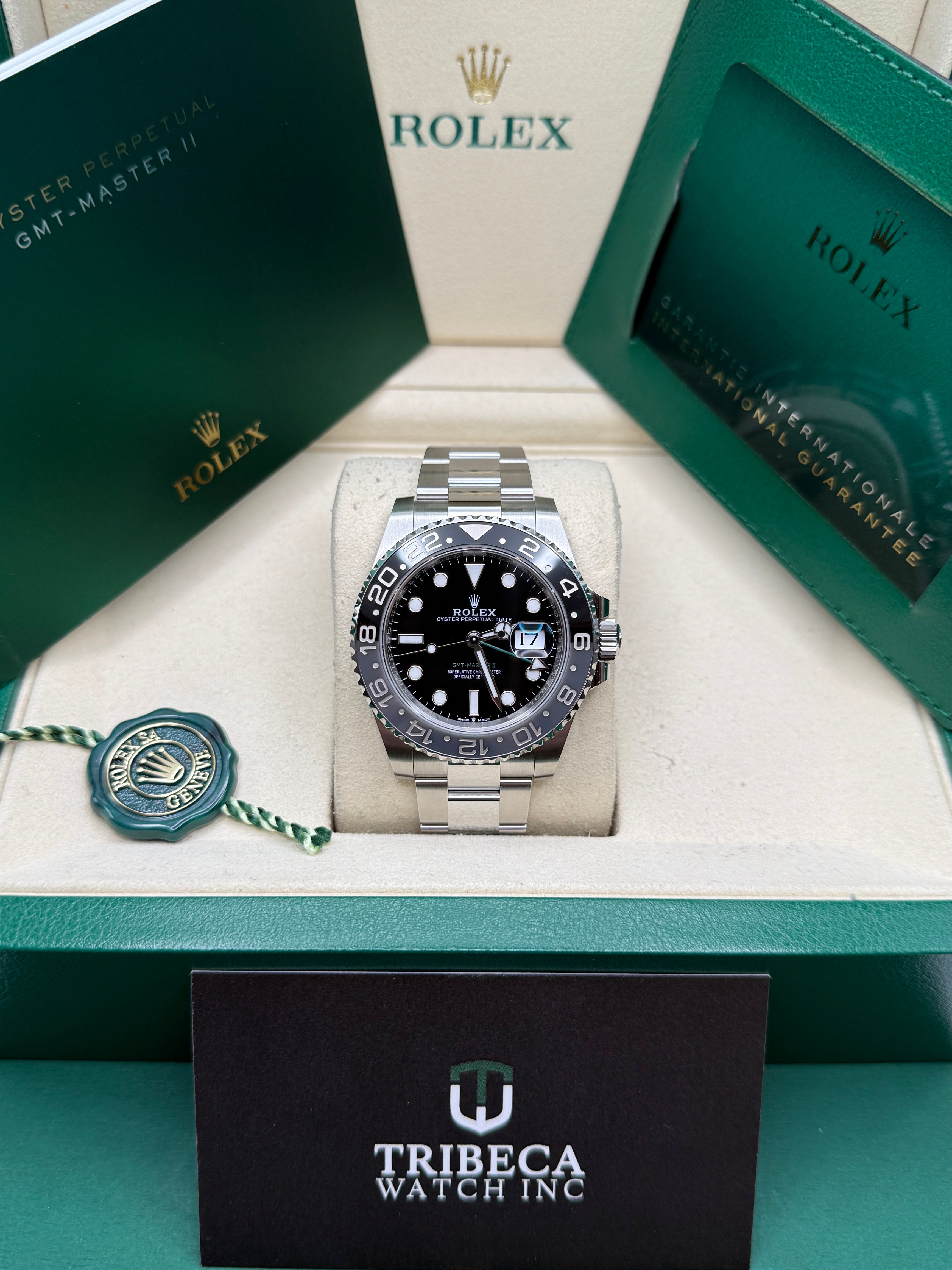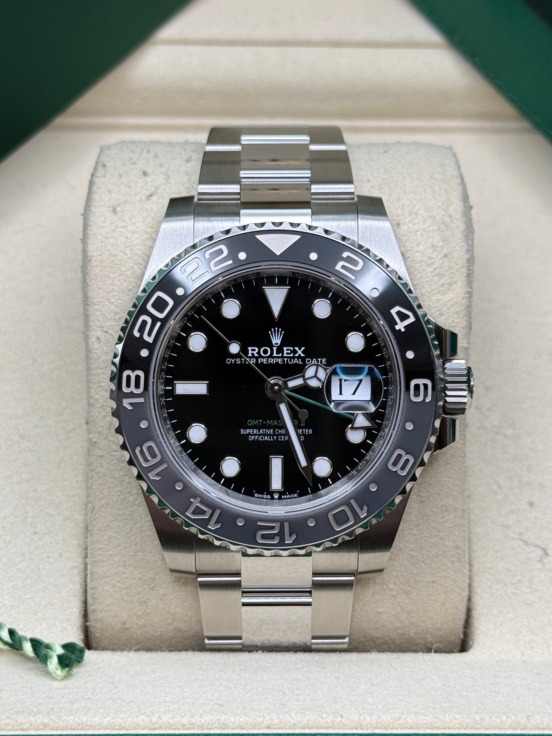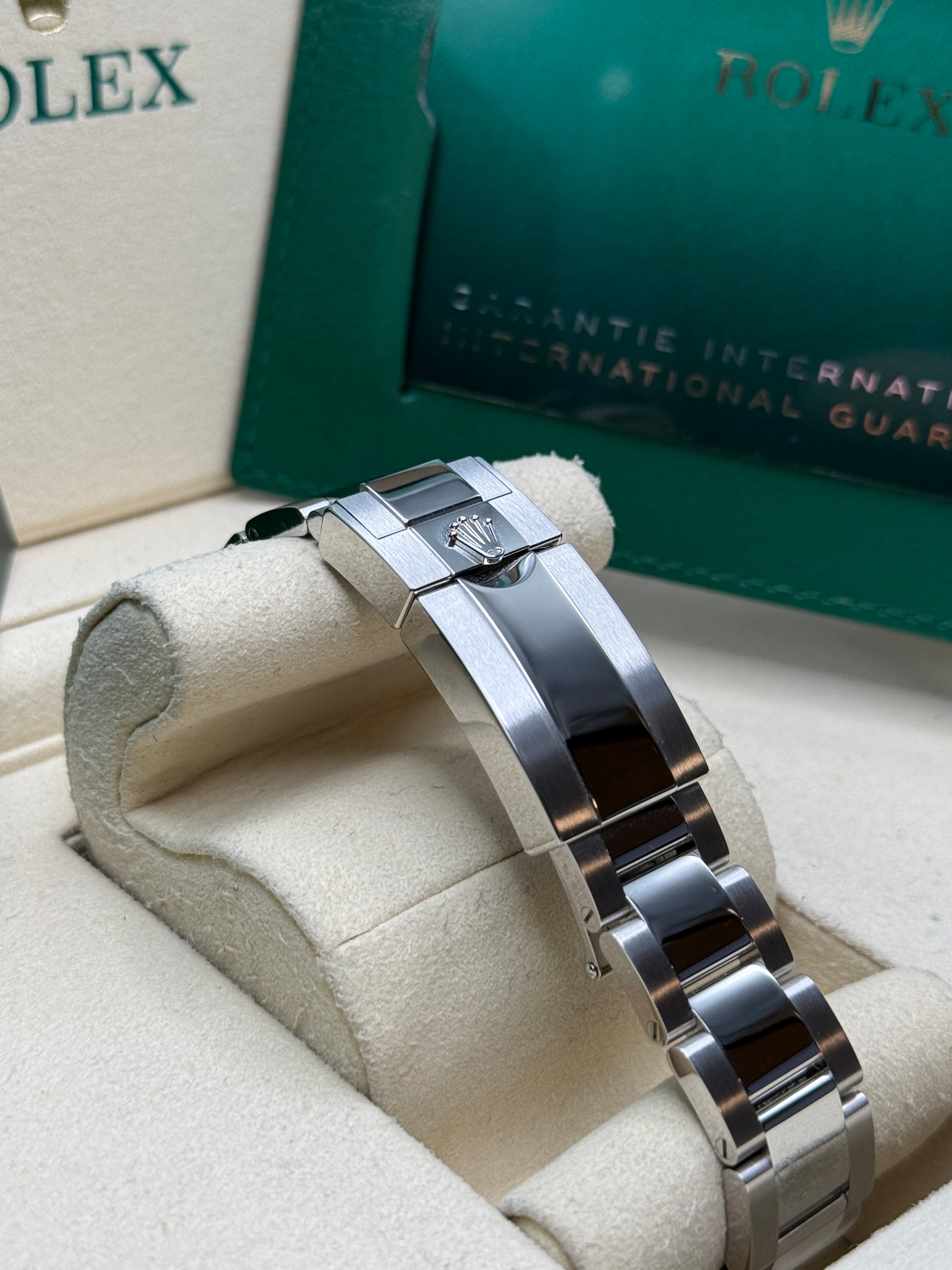 Powered by the Calibre 3285 movement, the Rolex GMT-Master II delivers exceptional precision, reliability, and an impressive power reserve of approximately 70 hours. Its rugged yet elegant Oyster case is waterproof to a depth of 100 meters, ensuring durability in any environment. The watch features a Cerachrom bezel, crafted from high-tech ceramic, which offers superior resistance to scratches and UV rays, maintaining its vibrant color over time. Equipped with an independently adjustable hour hand and 24-hour display, the GMT-Master II allows seamless tracking of multiple time zones, making it a perfect companion for global travelers and watch connoisseurs alike.