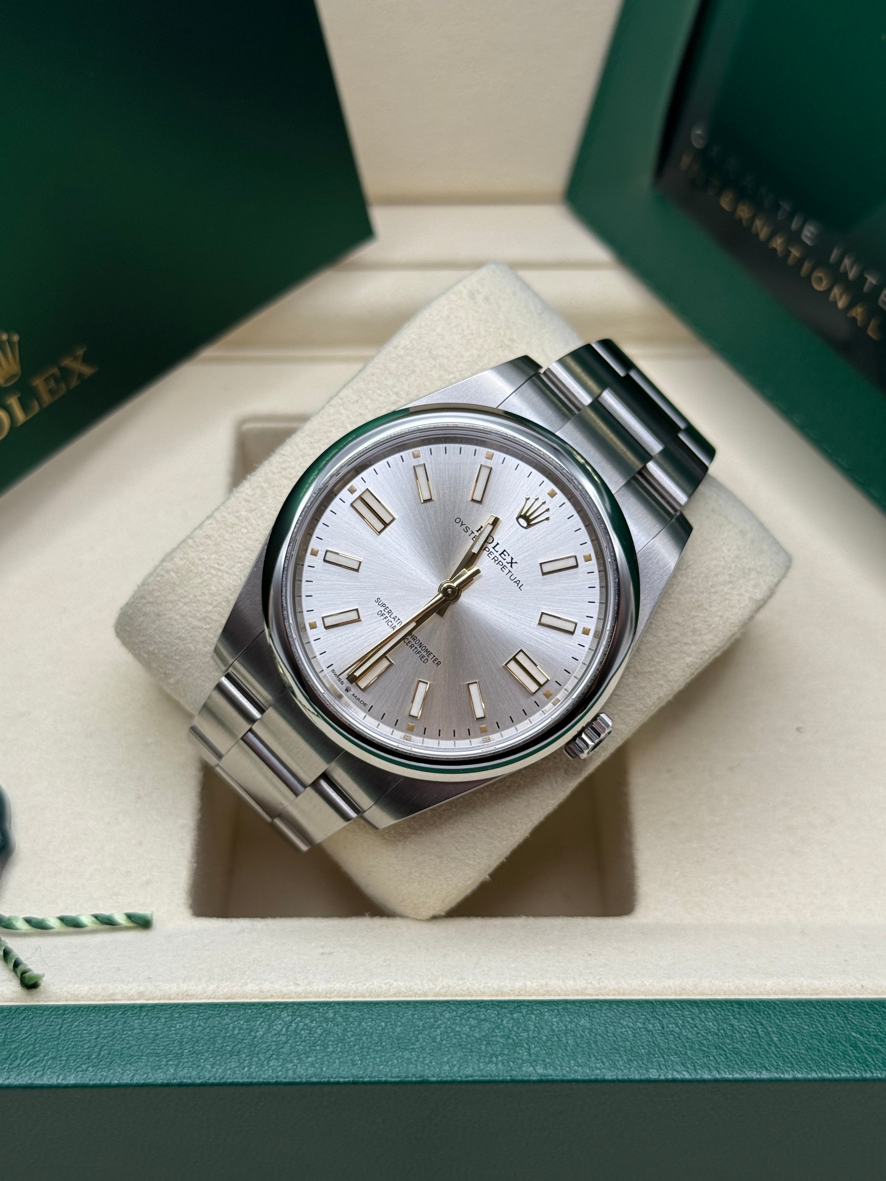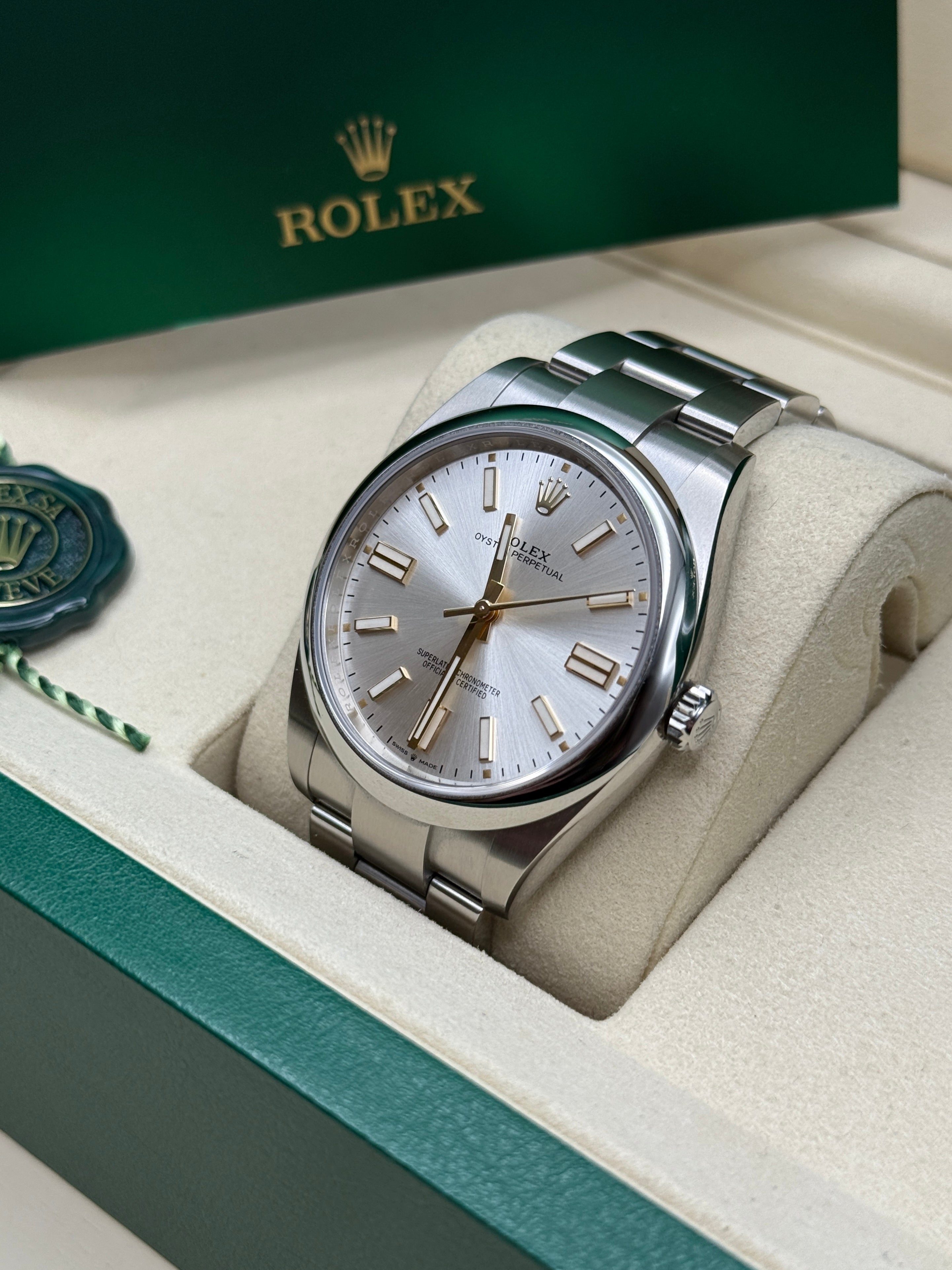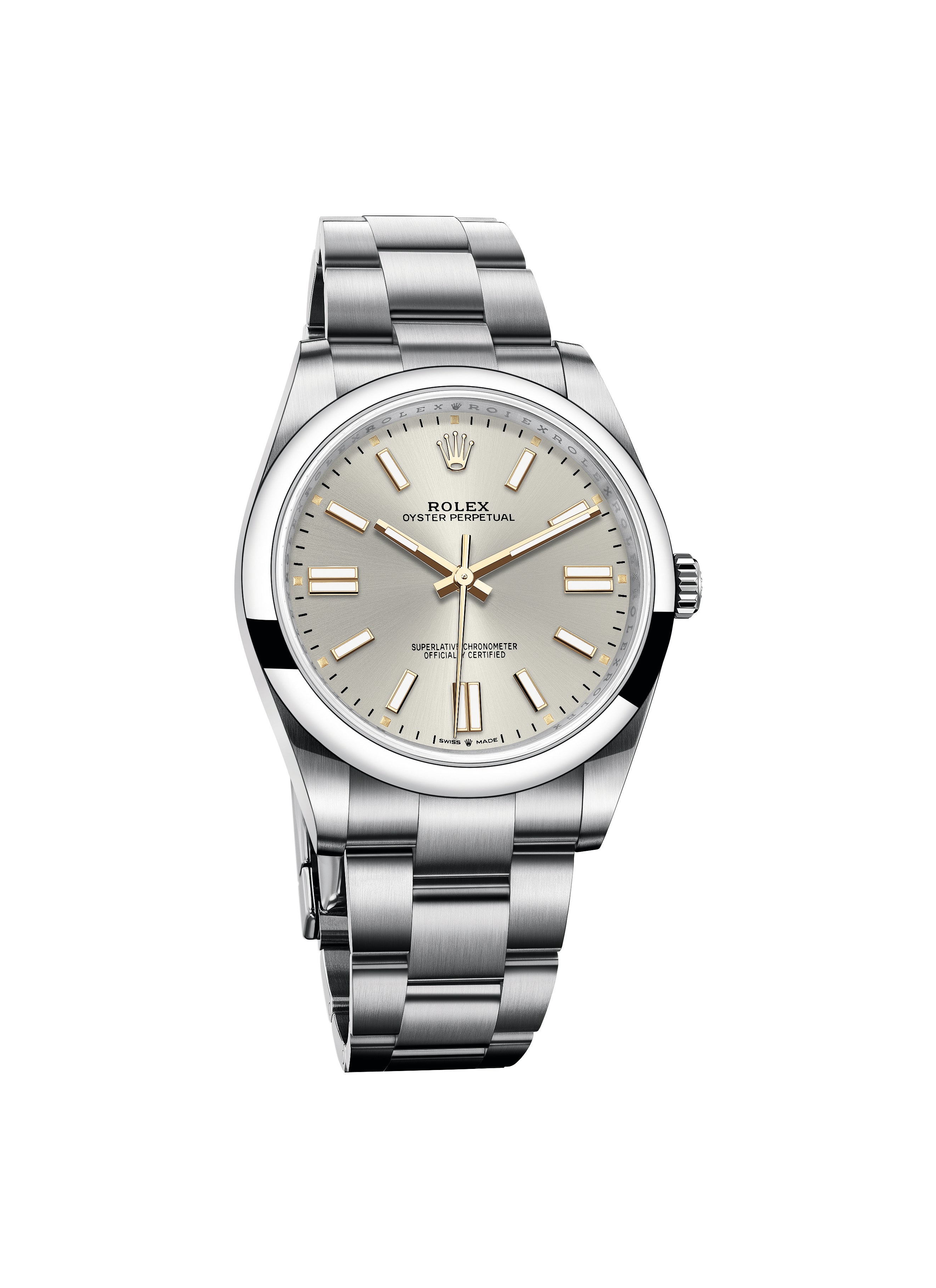 The Oyster Perpetual is the direct descendant of the original Oyster launched in 1926, the first waterproof wristwatch in the world and the foundation on which Rolex has built its reputation. A certified Superlative Chronometer, the Oyster Perpetual features all the key characteristics of the Oyster Perpetual collection – the waterproof Oyster case, a mechanical self-winding movement via Perpetual rotor, and excellent chronometric precision. Understated and elegant, this timepiece is known for its universal, classic style. The Oyster Perpetual’s Oyster case guarantees waterproof to a depth of 100 meters (330 feet), being a paragon of robustness and reliability. The Oyster Perpetual models are equipped with calibre 2232 (Oyster Perpetual 28, Oyster Perpetual 31 and Oyster Perpetual 34), or calibre 3230 (Oyster Perpetual 36 and Oyster Perpetual 41), self-winding mechanical movements entirely developed and manufactured by Rolex.