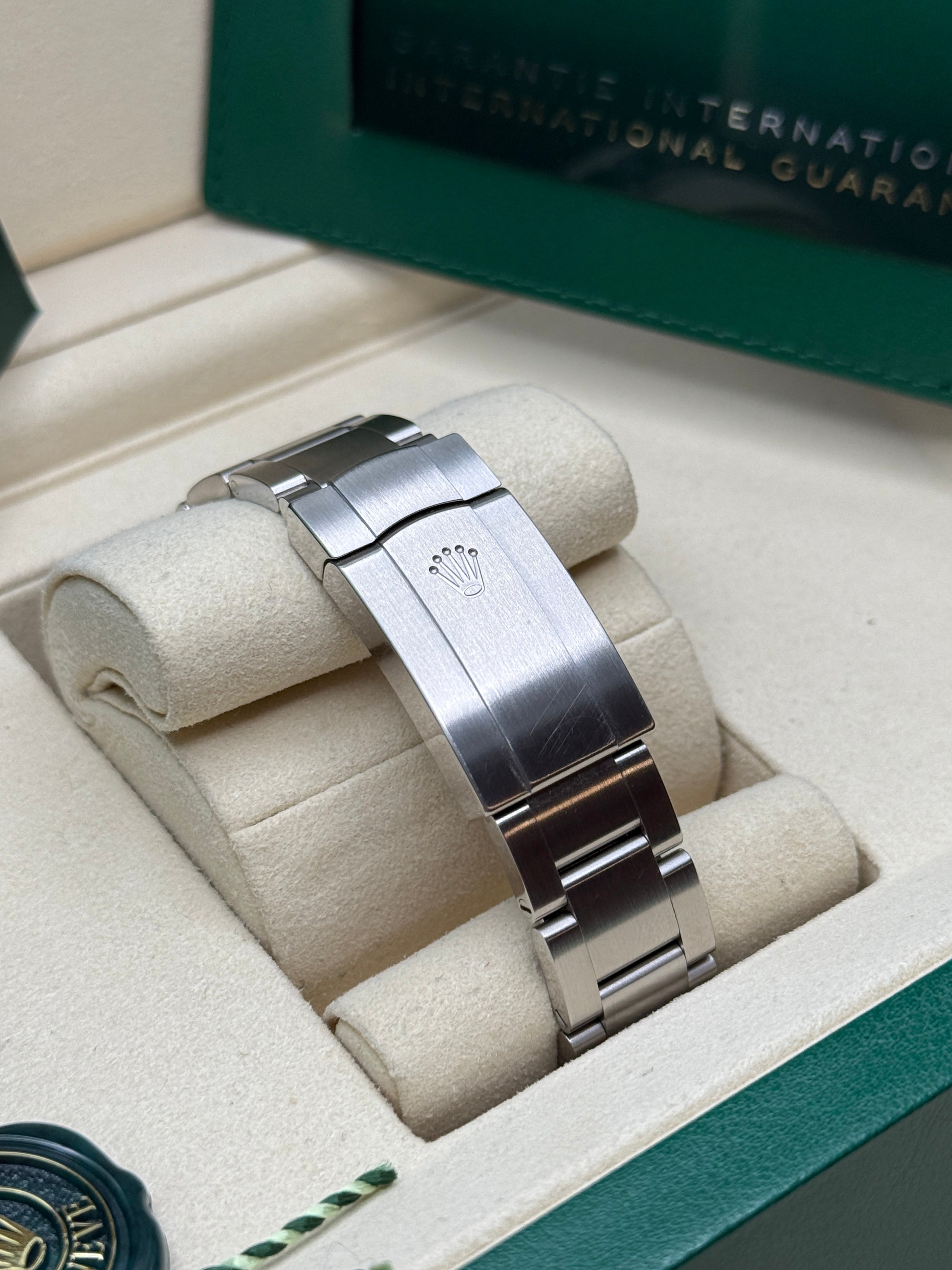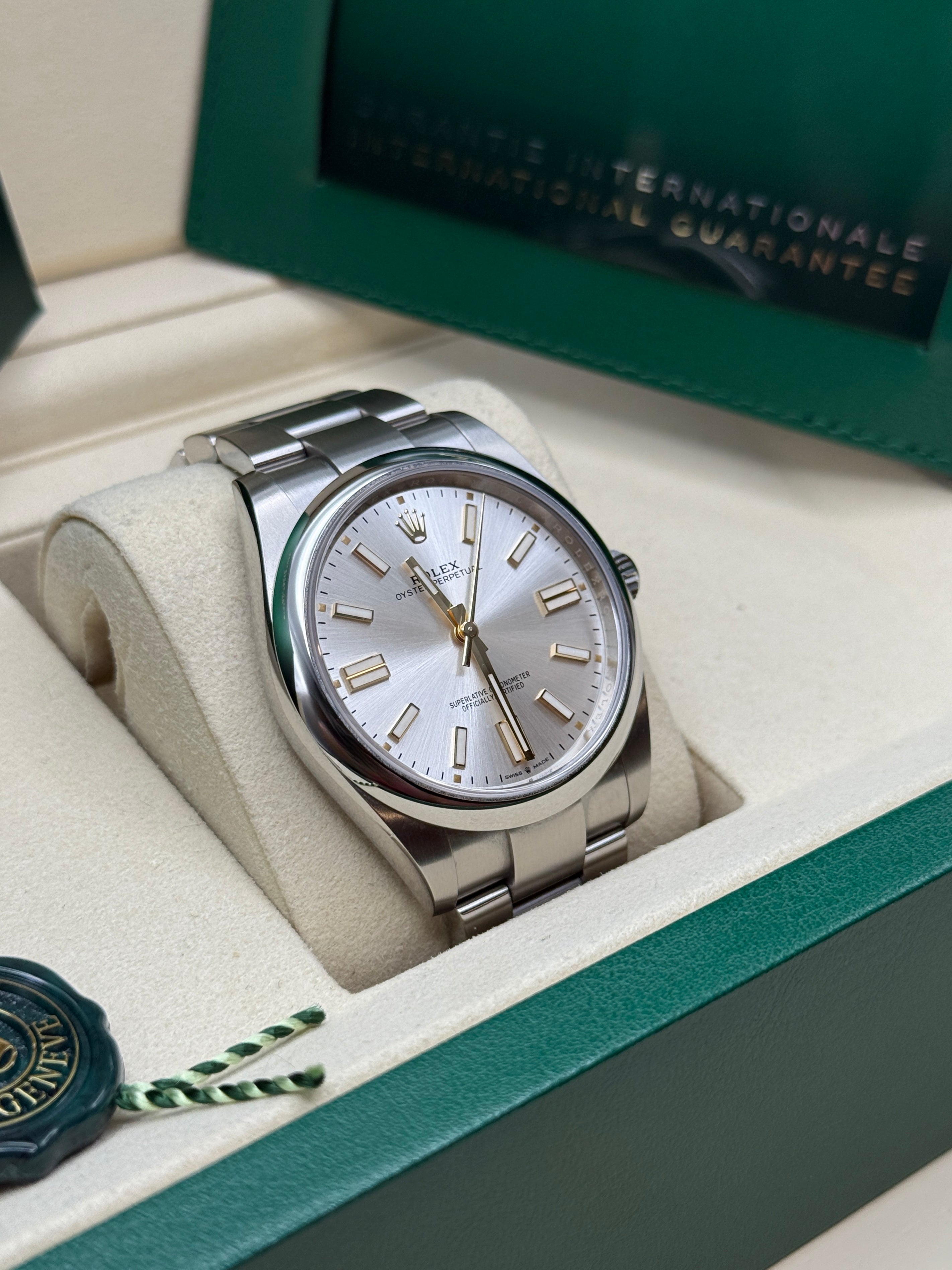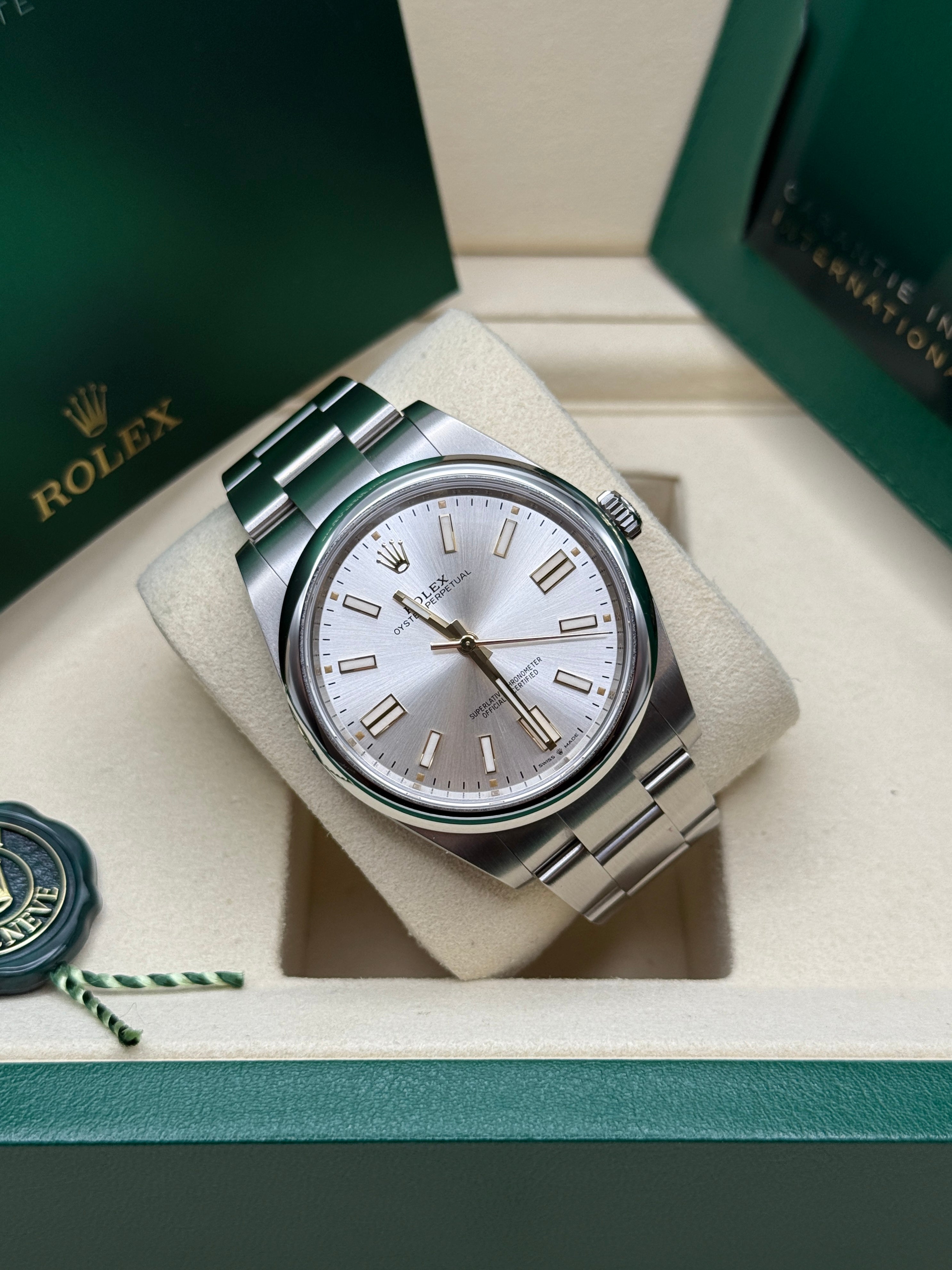 The Oyster Perpetual is the direct descendant of the original Oyster launched in 1926, the first waterproof wristwatch in the world and the foundation on which Rolex has built its reputation. A certified Superlative Chronometer, the Oyster Perpetual features all the key characteristics of the Oyster Perpetual collection – the waterproof Oyster case, a mechanical self-winding movement via Perpetual rotor, and excellent chronometric precision. Understated and elegant, this timepiece is known for its universal, classic style. The Oyster Perpetual’s Oyster case guarantees waterproof to a depth of 100 meters (330 feet), being a paragon of robustness and reliability. The Oyster Perpetual models are equipped with calibre 2232 (Oyster Perpetual 28, Oyster Perpetual 31 and Oyster Perpetual 34), or calibre 3230 (Oyster Perpetual 36 and Oyster Perpetual 41), self-winding mechanical movements entirely developed and manufactured by Rolex.