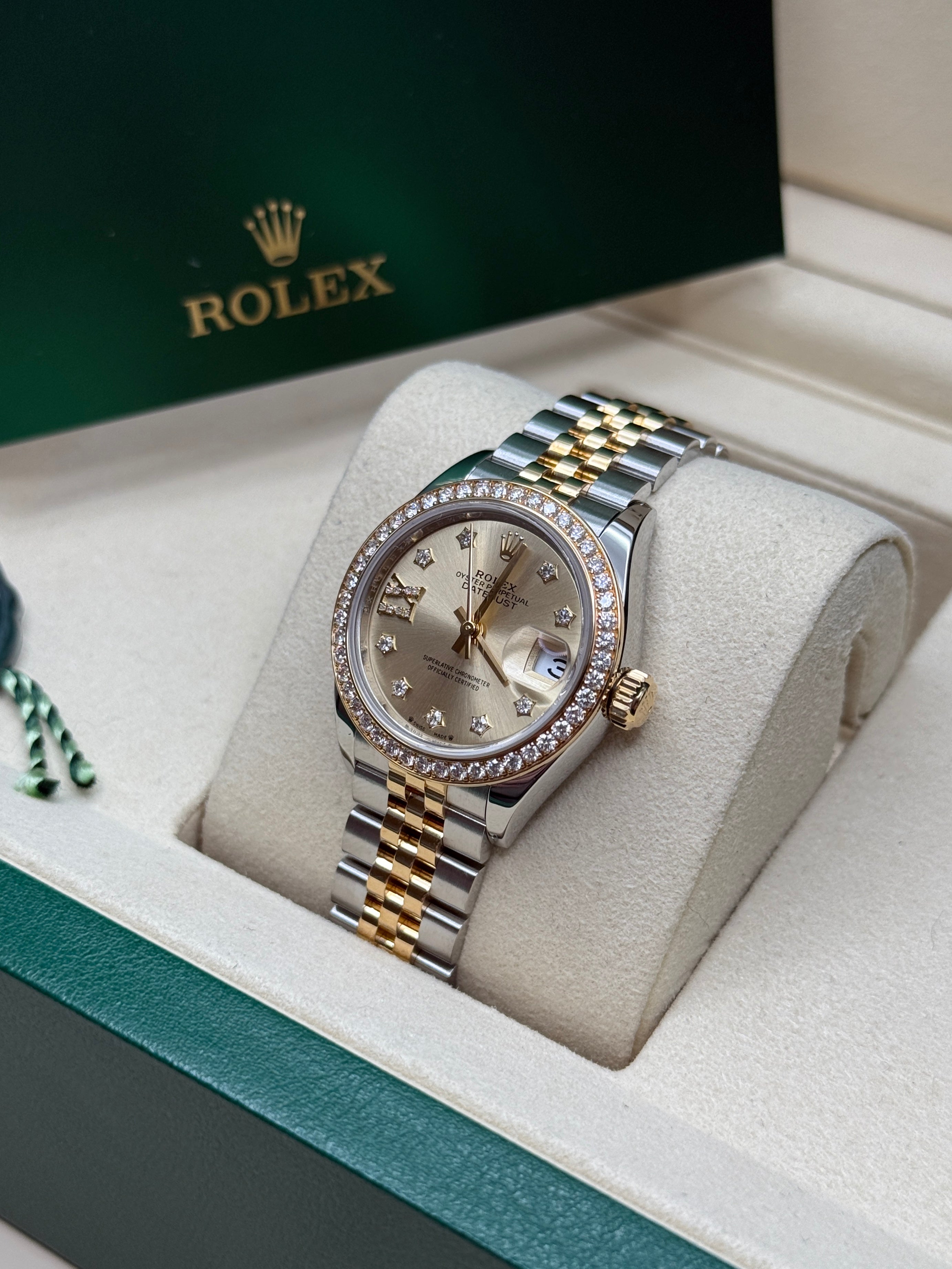 The classic Rolex feminine watch, the Lady-Datejust concentrates all the attributes of the Datejust, the brand’s emblematic watch that has been a byword for style and technical performance ever since its launch in 1945. The women’s version of this date chronometer, the Lady-Datejust, which first appeared in 1957, carries the elegance of the Datejust in a small 28 mm size particularly suited to a slender wrist. The Lady-Datejust upholds the hallmark features of the Datejust line, with a self-winding, waterproof Oyster case that is robust yet graceful. Its calibre 2236 movement, crafted entirely by Rolex, ensures precision and performance. The Lady-Datejust is guaranteed waterproof to a depth of 100 meters (330 feet), making it a resilient and elegant choice for any occasion.