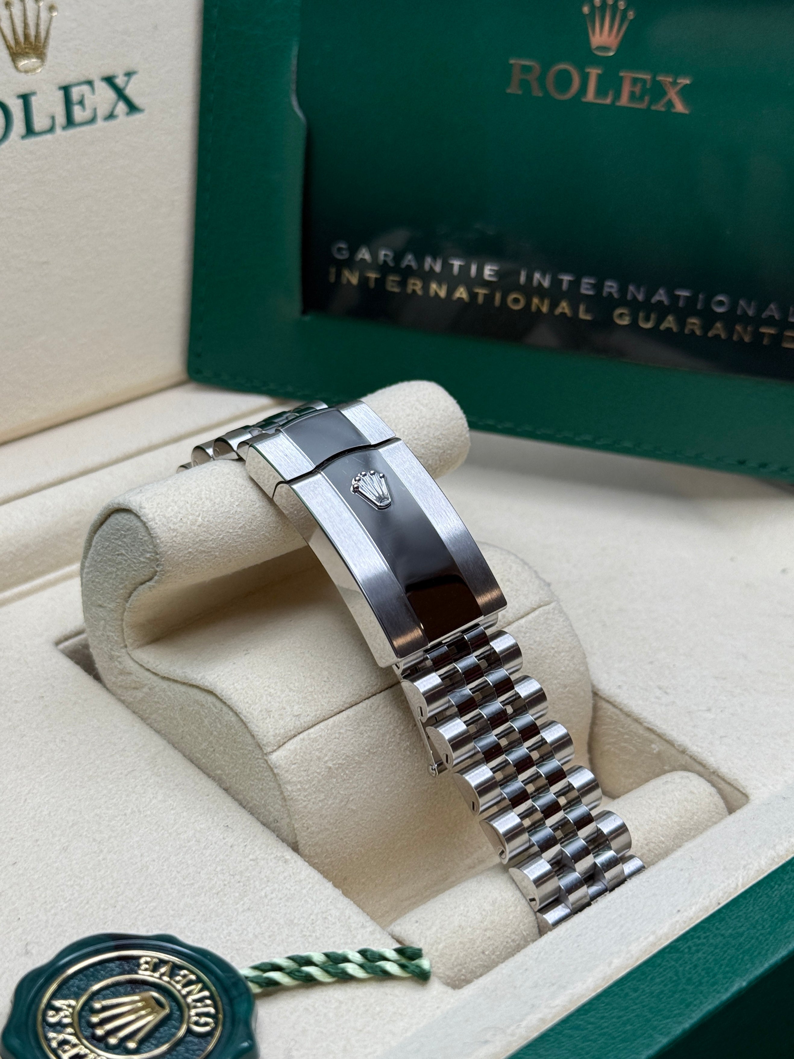 Rolex’s Datejust is the archetype of the classic watch thanks to functions and aesthetics that never go out of fashion. Launched in 1945, it was the first self-winding waterproof chronometer wristwatch to display the date in a window at 3 o’clock on the dial, and consolidated all the major innovations that Rolex had contributed to the modern wristwatch until then. The Datejust has spanned eras while retaining the enduring aesthetic characteristics that make it so instantly recognizable. A paragon of robustness and elegance, the Oyster case of the Datejust 41 is guaranteed waterproof to a depth of 100 meters (330 feet) and is equipped with calibre 3235, a movement entirely developed and manufactured by Rolex.