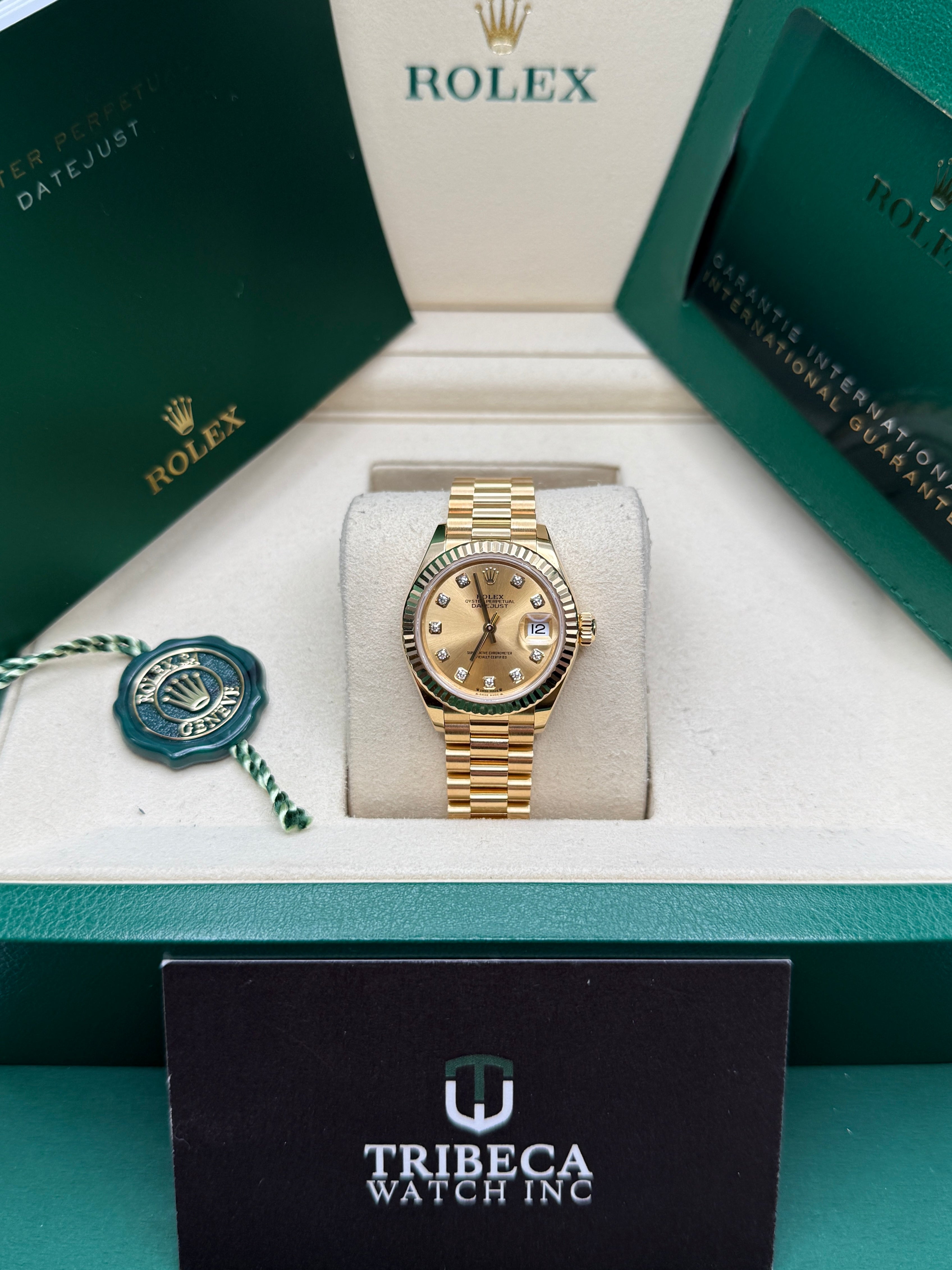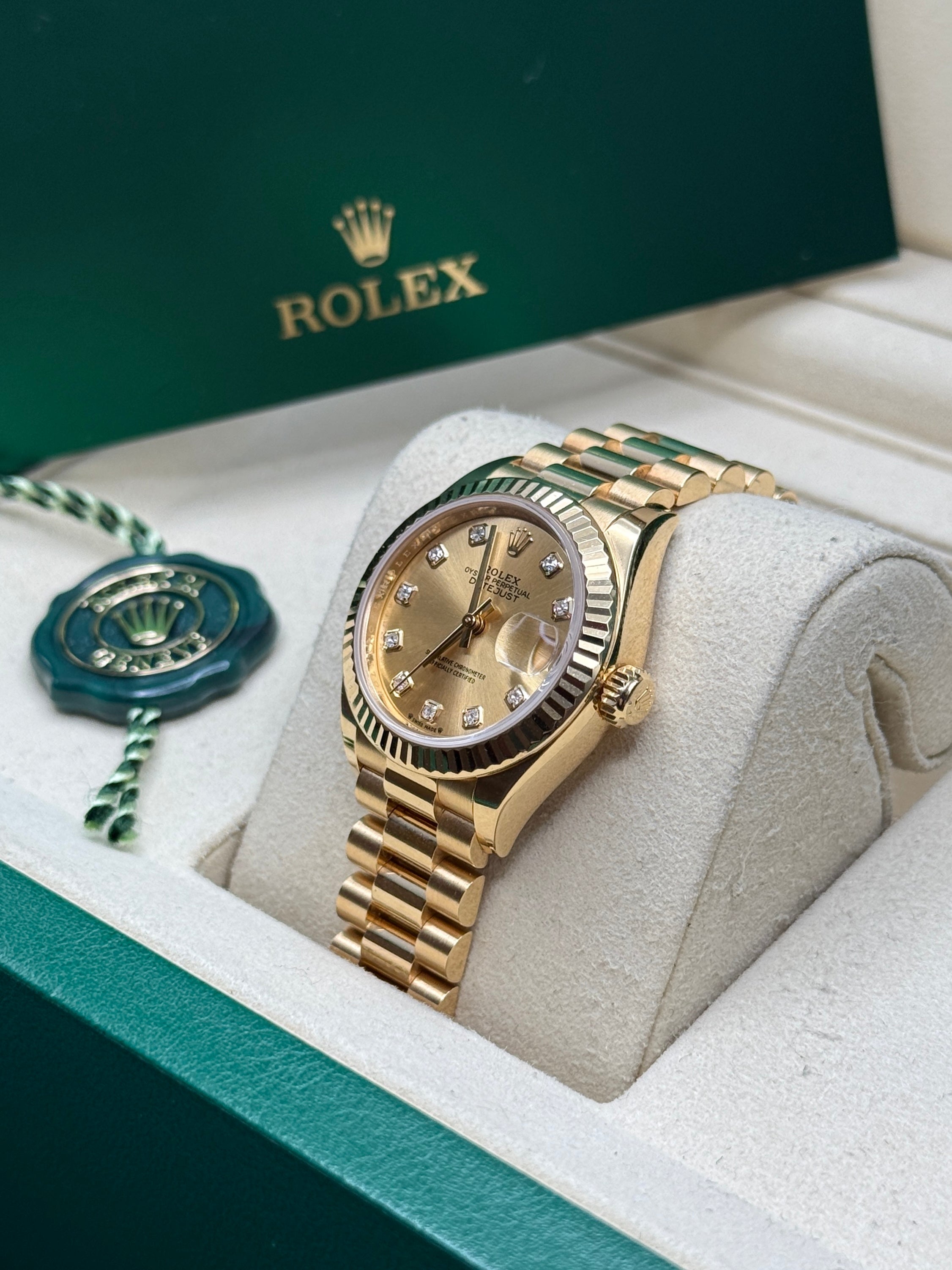 The classic Rolex feminine watch, the Lady-Datejust concentrates all the attributes of the Datejust, the brand’s emblematic watch that has been a byword for style and technical performance ever since its launch in 1945. The women’s version of this date chronometer, the Lady-Datejust, which first appeared in 1957, carries the elegance of the Datejust in a small 28 mm size particularly suited to a slender wrist. The Lady-Datejust upholds the hallmark features of the Datejust line, with a self-winding, waterproof Oyster case that is robust yet graceful. Its calibre 2236 movement, crafted entirely by Rolex, ensures precision and performance. The Lady-Datejust is guaranteed waterproof to a depth of 100 meters (330 feet), making it a resilient and elegant choice for any occasion.