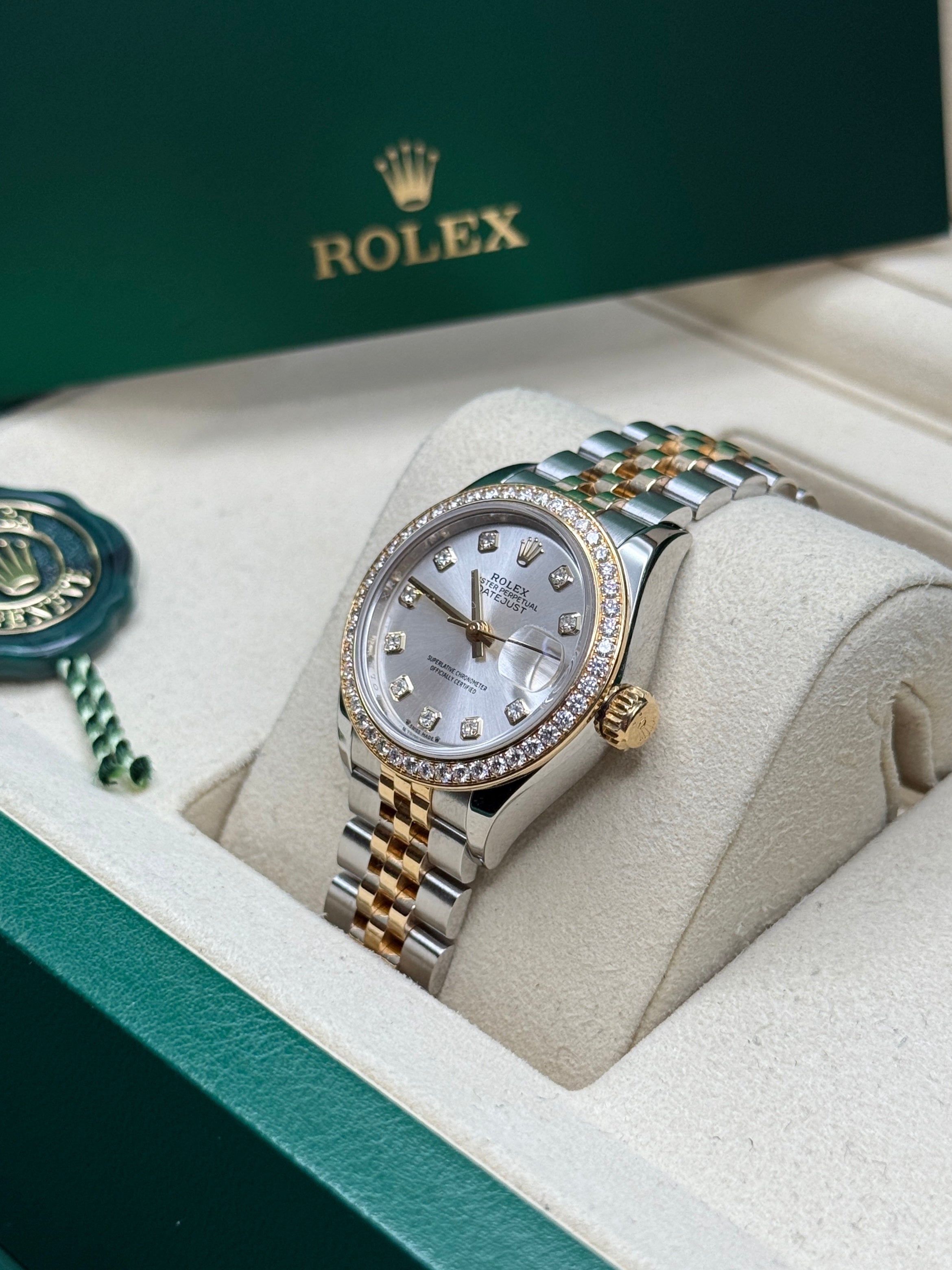 The classic Rolex feminine watch, the Lady-Datejust concentrates all the attributes of the Datejust, the brand’s emblematic watch that has been a byword for style and technical performance ever since its launch in 1945. The women’s version of this date chronometer, the Lady-Datejust, which first appeared in 1957, carries the elegance of the Datejust in a small 28 mm size particularly suited to a slender wrist. The Lady-Datejust upholds the hallmark features of the Datejust line, with a self-winding, waterproof Oyster case that is robust yet graceful. Its calibre 2236 movement, crafted entirely by Rolex, ensures precision and performance. The Lady-Datejust is guaranteed waterproof to a depth of 100 meters (330 feet), making it a resilient and elegant choice for any occasion.
