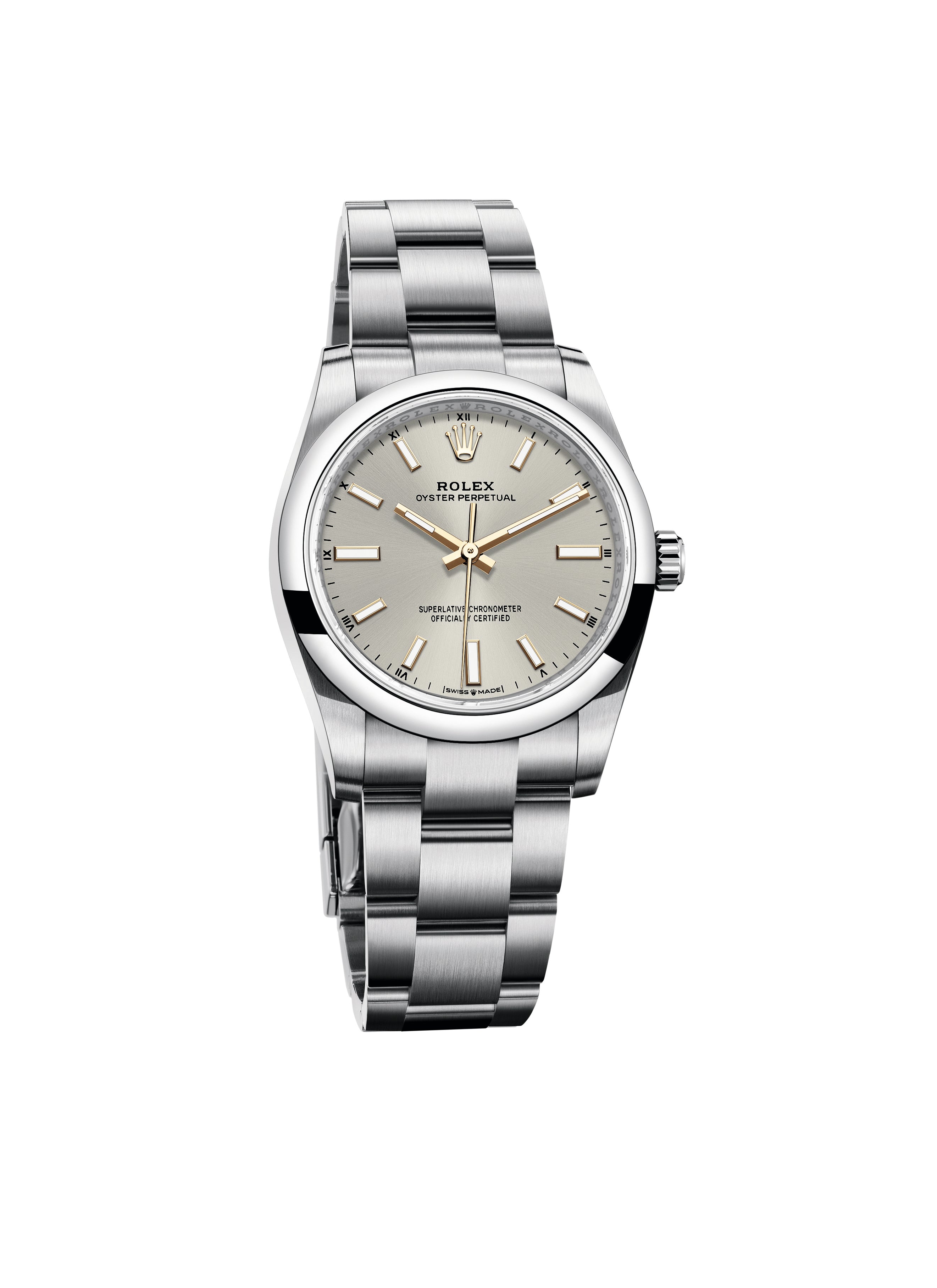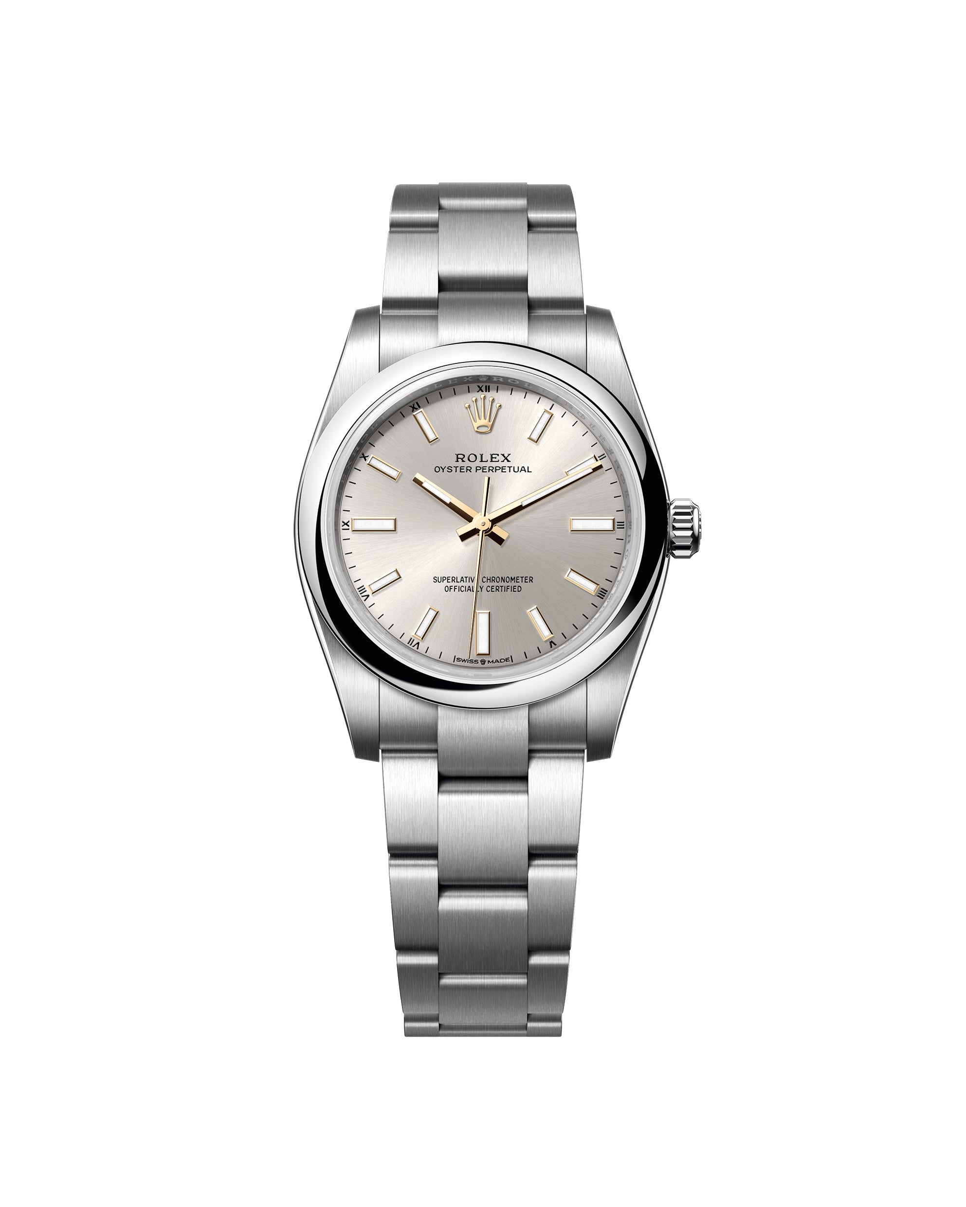 The Oyster Perpetual is the direct descendant of the original Oyster launched in 1926, the first waterproof wristwatch in the world and the foundation on which Rolex has built its reputation. A certified Superlative Chronometer, the Oyster Perpetual features all the key characteristics of the Oyster Perpetual collection – the waterproof Oyster case, a mechanical self-winding movement via Perpetual rotor, and excellent chronometric precision. Understated and elegant, this timepiece is known for its universal, classic style. The Oyster Perpetual’s Oyster case guarantees waterproof to a depth of 100 meters (330 feet), being a paragon of robustness and reliability. The Oyster Perpetual models are equipped with calibre 2232 (Oyster Perpetual 28, Oyster Perpetual 31 and Oyster Perpetual 34), or calibre 3230 (Oyster Perpetual 36 and Oyster Perpetual 41), self-winding mechanical movements entirely developed and manufactured by Rolex.