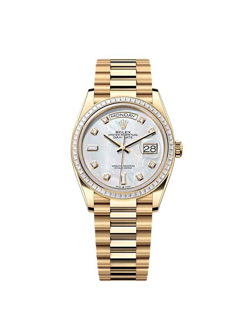 Yellow Gold | President Bracelet | Mother of Pearl Diamond Dial | Diamond Baguette Bezel | 36.0mm