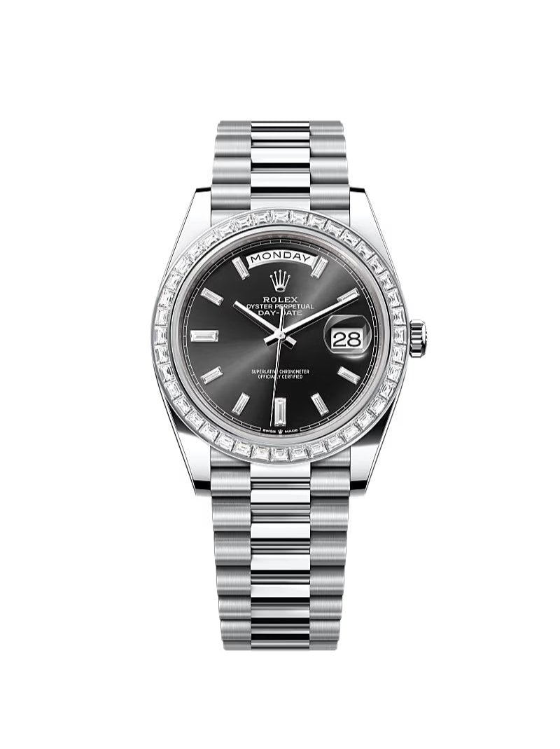 Platinum | President Bracelet | Bright Black Diamond Dial | Diamond Baguette Bezel | 40.0mm