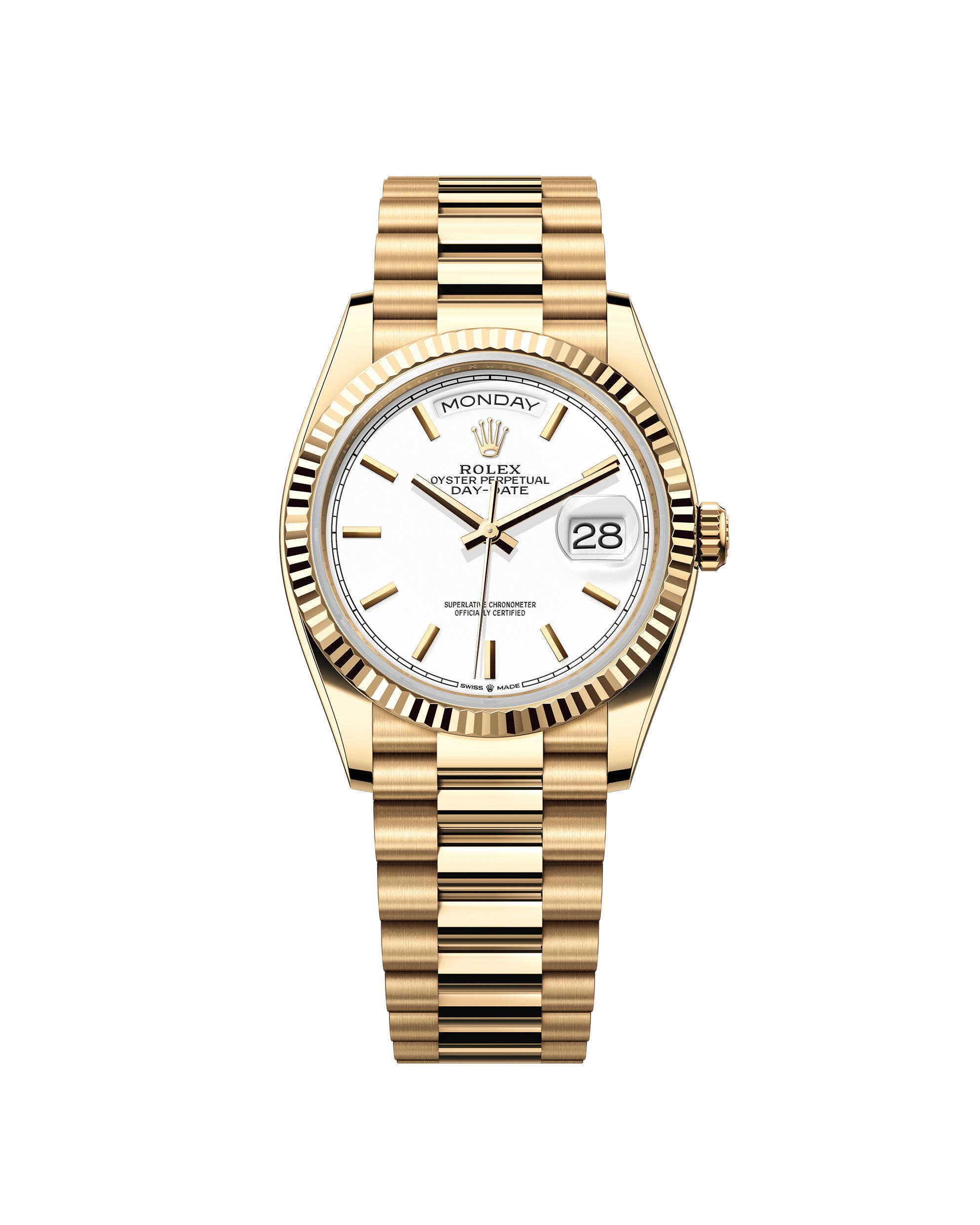 At its launch in 1956, the Day-Date was a major innovation: it was the first calendar wristwatch to indicate, in addition to the date, the day of the week spelt out in full in a window on the dial – a technical feat at the time. The Day-Date has only ever been made from precious metals –18 ct yellow, white or Everose gold, or 950 platinum. Worn by many of the world’s political figures, directors and visionaries, the Day-Date is instantly recognizable, in particular thanks to its emblematic President bracelet, whose evocative name, together with the eminent figures who have worn it, ensured the Day-Date became known as the ‘presidents’ watch’.