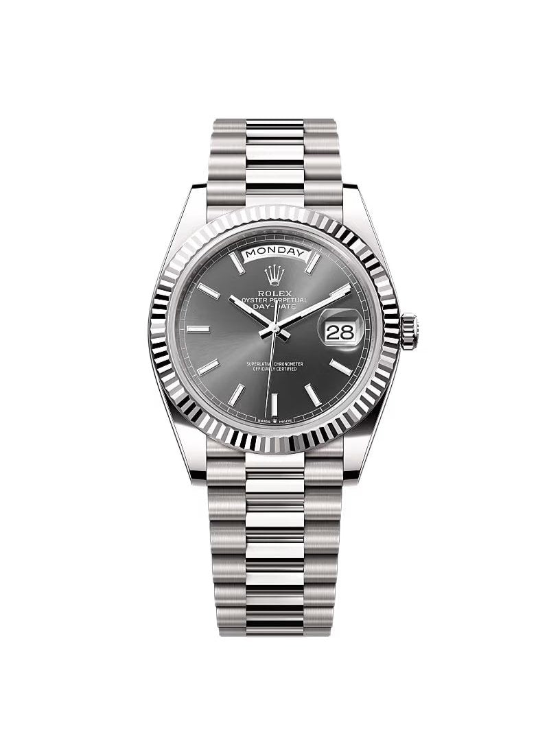 The Day-Date’s calendar displays the day of the week spelt out in full in an arc-shaped window at 12 o’clock in addition to the date in a separate window at 3 o’clock. This display relies on disc mechanisms; the day and date change simultaneously and instantaneously. The indication of the day of the week is available in a choice of 26 languages. The Day-Date is also equipped with a mechanism allowing rapid adjustment of the day and the date using the winding crown. The Day-Date’s Oyster case, 36 or 40 mm in diameter and guaranteed waterproof to a depth of 100 metres (330 feet), is a paragon of robustness and elegance. The Day-Date 36 and Day-Date 40 are equipped with calibre 3255, a self-winding mechanical movement entirely developed and manufactured by Rolex.