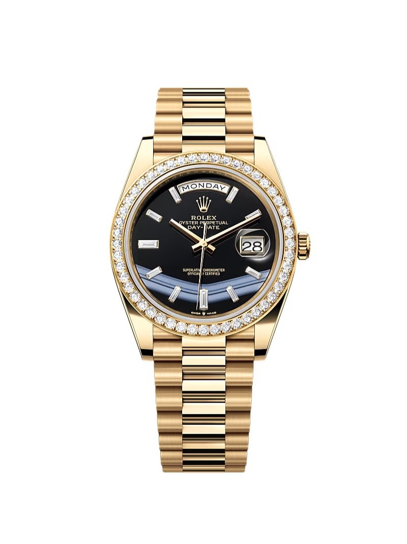 The Day-Date’s calendar displays the day of the week spelt out in full in an arc-shaped window at 12 o’clock in addition to the date in a separate window at 3 o’clock. This display relies on disc mechanisms; the day and date change simultaneously and instantaneously. The indication of the day of the week is available in a choice of 26 languages. The Day-Date is also equipped with a mechanism allowing rapid adjustment of the day and the date using the winding crown. The Day-Date’s Oyster case, 36 or 40 mm in diameter and guaranteed waterproof to a depth of 100 metres (330 feet), is a paragon of robustness and elegance. The Day-Date 36 and Day-Date 40 are equipped with calibre 3255, a self-winding mechanical movement entirely developed and manufactured by Rolex.