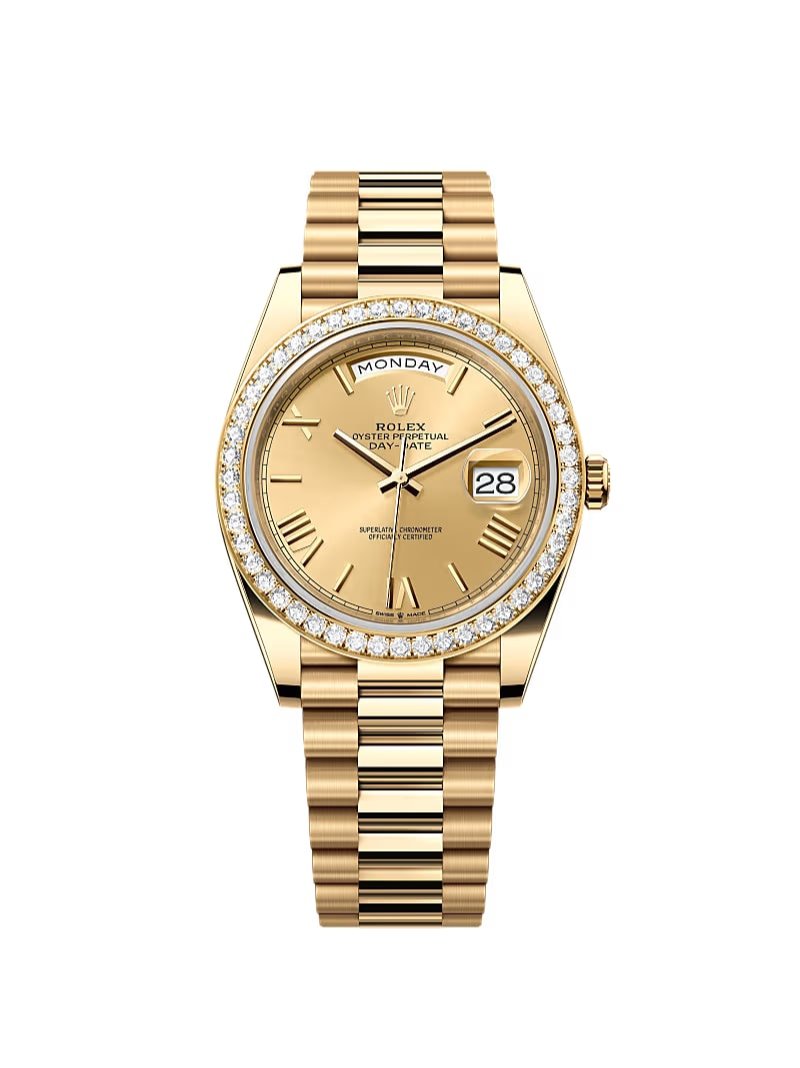The Day-Date’s calendar displays the day of the week spelt out in full in an arc-shaped window at 12 o’clock in addition to the date in a separate window at 3 o’clock. This display relies on disc mechanisms; the day and date change simultaneously and instantaneously. The indication of the day of the week is available in a choice of 26 languages. The Day-Date is also equipped with a mechanism allowing rapid adjustment of the day and the date using the winding crown. The Day-Date’s Oyster case, 36 or 40 mm in diameter and guaranteed waterproof to a depth of 100 metres (330 feet), is a paragon of robustness and elegance. The Day-Date 36 and Day-Date 40 are equipped with calibre 3255, a self-winding mechanical movement entirely developed and manufactured by Rolex.
