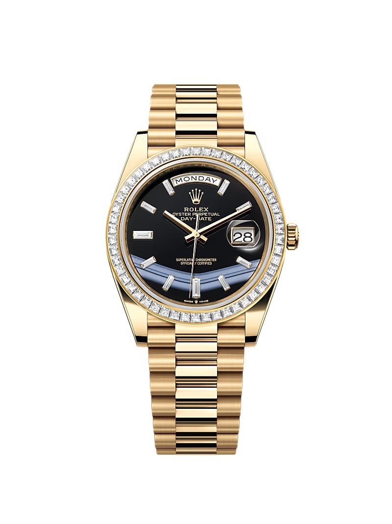 The Day-Date’s calendar displays the day of the week spelt out in full in an arc-shaped window at 12 o’clock in addition to the date in a separate window at 3 o’clock. This display relies on disc mechanisms; the day and date change simultaneously and instantaneously. The indication of the day of the week is available in a choice of 26 languages. The Day-Date is also equipped with a mechanism allowing rapid adjustment of the day and the date using the winding crown. The Day-Date’s Oyster case, 36 or 40 mm in diameter and guaranteed waterproof to a depth of 100 metres (330 feet), is a paragon of robustness and elegance. The Day-Date 36 and Day-Date 40 are equipped with calibre 3255, a self-winding mechanical movement entirely developed and manufactured by Rolex.