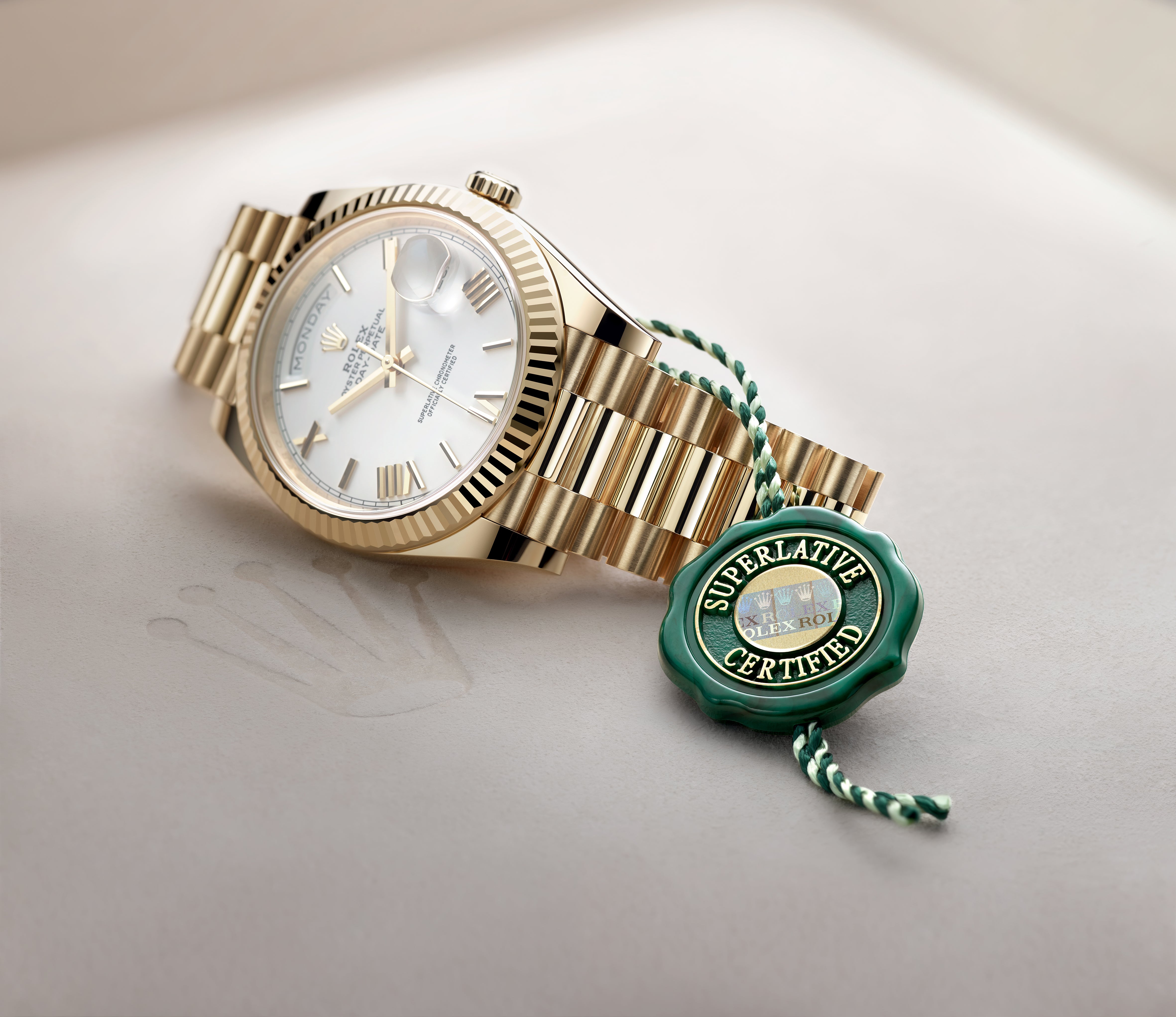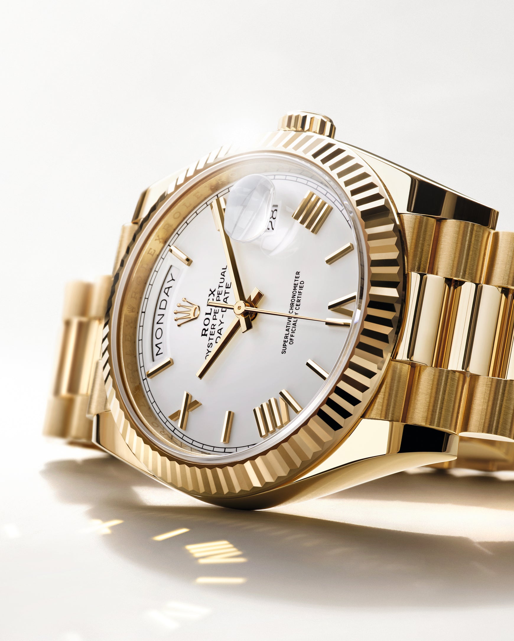 The Day-Date’s calendar displays the day of the week spelt out in full in an arc-shaped window at 12 o’clock in addition to the date in a separate window at 3 o’clock. This display relies on disc mechanisms; the day and date change simultaneously and instantaneously. The indication of the day of the week is available in a choice of 26 languages. The Day-Date is also equipped with a mechanism allowing rapid adjustment of the day and the date using the winding crown. The Day-Date’s Oyster case, 36 or 40 mm in diameter and guaranteed waterproof to a depth of 100 metres (330 feet), is a paragon of robustness and elegance. The Day-Date 36 and Day-Date 40 are equipped with calibre 3255, a self-winding mechanical movement entirely developed and manufactured by Rolex.