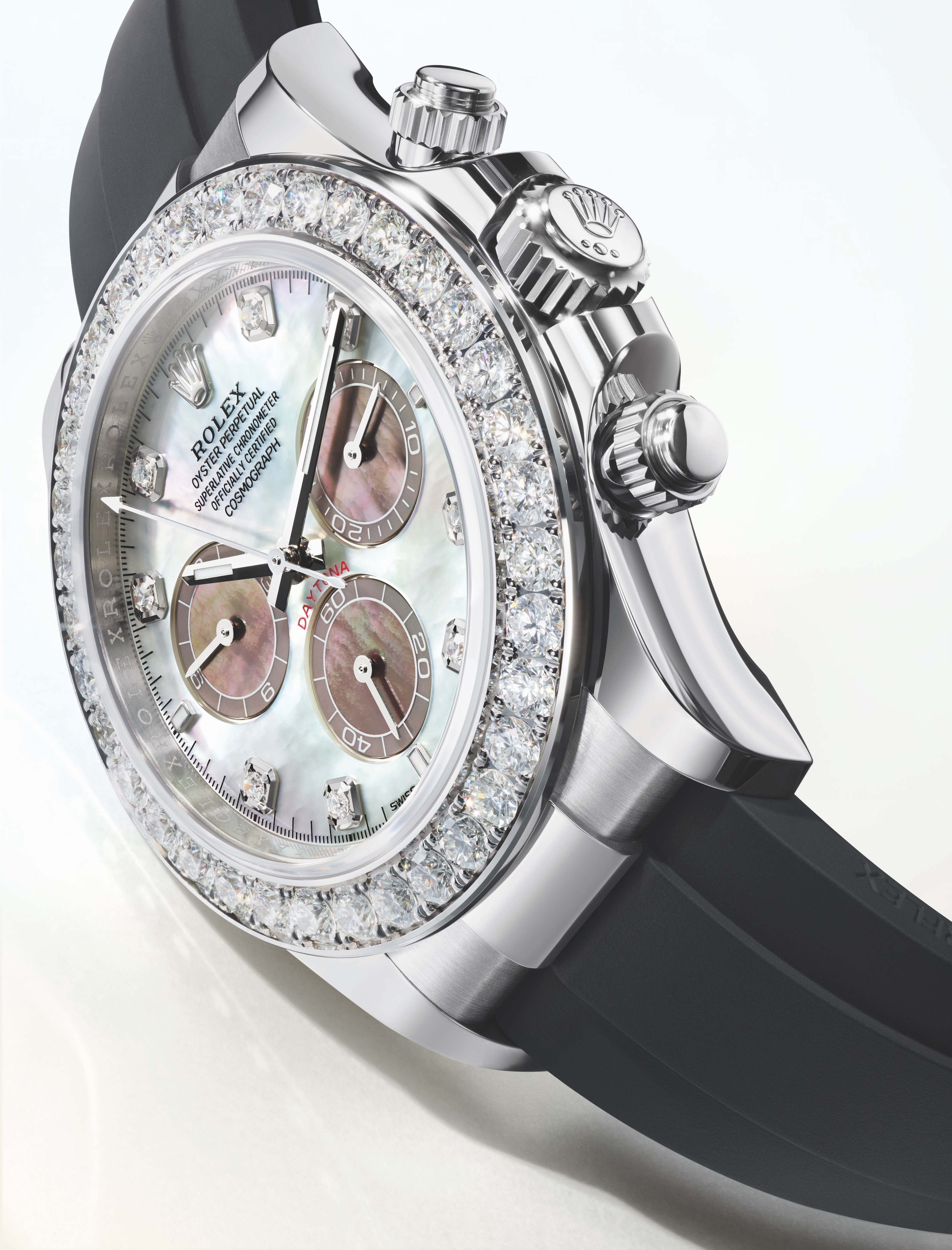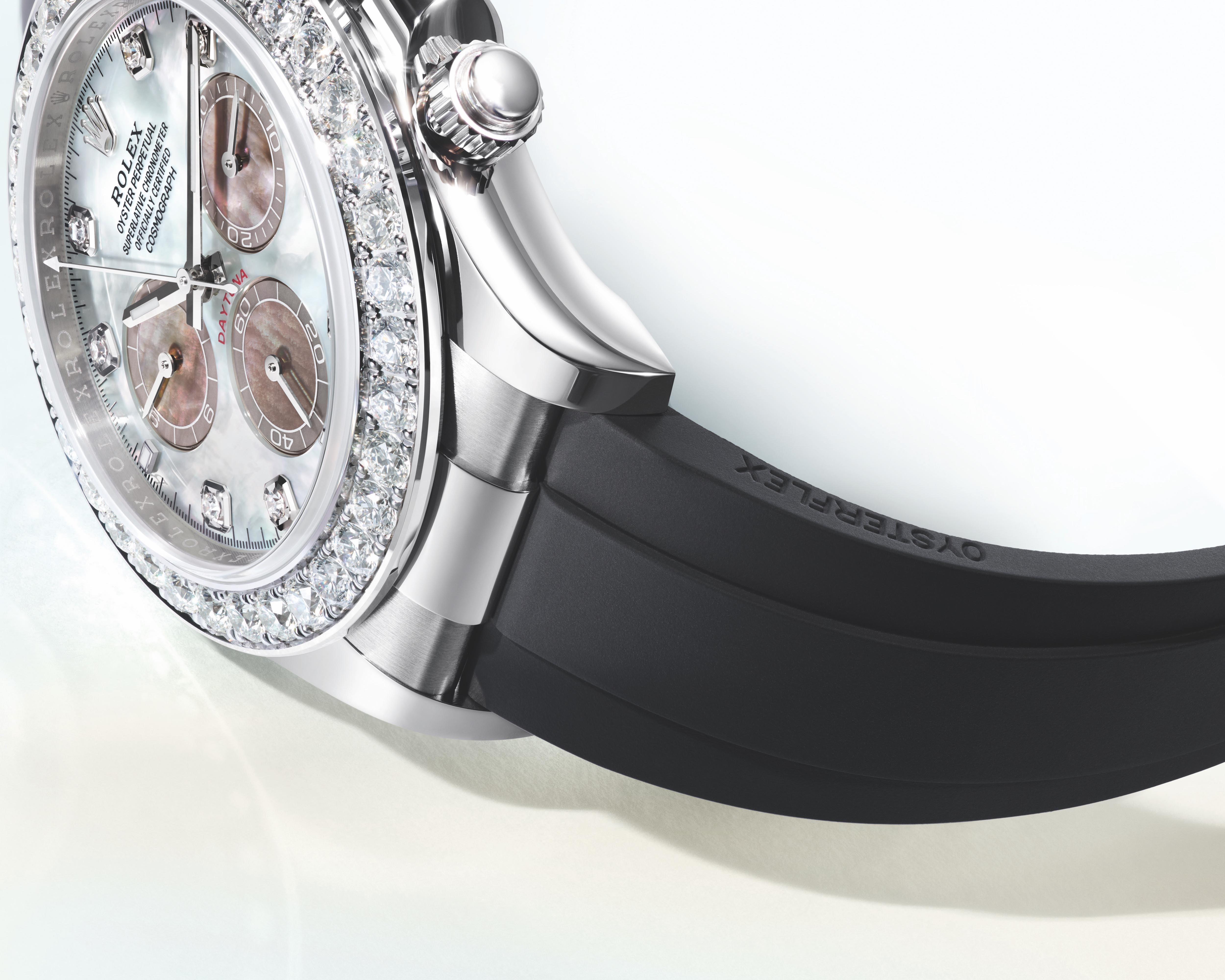 Cosmograph Daytona White Gold Oysterflex White & Black Mother of Pearl Diamond