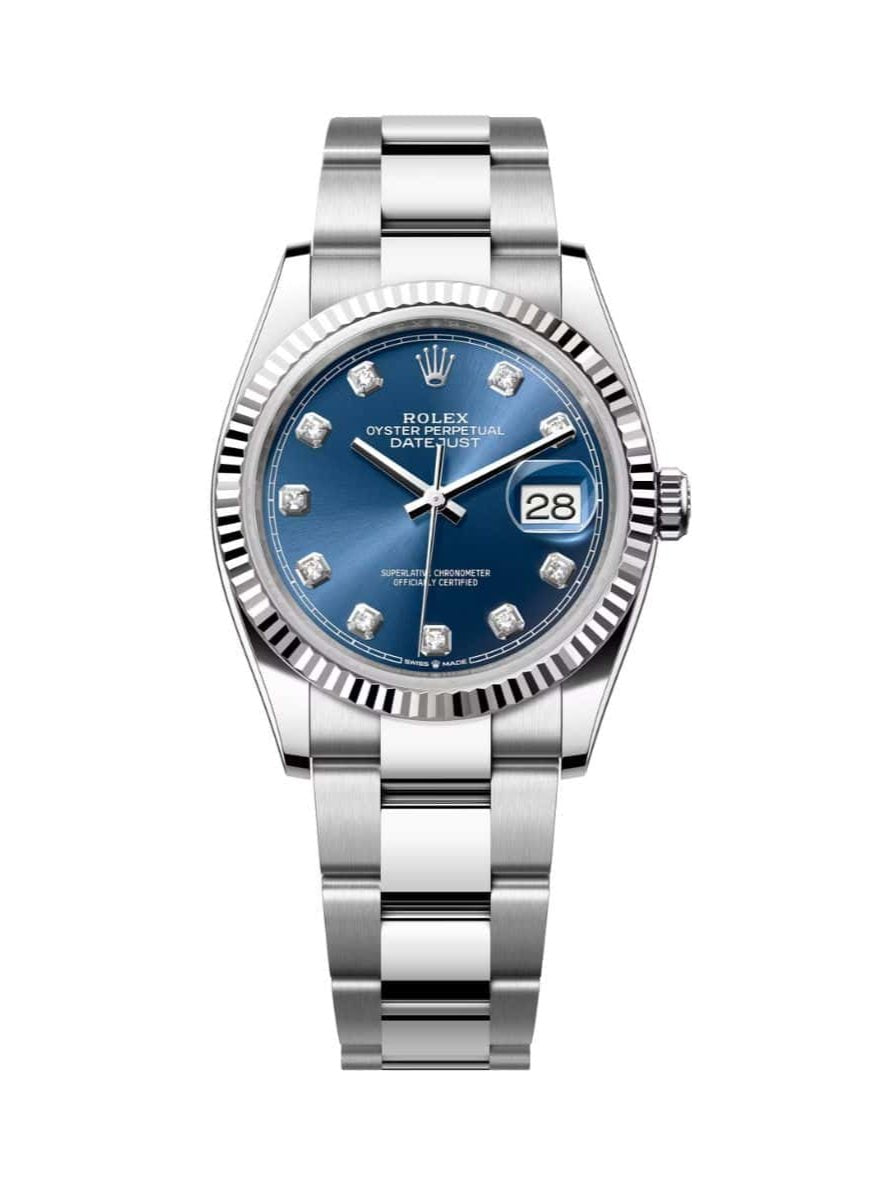 Rolex’s Datejust is the archetype of the classic watch thanks to functions and aesthetics that never go out of fashion. Launched in 1945, it was the first self-winding waterproof chronometer wristwatch to display the date in a window at 3 o’clock on the dial, and consolidated all the major innovations that Rolex had contributed to the modern wristwatch until then. The Datejust has spanned eras while retaining the enduring aesthetic characteristics that make it so instantly recognizable. A paragon of robustness and elegance, the Oyster case of the Datejust 36 is guaranteed waterproof to a depth of 100 meters (330 feet) and is equipped with calibre 3235, a movement entirely developed and manufactured by Rolex.