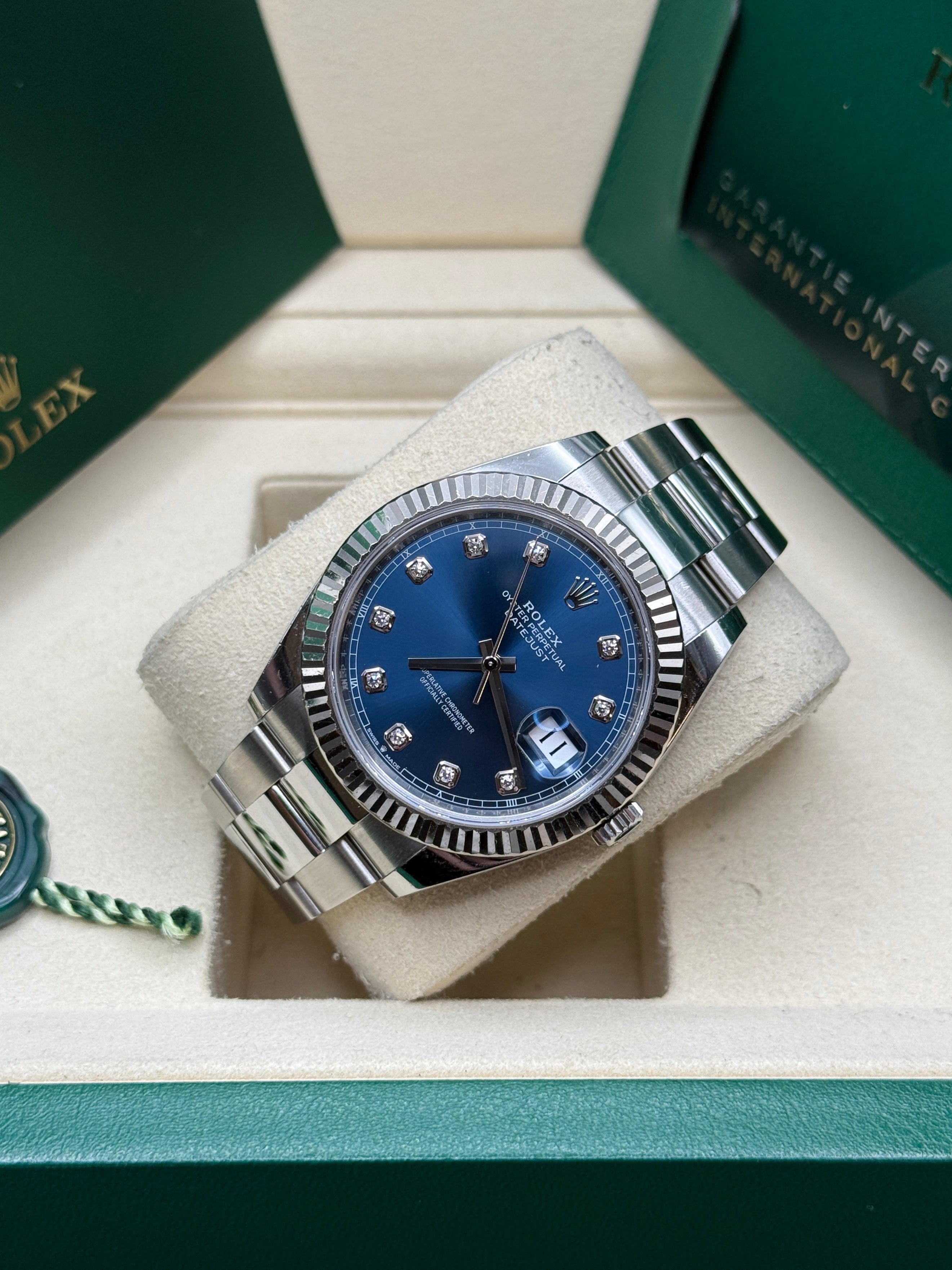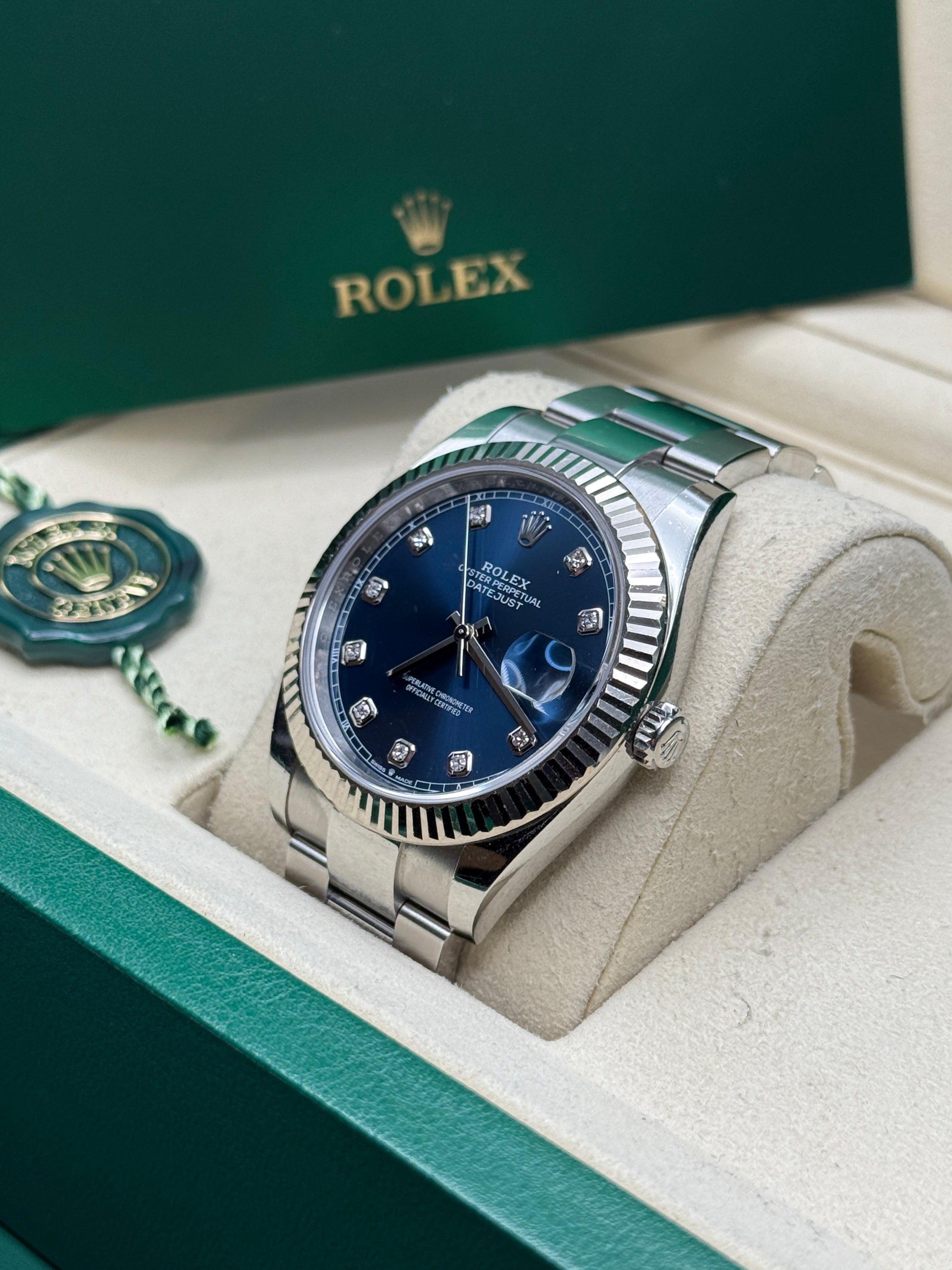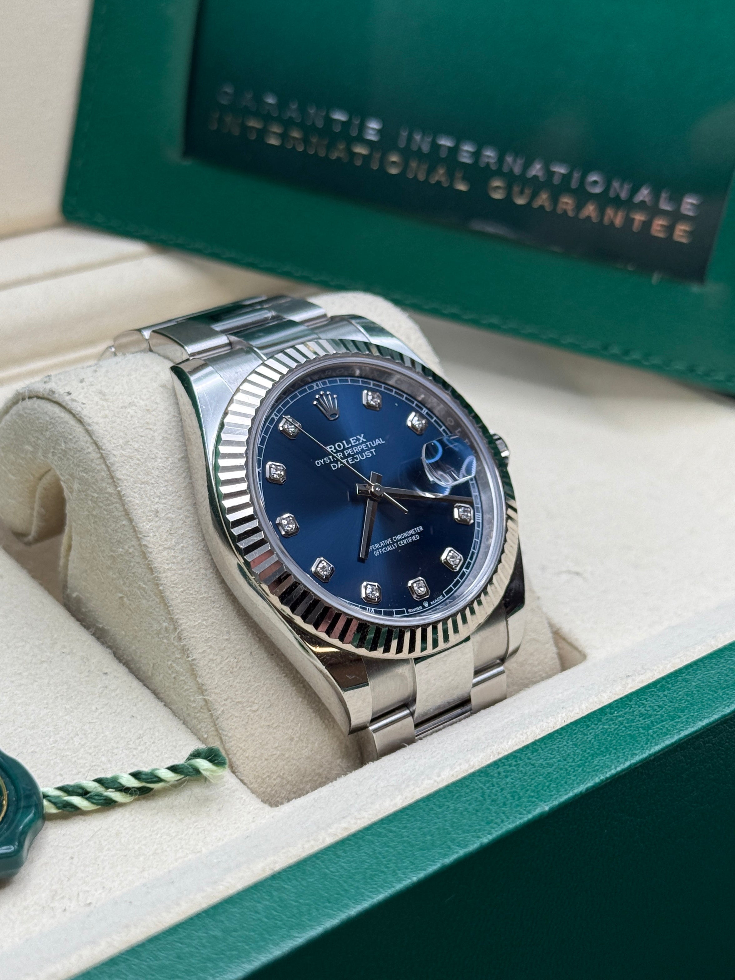 Rolex’s Datejust is the archetype of the classic watch thanks to functions and aesthetics that never go out of fashion. Launched in 1945, it was the first self-winding waterproof chronometer wristwatch to display the date in a window at 3 o’clock on the dial, and consolidated all the major innovations that Rolex had contributed to the modern wristwatch until then. The Datejust has spanned eras while retaining the enduring aesthetic characteristics that make it so instantly recognizable. A paragon of robustness and elegance, the Oyster case of the Datejust 41 is guaranteed waterproof to a depth of 100 meters (330 feet) and is equipped with calibre 3235, a movement entirely developed and manufactured by Rolex.
