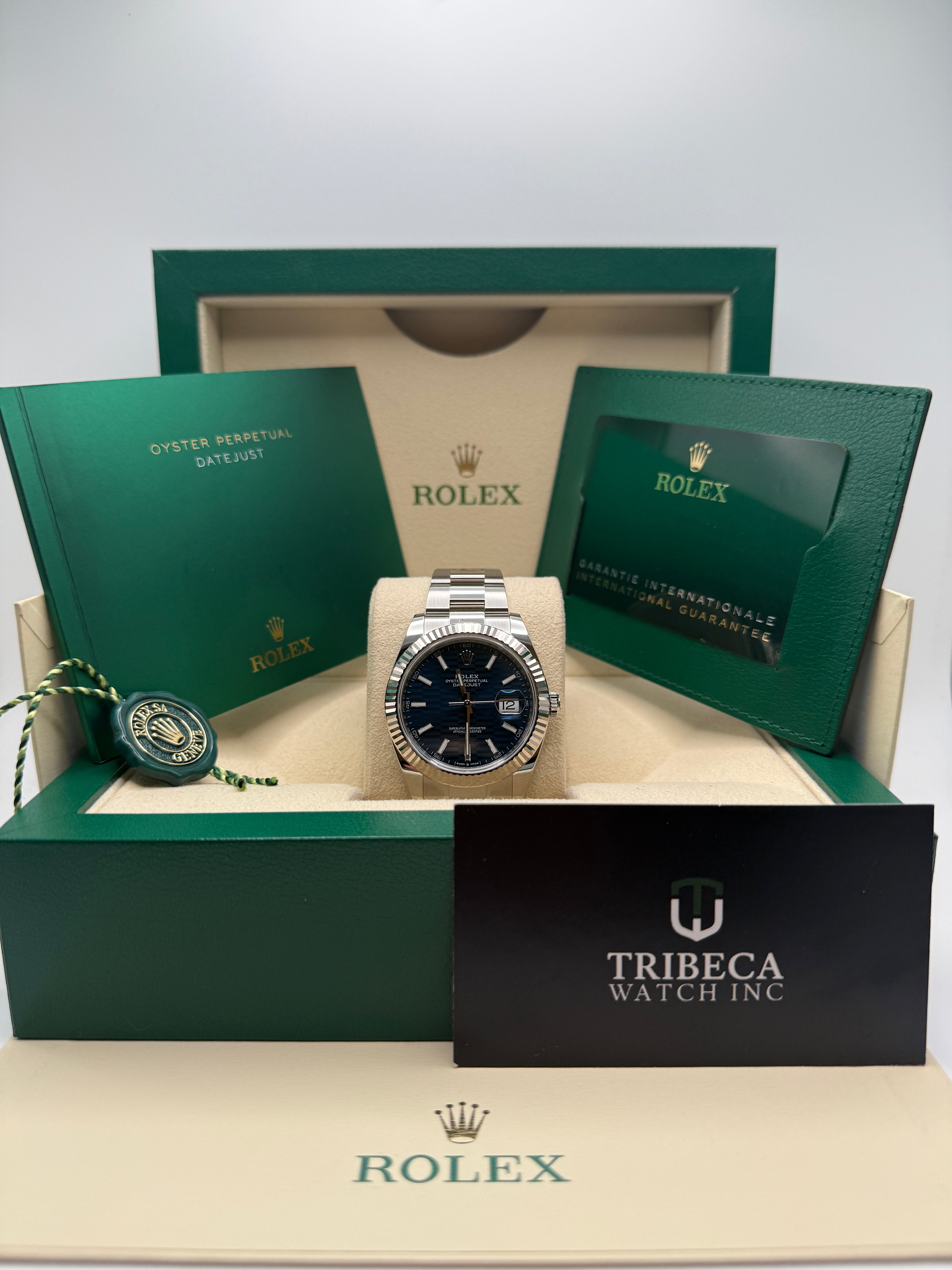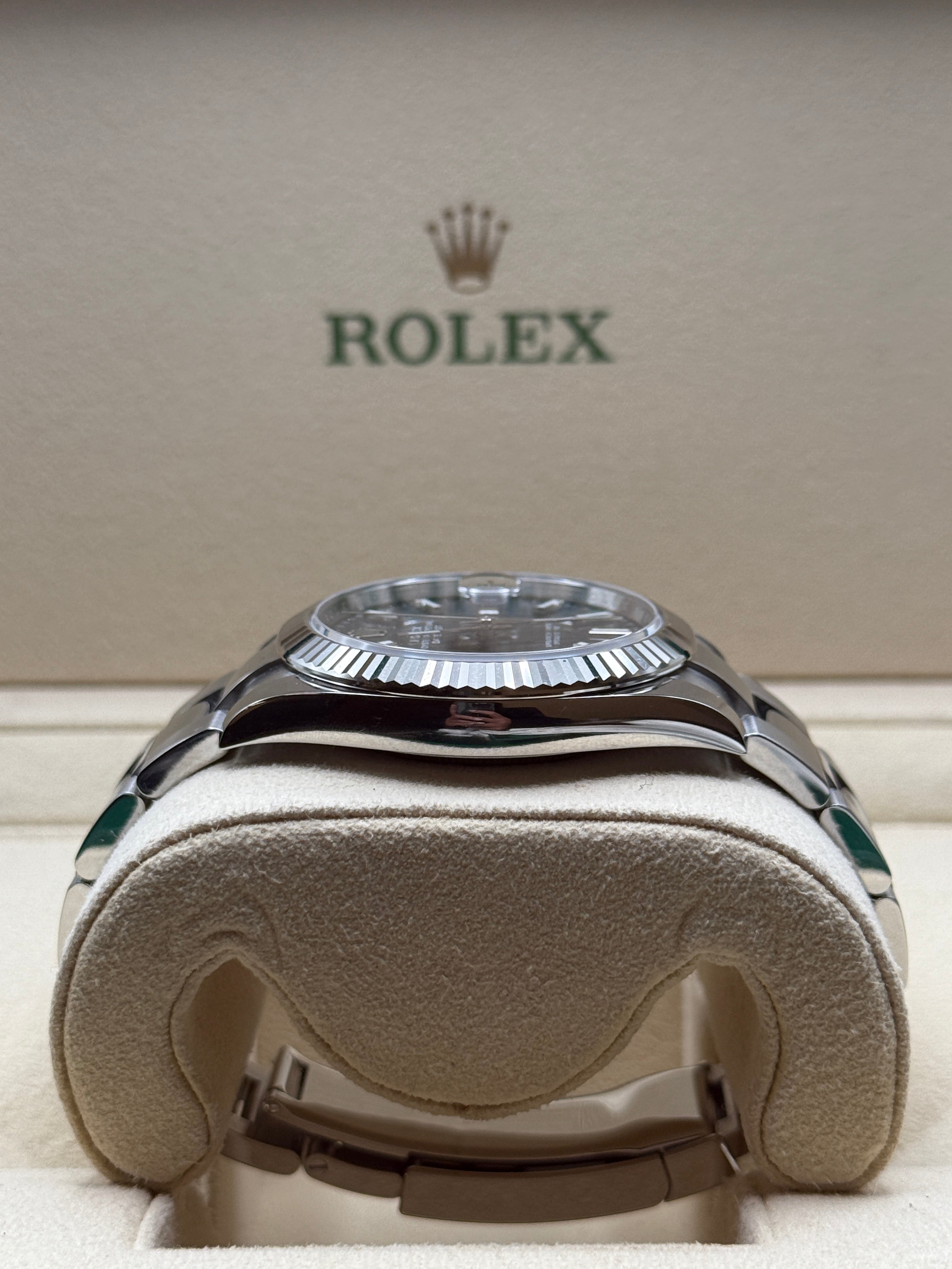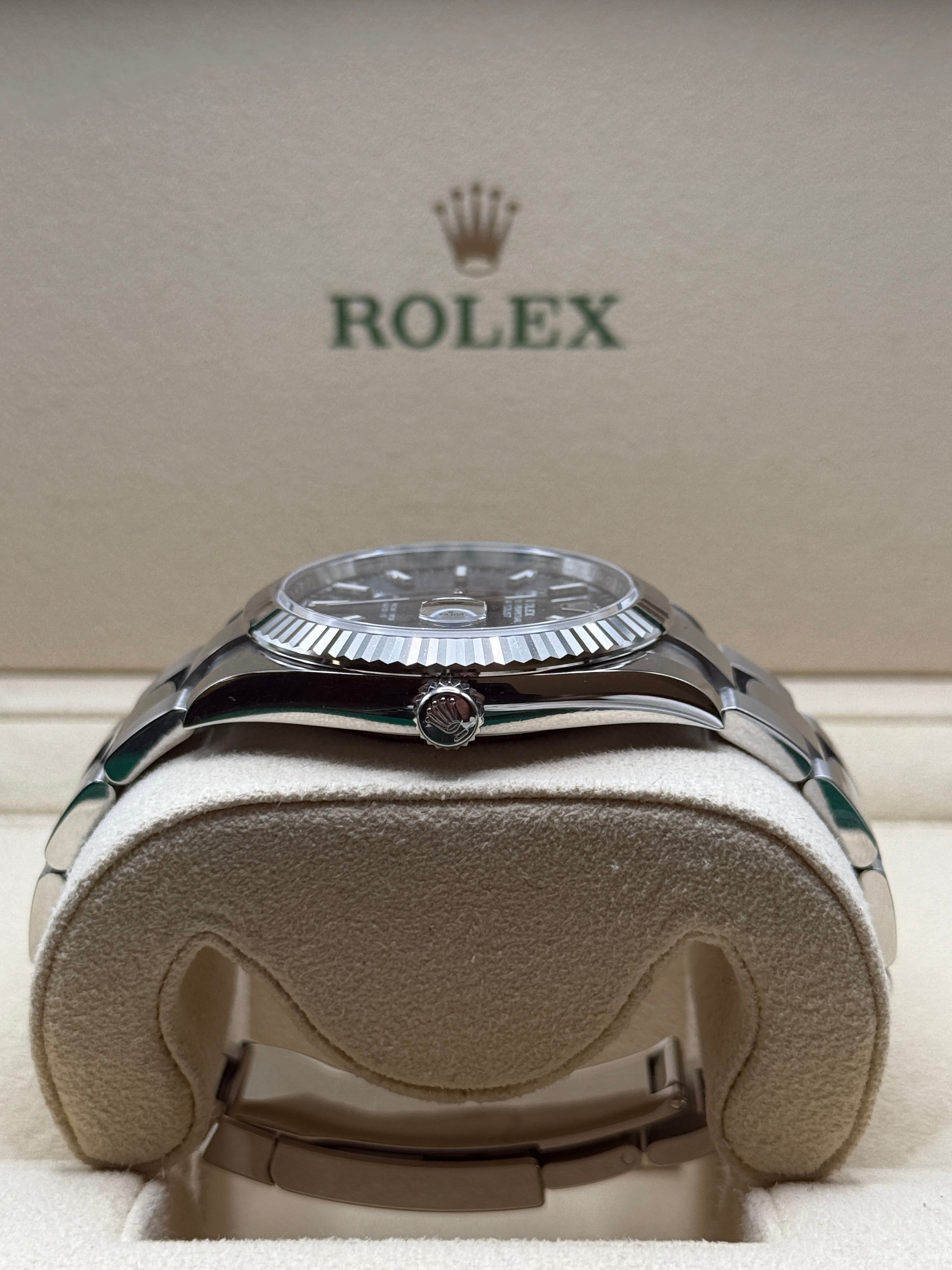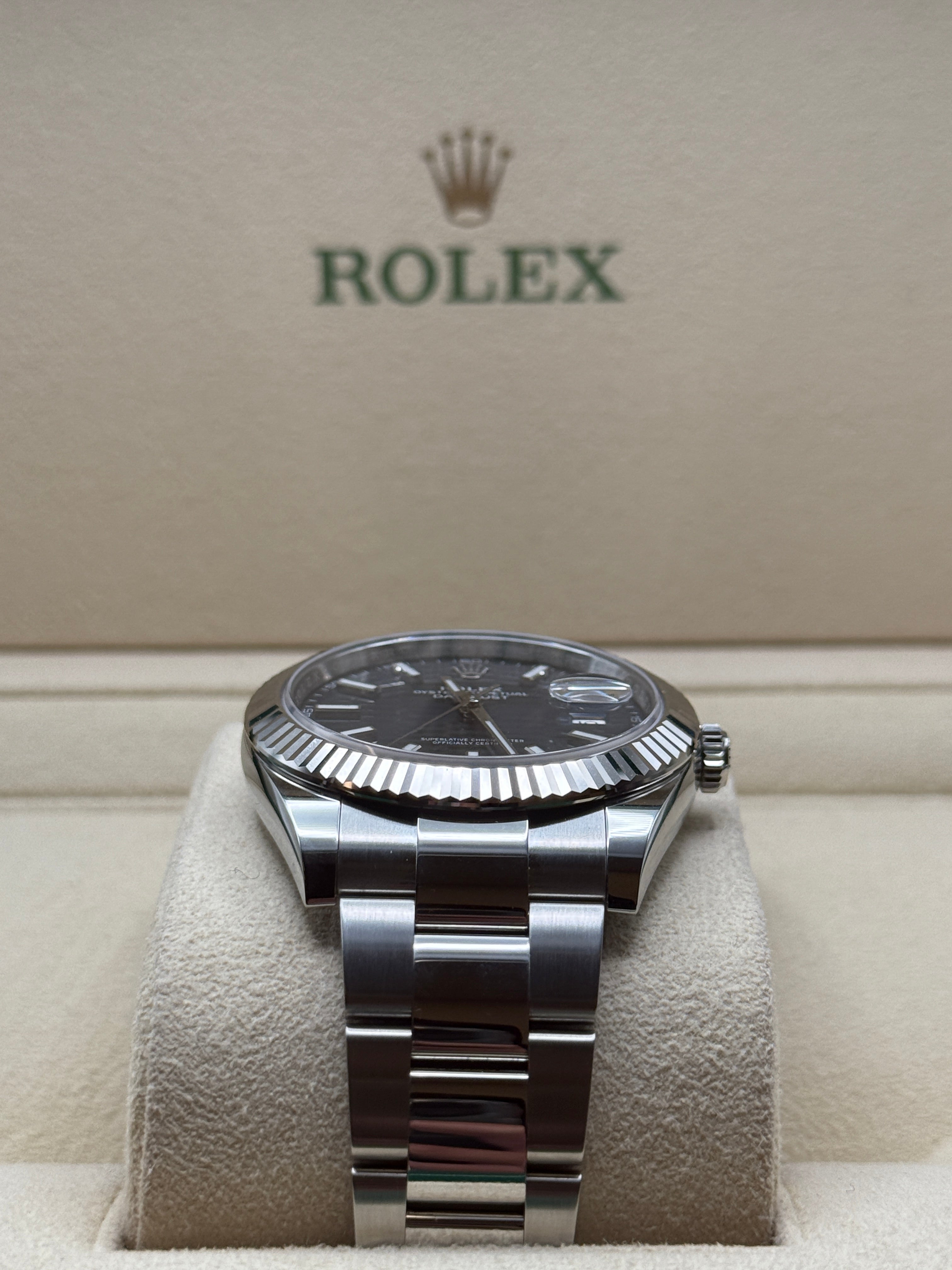 Rolex’s Datejust is the archetype of the classic watch thanks to functions and aesthetics that never go out of fashion. Launched in 1945, it was the first self-winding waterproof chronometer wristwatch to display the date in a window at 3 o’clock on the dial, and consolidated all the major innovations that Rolex had contributed to the modern wristwatch until then. The Datejust has spanned eras while retaining the enduring aesthetic characteristics that make it so instantly recognizable. A paragon of robustness and elegance, the Oyster case of the Datejust 41 is guaranteed waterproof to a depth of 100 meters (330 feet) and is equipped with calibre 3235, a movement entirely developed and manufactured by Rolex.