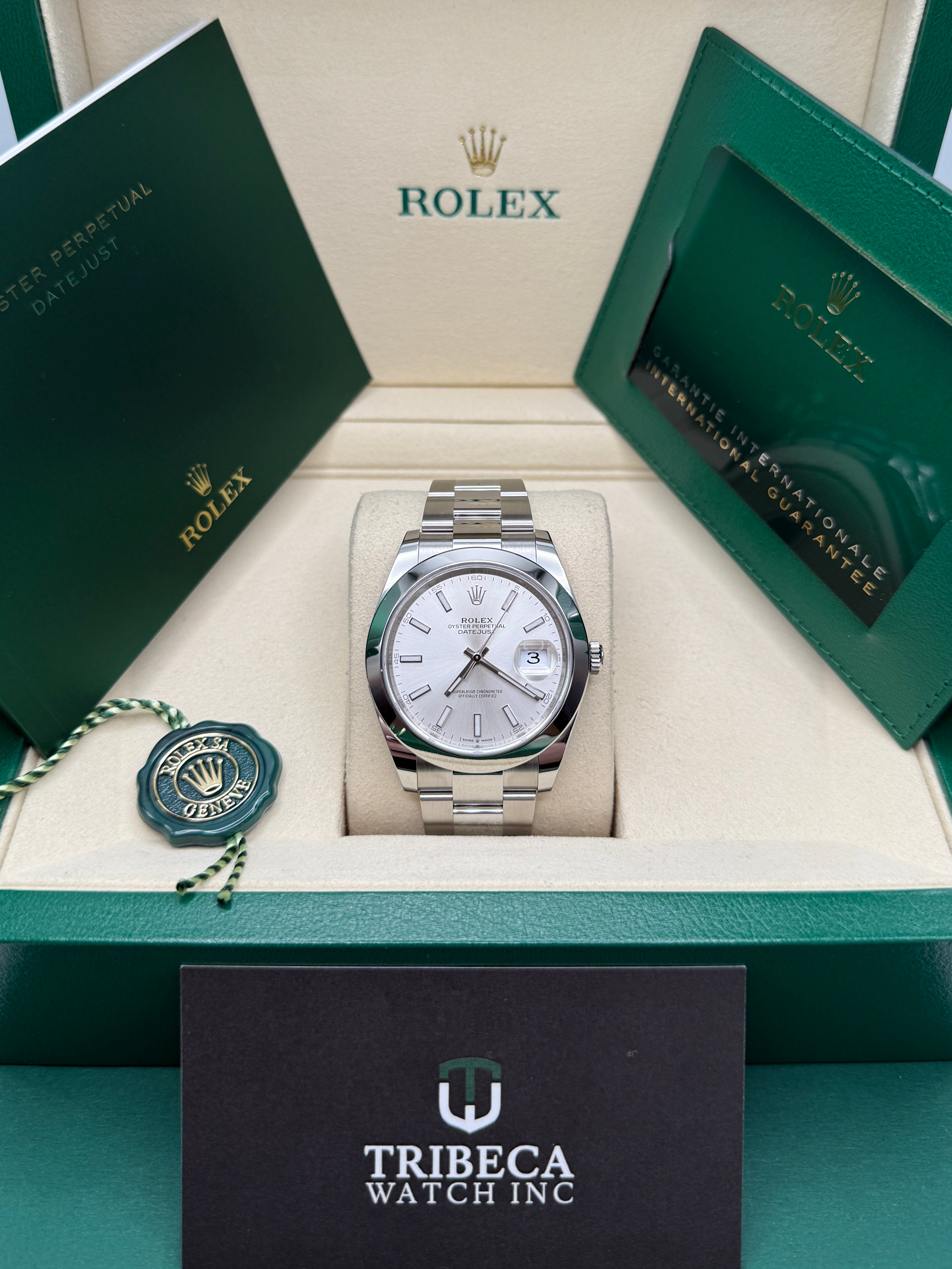 Rolex’s Datejust is the archetype of the classic watch thanks to functions and aesthetics that never go out of fashion. Launched in 1945, it was the first self-winding waterproof chronometer wristwatch to display the date in a window at 3 o’clock on the dial, and consolidated all the major innovations that Rolex had contributed to the modern wristwatch until then. The Datejust has spanned eras while retaining the enduring aesthetic characteristics that make it so instantly recognizable. A paragon of robustness and elegance, the Oyster case of the Datejust 41 is guaranteed waterproof to a depth of 100 meters (330 feet) and is equipped with calibre 3235, a movement entirely developed and manufactured by Rolex.