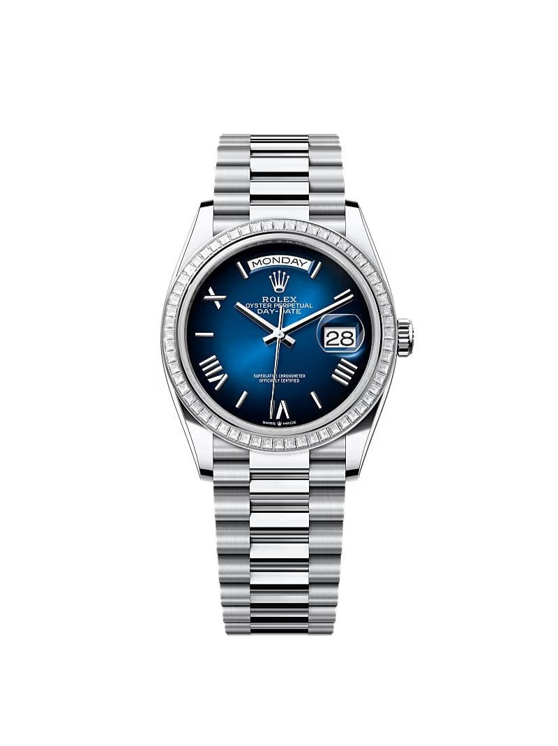 At its launch in 1956, the Day-Date was a major innovation: it was the first calendar wristwatch to indicate, in addition to the date, the day of the week spelt out in full in a window on the dial – a technical feat at the time. The Day-Date has only ever been made from precious metals –18 ct yellow, white or Everose gold, or 950 platinum. Worn by many of the world’s political figures, directors and visionaries, the Day-Date is instantly recognizable, in particular thanks to its emblematic President bracelet, whose evocative name, together with the eminent figures who have worn it, ensured the Day-Date became known as the ‘presidents’ watch’.