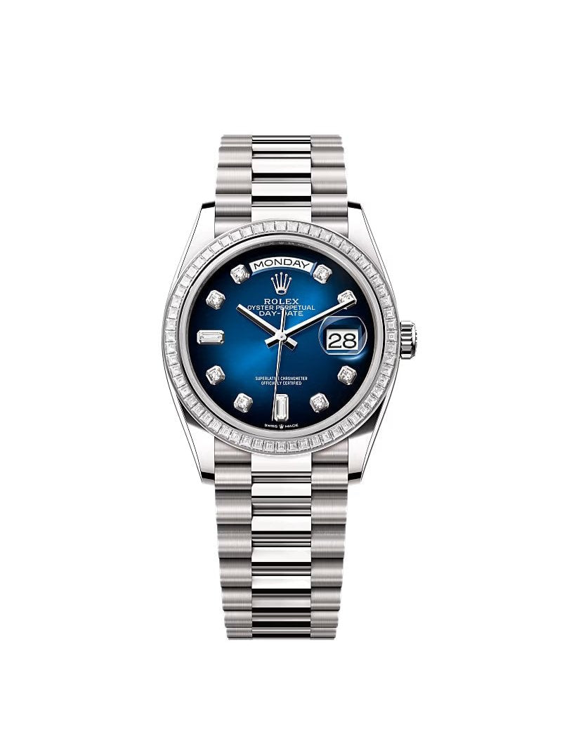 At its launch in 1956, the Day-Date was a major innovation: it was the first calendar wristwatch to indicate, in addition to the date, the day of the week spelt out in full in a window on the dial – a technical feat at the time. The Day-Date has only ever been made from precious metals –18 ct yellow, white or Everose gold, or 950 platinum. Worn by many of the world’s political figures, directors and visionaries, the Day-Date is instantly recognizable, in particular thanks to its emblematic President bracelet, whose evocative name, together with the eminent figures who have worn it, ensured the Day-Date became known as the ‘presidents’ watch’.